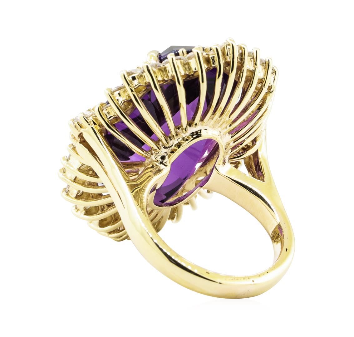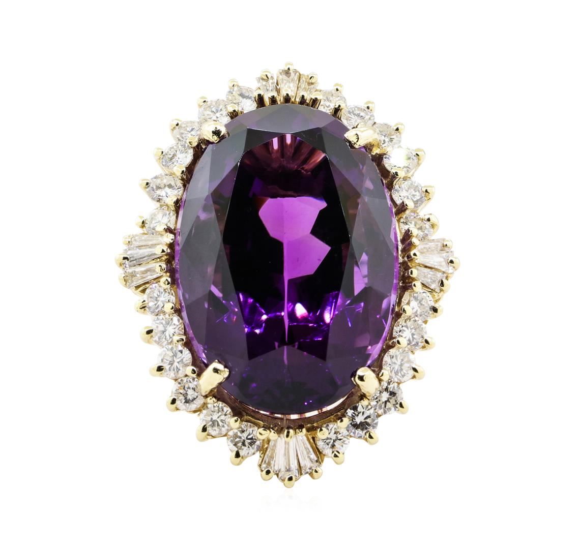 One electronically tested 10KT yellow gold lady's cast fashion ring with a basket halo with a bright polish finish. The featured lady's ring has a shank measuring 3.23 millimeters wide. Condition is new, good workmanship. Containing: One prong set oval modified brilliant cut natural amethyst, measuring 28.00 x 18.50 x 13.80mm, (depth est.) approximate weight of 40.00ct., clarity is eye clean, medium dark, moderately strong, purple color, (GIA P 6/4), cut is very good. Transmitting light with no distortion, transparent. Colored gemstones are presumed to have been subjected to commonly used enhancement processes. Graded in the setting. Twelve prong set baguette cut (tapered) diamonds, measuring from 3.40 x 1.30 x 1.11mm (depth est.) to 3.80 x 1.50 x 1.28mm (depth est.) approximate total weight of 12 Stones = 0.66ct. Graded in the setting. Color H - I Clarity VS-1 to VS-2 Cut Very Good Twenty-Four prong set round brilliant cut diamonds, measuring 3.00 - 2.90 x 1.83mm (depth est.) approximate total weight of 24 Stones = 2.34ct. Graded in the setting. Color H - I Clarity SI-1 to SI-2 Cut Very Good. Total Weight of Colored Stones 40.00ct.. Total Weight of Diamonds 3.00ct.. Total Weight of Ring 22.60gm GAS Appraised at $11275.00. GAS Appraised at $11,275.00.