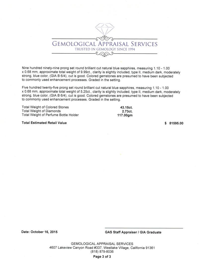 One electronically tested 18KT yellow gold combination cast & assembled fashion perfume bottle holder with a bright polish with milgrain detailing finish. Identified with markings of "750". Condition is like new, good workmanship. Containing: Eighteen prong set round brilliant cut diamonds, measuring 2.00 - 1.90 x 1.27mm (depth est.) approximate total weight of 18 Stones = 0.53ct. Graded in the setting. Clarity: VS-1 to VS-2. Color: F - G. Cut Very Good One Hundred Eighty-Four prong set round brilliant cut diamonds, measuring 1.50 - 1.40 x 0.94mm (depth est.) approximate total weight of 184 Stones = 2.20ct. Graded in the setting. Clarity: VS-1 to VS-2. Color: F - Very Good One bezel set round modified brilliant cut natural blue sapphire, measuring 7.50 - 7.45 x 4.86 mm, approximate weight of 2.20ct., clarity is slightly included, type II, dark, moderately strong, blue color, (GIA B 7/4), cut is excellent. Colored gemstones are presumed to have been subjected to commonly used enhancement processes. Graded in the setting. Two hundred ninety-four prong set round brilliant cut natural rubies, measuring 1.10 - 1.00 x 0.68 mm, approximate total weight of 2.94ct., clarity is eye clean, type II, medium dark, moderately strong, red color, (GIA R 6/4), cut is good. Colored gemstones are presumed to have been subjected to commonly used enhancement processes. Graded in the setting. One hundred seventy-nine prong set round brilliant cut natural pink sapphires, measuring 1.10 - 1.00 x 0.68 mm, approximate total weight of 1.79ct., clarity is eye clean, type II, medium, moderately strong, purple red color, (GIA PR 5/4), cut is good. Colored gemstones are presumed to have been subjected to commonly used enhancement processes. Graded in the setting. Fifty-three prong set round brilliant cut natural yellow sapphires, measuring 1.10 - 1.00 x 0.68 mm, approximate total weight of 0.53ct., clarity is eye clean, type II, medium light, moderately strong, yellow color, (GIA Y 4/4), cut is good. Colored gemstones are presumed to have been subjected to commonly used enhancement processes. Graded in the setting. Thirty-four prong set round brilliant cut natural orange sapphires, measuring 1.10 - 1.00 x 0.68 mm, approximate total weight of 0.34ct., clarity is eye clean, type II, medium, moderately strong, reddish orange color, (GIA rO 5/4), cut is good. Colored gemstones are presumed to have been subjected to commonly used enhancement processes. Graded in the setting. Thirty-three prong set round brilliant cut natural smoky quartzes, measuring 1.10 - 1.00 x 0.68 mm, approximate total weight of 0.33ct., clarity is slightly included, medium, very slightly grayish, brown color, (GIA Br 5/3), cut is good. Colored gemstones are presumed to have been subjected to commonly used enhancement processes. Graded in the setting. Two hundred sixty-one prong set round brilliant cut natural amethysts, measuring 1.10 - 1.00 x 0.68 mm, approximate total weight of 2.61ct., clarity is slightly included, type II, medium light, moderately strong, purple color, (GIA P 4/4), cut is good. Colored gemstones are presumed to have been subjected to commonly used enhancement processes. Graded in the setting. Three hundred seventy-five prong set round brilliant cut natural emeralds, measuring 1.10 - 1.00 x 0.68 mm, approximate total weight of 3.75ct., clarity is slightly included, type III, medium dark, very slightly grayish, green color, (GIA G 6/3), cut is good. Colored gemstones are presumed to have been subjected to commonly used enhancement processes. Graded in the setting. One hundred seventy-five prong set round brilliant cut natural aquamarines, measuring 1.10 - 1.00 x 0.68 mm, approximate total weight of 1.75ct., clarity is slightly included, type I, medium light, very slightly grayish, very slightly greenish blue color, (GIA vslgB 4/3), cut is good. Colored gemstones are presumed to have been subjected to commonly used enhancement processes. Graded in the setting. One hundred sixty-eight prong set round brilliant cut natural almandite garnets, measuring 1.10 - 1.00 x 0.68 mm, approximate total weight of 1.68ct., clarity is eye clean, type II, medium dark, slightly brownish, orangy red color, (GIA oR 6/2), cut is good. Colored gemstones are presumed to have been subjected to commonly used enhancement processes. Graded in the setting. Nine hundred ninety-nine bead set round cut natural blue sapphires, measuring 1.10 - 1.00 x 0.68 mm, approximate total weight of 9.99ct., clarity is slightly included, type II, medium dark, very slightly grayish, blue color, (GIA B 6/3), cut is good. Colored gemstones are presumed to have been subjected to commonly used enhancement processes. Graded in the setting. Nine hundred ninety-nine prong set round brilliant cut natural blue sapphires, measuring 1.10 - 1.00 x 0.68 mm, approximate total weight of 9.99ct., clarity is slightly included, type II, medium dark, moderately strong, blue color, (GIA B 6/4), cut is good. Colored gemstones are presumed to have been subjected to commonly used enhancement processes. Graded in the setting. Five hundred twenty-five prong set round brilliant cut natural blue sapphires, measuring 1.10 - 1.00 x 0.68 mm, approximate total weight of 5.25ct., clarity is slightly included, type II, medium dark, moderately strong, blue color, (GIA B 6/4), cut is good. Colored gemstones are presumed to have been subjected to commonly used enhancement processes. Graded in the setting. Total Weight of Colored Stones 43.15ct. Total Weight of Diamonds 2.73ct. Total Weight of Perfume Bottle Holder117.00gm. GAS Appraised at $81,595.00.