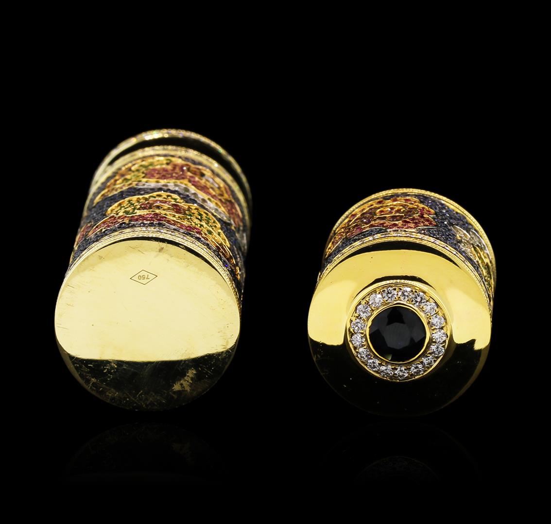 One electronically tested 18KT yellow gold combination cast & assembled fashion perfume bottle holder with a bright polish with milgrain detailing finish. Identified with markings of "750". Condition is like new, good workmanship. Containing: Eighteen prong set round brilliant cut diamonds, measuring 2.00 - 1.90 x 1.27mm (depth est.) approximate total weight of 18 Stones = 0.53ct. Graded in the setting. Clarity: VS-1 to VS-2. Color: F - G. Cut Very Good One Hundred Eighty-Four prong set round brilliant cut diamonds, measuring 1.50 - 1.40 x 0.94mm (depth est.) approximate total weight of 184 Stones = 2.20ct. Graded in the setting. Clarity: VS-1 to VS-2. Color: F - Very Good One bezel set round modified brilliant cut natural blue sapphire, measuring 7.50 - 7.45 x 4.86 mm, approximate weight of 2.20ct., clarity is slightly included, type II, dark, moderately strong, blue color, (GIA B 7/4), cut is excellent. Colored gemstones are presumed to have been subjected to commonly used enhancement processes. Graded in the setting. Two hundred ninety-four prong set round brilliant cut natural rubies, measuring 1.10 - 1.00 x 0.68 mm, approximate total weight of 2.94ct., clarity is eye clean, type II, medium dark, moderately strong, red color, (GIA R 6/4), cut is good. Colored gemstones are presumed to have been subjected to commonly used enhancement processes. Graded in the setting. One hundred seventy-nine prong set round brilliant cut natural pink sapphires, measuring 1.10 - 1.00 x 0.68 mm, approximate total weight of 1.79ct., clarity is eye clean, type II, medium, moderately strong, purple red color, (GIA PR 5/4), cut is good. Colored gemstones are presumed to have been subjected to commonly used enhancement processes. Graded in the setting. Fifty-three prong set round brilliant cut natural yellow sapphires, measuring 1.10 - 1.00 x 0.68 mm, approximate total weight of 0.53ct., clarity is eye clean, type II, medium light, moderately strong, yellow color, (GIA Y 4/4), cut is good. Colored gemstones are presumed to have been subjected to commonly used enhancement processes. Graded in the setting. Thirty-four prong set round brilliant cut natural orange sapphires, measuring 1.10 - 1.00 x 0.68 mm, approximate total weight of 0.34ct., clarity is eye clean, type II, medium, moderately strong, reddish orange color, (GIA rO 5/4), cut is good. Colored gemstones are presumed to have been subjected to commonly used enhancement processes. Graded in the setting. Thirty-three prong set round brilliant cut natural smoky quartzes, measuring 1.10 - 1.00 x 0.68 mm, approximate total weight of 0.33ct., clarity is slightly included, medium, very slightly grayish, brown color, (GIA Br 5/3), cut is good. Colored gemstones are presumed to have been subjected to commonly used enhancement processes. Graded in the setting. Two hundred sixty-one prong set round brilliant cut natural amethysts, measuring 1.10 - 1.00 x 0.68 mm, approximate total weight of 2.61ct., clarity is slightly included, type II, medium light, moderately strong, purple color, (GIA P 4/4), cut is good. Colored gemstones are presumed to have been subjected to commonly used enhancement processes. Graded in the setting. Three hundred seventy-five prong set round brilliant cut natural emeralds, measuring 1.10 - 1.00 x 0.68 mm, approximate total weight of 3.75ct., clarity is slightly included, type III, medium dark, very slightly grayish, green color, (GIA G 6/3), cut is good. Colored gemstones are presumed to have been subjected to commonly used enhancement processes. Graded in the setting. One hundred seventy-five prong set round brilliant cut natural aquamarines, measuring 1.10 - 1.00 x 0.68 mm, approximate total weight of 1.75ct., clarity is slightly included, type I, medium light, very slightly grayish, very slightly greenish blue color, (GIA vslgB 4/3), cut is good. Colored gemstones are presumed to have been subjected to commonly used enhancement processes. Graded in the setting. One hundred sixty-eight prong set round brilliant cut natural almandite garnets, measuring 1.10 - 1.00 x 0.68 mm, approximate total weight of 1.68ct., clarity is eye clean, type II, medium dark, slightly brownish, orangy red color, (GIA oR 6/2), cut is good. Colored gemstones are presumed to have been subjected to commonly used enhancement processes. Graded in the setting. Nine hundred ninety-nine bead set round cut natural blue sapphires, measuring 1.10 - 1.00 x 0.68 mm, approximate total weight of 9.99ct., clarity is slightly included, type II, medium dark, very slightly grayish, blue color, (GIA B 6/3), cut is good. Colored gemstones are presumed to have been subjected to commonly used enhancement processes. Graded in the setting. Nine hundred ninety-nine prong set round brilliant cut natural blue sapphires, measuring 1.10 - 1.00 x 0.68 mm, approximate total weight of 9.99ct., clarity is slightly included, type II, medium dark, moderately strong, blue color, (GIA B 6/4), cut is good. Colored gemstones are presumed to have been subjected to commonly used enhancement processes. Graded in the setting. Five hundred twenty-five prong set round brilliant cut natural blue sapphires, measuring 1.10 - 1.00 x 0.68 mm, approximate total weight of 5.25ct., clarity is slightly included, type II, medium dark, moderately strong, blue color, (GIA B 6/4), cut is good. Colored gemstones are presumed to have been subjected to commonly used enhancement processes. Graded in the setting. Total Weight of Colored Stones 43.15ct. Total Weight of Diamonds 2.73ct. Total Weight of Perfume Bottle Holder117.00gm. GAS Appraised at $81,595.00.