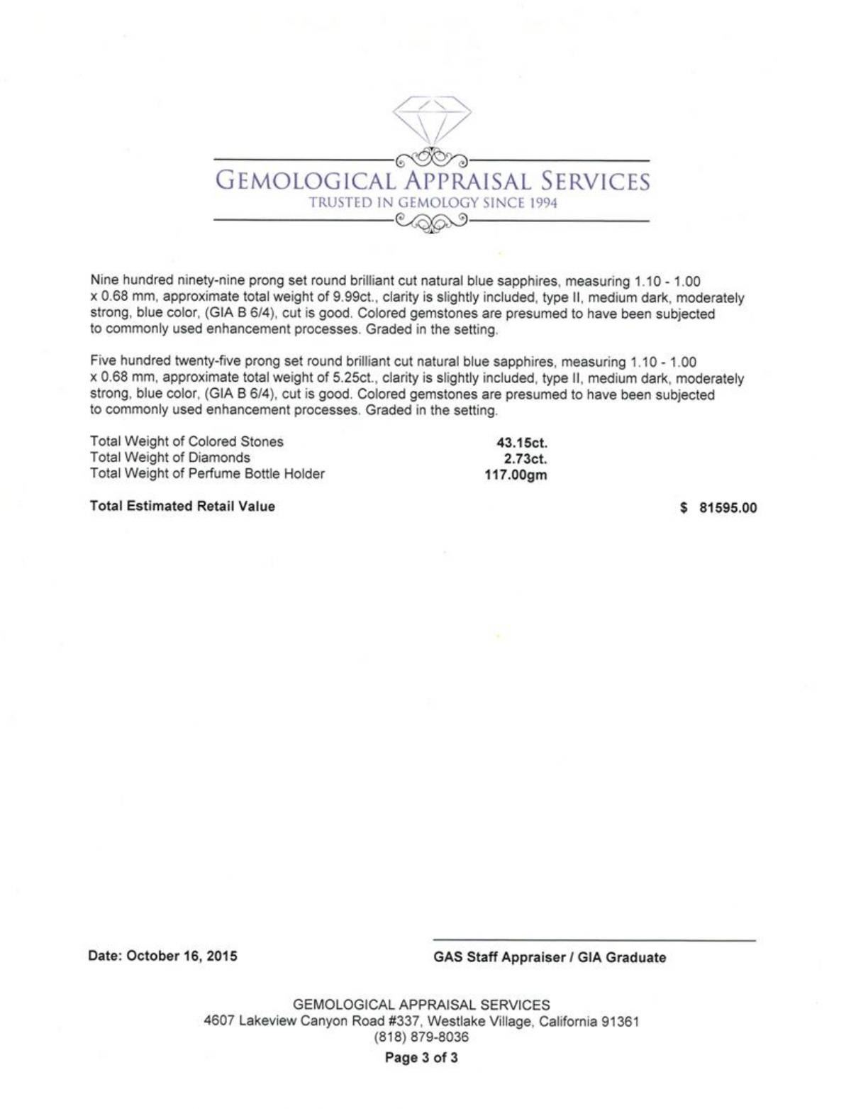 One electronically tested 18KT yellow gold combination cast & assembled fashion perfume bottle holder with a bright polish with milgrain detailing finish. Identified with markings of "750". Condition is like new, good workmanship. Containing: Eighteen prong set round brilliant cut diamonds, measuring 2.00 - 1.90 x 1.27mm (depth est.) approximate total weight of 18 Stones = 0.53ct. Graded in the setting. Clarity: VS-1 to VS-2. Color: F - G. Cut Very Good One Hundred Eighty-Four prong set round brilliant cut diamonds, measuring 1.50 - 1.40 x 0.94mm (depth est.) approximate total weight of 184 Stones = 2.20ct. Graded in the setting. Clarity: VS-1 to VS-2. Color: F - Very Good One bezel set round modified brilliant cut natural blue sapphire, measuring 7.50 - 7.45 x 4.86 mm, approximate weight of 2.20ct., clarity is slightly included, type II, dark, moderately strong, blue color, (GIA B 7/4), cut is excellent. Colored gemstones are presumed to have been subjected to commonly used enhancement processes. Graded in the setting. Two hundred ninety-four prong set round brilliant cut natural rubies, measuring 1.10 - 1.00 x 0.68 mm, approximate total weight of 2.94ct., clarity is eye clean, type II, medium dark, moderately strong, red color, (GIA R 6/4), cut is good. Colored gemstones are presumed to have been subjected to commonly used enhancement processes. Graded in the setting. One hundred seventy-nine prong set round brilliant cut natural pink sapphires, measuring 1.10 - 1.00 x 0.68 mm, approximate total weight of 1.79ct., clarity is eye clean, type II, medium, moderately strong, purple red color, (GIA PR 5/4), cut is good. Colored gemstones are presumed to have been subjected to commonly used enhancement processes. Graded in the setting. Fifty-three prong set round brilliant cut natural yellow sapphires, measuring 1.10 - 1.00 x 0.68 mm, approximate total weight of 0.53ct., clarity is eye clean, type II, medium light, moderately strong, yellow color, (GIA Y 4/4), cut is good. Colored gemstones are presumed to have been subjected to commonly used enhancement processes. Graded in the setting. Thirty-four prong set round brilliant cut natural orange sapphires, measuring 1.10 - 1.00 x 0.68 mm, approximate total weight of 0.34ct., clarity is eye clean, type II, medium, moderately strong, reddish orange color, (GIA rO 5/4), cut is good. Colored gemstones are presumed to have been subjected to commonly used enhancement processes. Graded in the setting. Thirty-three prong set round brilliant cut natural smoky quartzes, measuring 1.10 - 1.00 x 0.68 mm, approximate total weight of 0.33ct., clarity is slightly included, medium, very slightly grayish, brown color, (GIA Br 5/3), cut is good. Colored gemstones are presumed to have been subjected to commonly used enhancement processes. Graded in the setting. Two hundred sixty-one prong set round brilliant cut natural amethysts, measuring 1.10 - 1.00 x 0.68 mm, approximate total weight of 2.61ct., clarity is slightly included, type II, medium light, moderately strong, purple color, (GIA P 4/4), cut is good. Colored gemstones are presumed to have been subjected to commonly used enhancement processes. Graded in the setting. Three hundred seventy-five prong set round brilliant cut natural emeralds, measuring 1.10 - 1.00 x 0.68 mm, approximate total weight of 3.75ct., clarity is slightly included, type III, medium dark, very slightly grayish, green color, (GIA G 6/3), cut is good. Colored gemstones are presumed to have been subjected to commonly used enhancement processes. Graded in the setting. One hundred seventy-five prong set round brilliant cut natural aquamarines, measuring 1.10 - 1.00 x 0.68 mm, approximate total weight of 1.75ct., clarity is slightly included, type I, medium light, very slightly grayish, very slightly greenish blue color, (GIA vslgB 4/3), cut is good. Colored gemstones are presumed to have been subjected to commonly used enhancement processes. Graded in the setting. One hundred sixty-eight prong set round brilliant cut natural almandite garnets, measuring 1.10 - 1.00 x 0.68 mm, approximate total weight of 1.68ct., clarity is eye clean, type II, medium dark, slightly brownish, orangy red color, (GIA oR 6/2), cut is good. Colored gemstones are presumed to have been subjected to commonly used enhancement processes. Graded in the setting. Nine hundred ninety-nine bead set round cut natural blue sapphires, measuring 1.10 - 1.00 x 0.68 mm, approximate total weight of 9.99ct., clarity is slightly included, type II, medium dark, very slightly grayish, blue color, (GIA B 6/3), cut is good. Colored gemstones are presumed to have been subjected to commonly used enhancement processes. Graded in the setting. Nine hundred ninety-nine prong set round brilliant cut natural blue sapphires, measuring 1.10 - 1.00 x 0.68 mm, approximate total weight of 9.99ct., clarity is slightly included, type II, medium dark, moderately strong, blue color, (GIA B 6/4), cut is good. Colored gemstones are presumed to have been subjected to commonly used enhancement processes. Graded in the setting. Five hundred twenty-five prong set round brilliant cut natural blue sapphires, measuring 1.10 - 1.00 x 0.68 mm, approximate total weight of 5.25ct., clarity is slightly included, type II, medium dark, moderately strong, blue color, (GIA B 6/4), cut is good. Colored gemstones are presumed to have been subjected to commonly used enhancement processes. Graded in the setting. Total Weight of Colored Stones 43.15ct. Total Weight of Diamonds 2.73ct. Total Weight of Perfume Bottle Holder117.00gm. GAS Appraised.