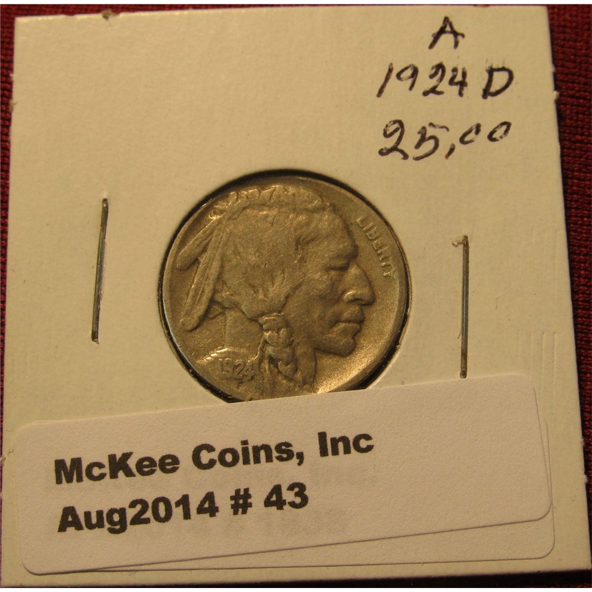 43. 1924 D Buffalo Nickel. F-12. Rare Date. Red Book value $30.00.