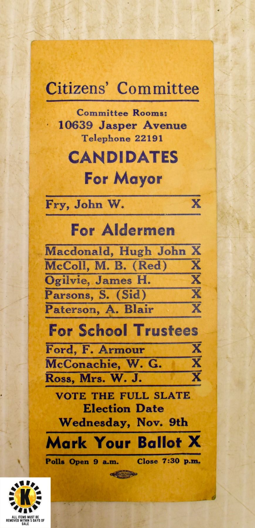 1930’S EDMONTON MAYORAL VOTING BALLOT