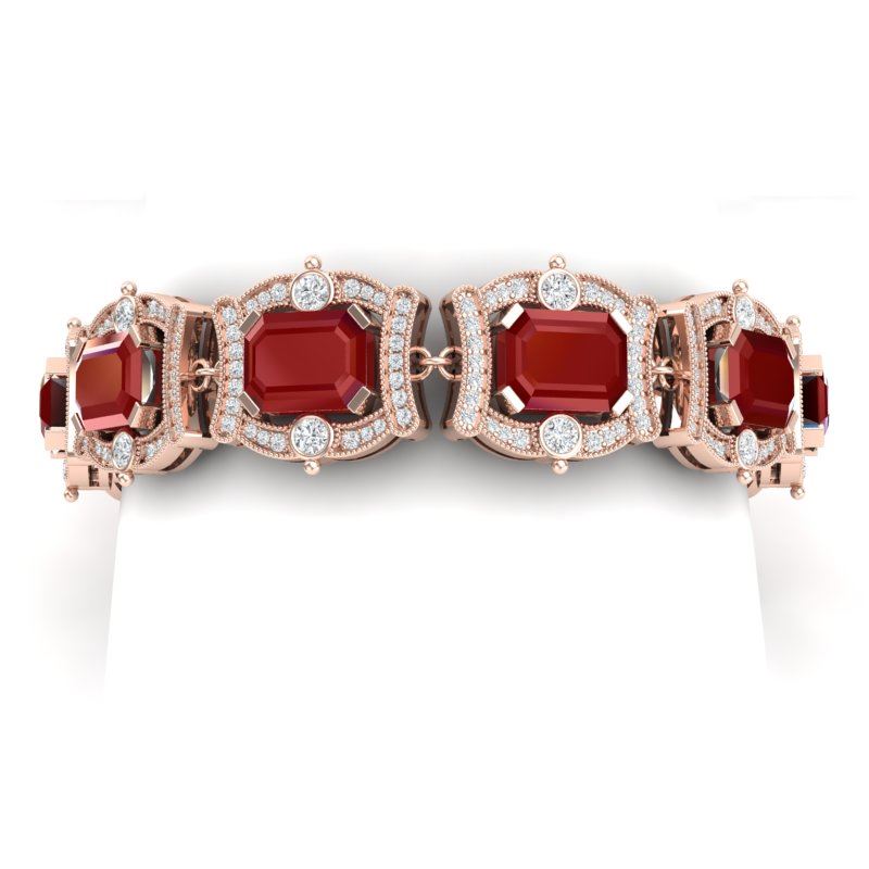 43.87 CTW Royalty Ruby & VS Diamond Bracelet 18K Rose Gold ---- Luxury Designer Brand Bracelet Appraised Retail Price at $73,600 ---- SKU Number US38779 18K Rose gold Bracelet Size is 7 Inches, Can custom fit length, Bracelet measuring approx. 3/4 x 7 Inches, weighing in total approx. 39 grams. Made in the USA and is stamped 18K, Main stone 38.83 carat total weight containing 11 pieces of Intense Mid-Opaque Red color with AAA quality Emerald Cut shape cut Ruby , Stone #2 5.04 carat total weight containing 308 pieces of G-H color with VS/SI quality Round shape cut