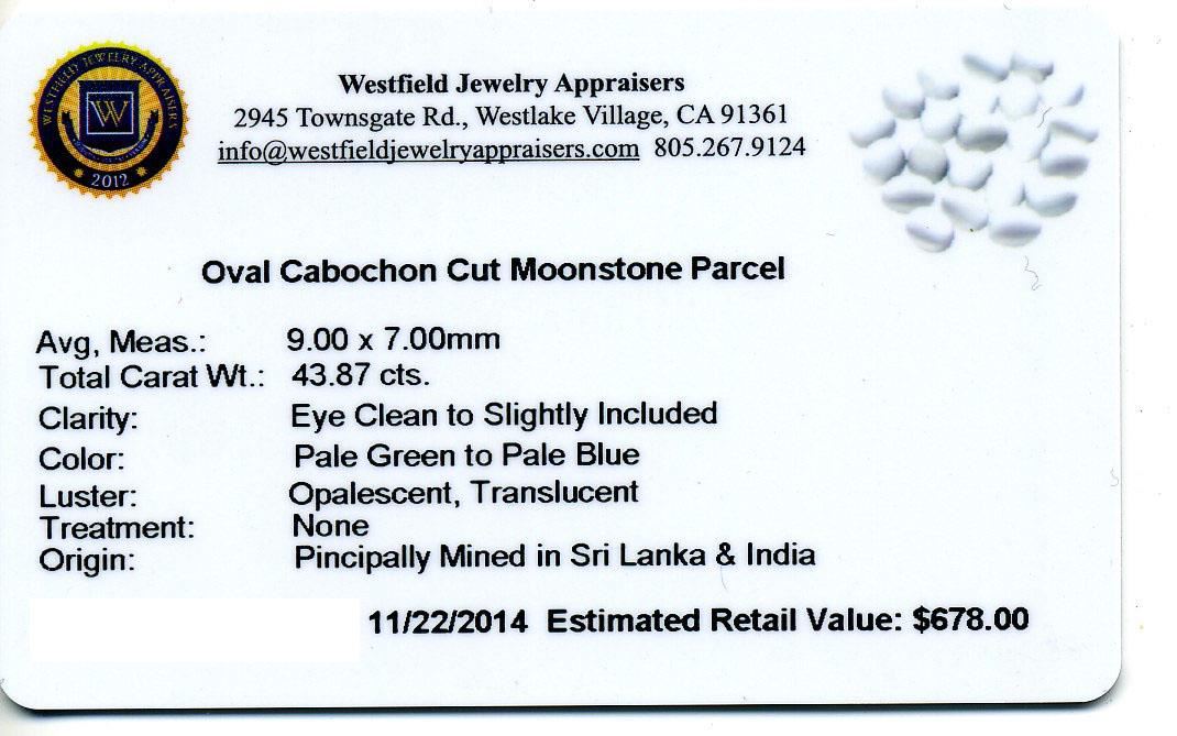 43.87ctw. Oval Cabochon Cut Moonstone Parcel. Westfield Appraised at $678.00.