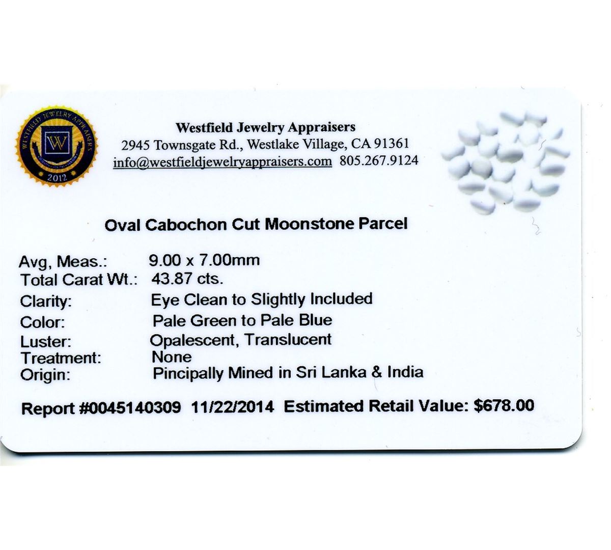 43.87ctw. Oval Cabochon Cut Moonstone Parcel. Westfield Appraised at $678.00.