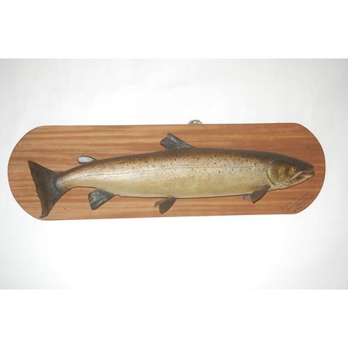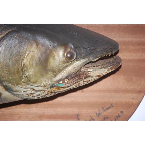 43" ATLANTIC SALMON TROPHY MOUNT - TROPHY SALMON MOUNTED ON OVAL BOARD & DISPLAYED W/ STREAMER FLY- MARKED DOLORES WETTACH WILLIAMS (TED'S 3RD WIFE) 33 LBS. 2 OZ., SEPT. 15, 1969 - SOILING, FIN DAMAGE, WEAR & IMPERFECTIONS