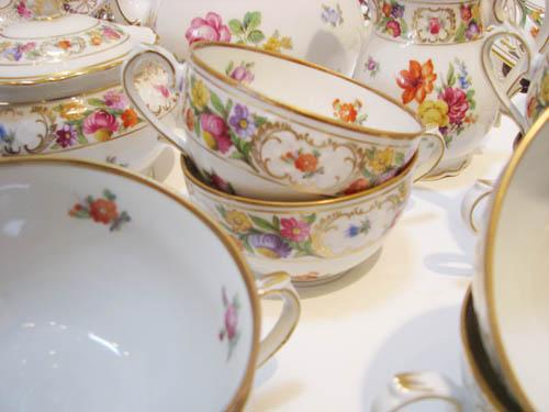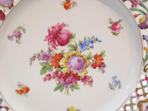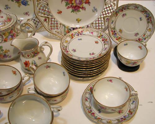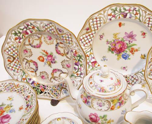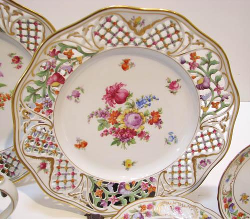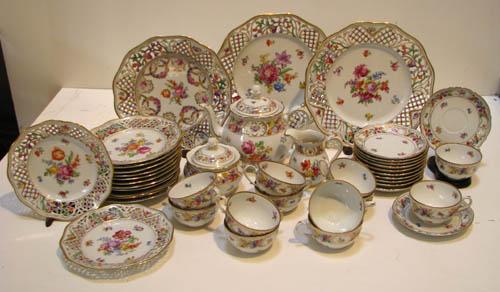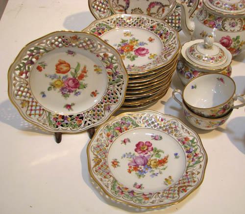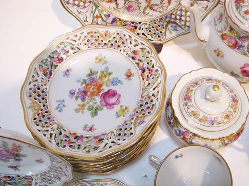 Title: Dessert Set including, 13 dessert Plates, 12 Saucers, 12 Cups, sugar, creamer, Teapot, 3 reticulated pierced cake plates