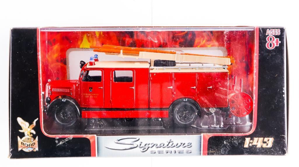 43014GN Yatming Road Signature- 1941 Magirus-Deutz S 3000 SLG Fire Engine Fcciwilligc Fcuerweht Mainleus. 1:43 scale diecast collectible model car. ThisÊ1941ÊMagirus-Deutz S 3000 SLG Fire truck is a 6.5"L x 1.75"W x 2.5"H diecast metal car, free wheels,Êwith old fashioned ladders. It sits on a display plaque. Manufactured by Yat Ming.Ê43014 is RED in color. Individually packed in a hard-plastic case. CaseÊsizeÊis 8"L x 4"W x 3.75"H.