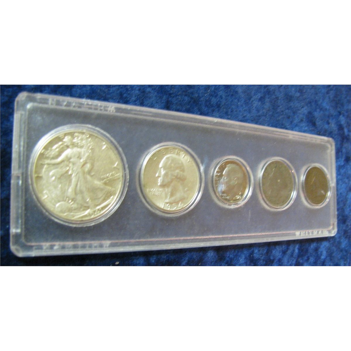 431. Five-Piece Type Set in snap-tight case. Includes Walking Liberty Half Dollar, Silver Washington Quarter, Proof Roosevelt Dime, Liberty Nickel, and Indian Cent.