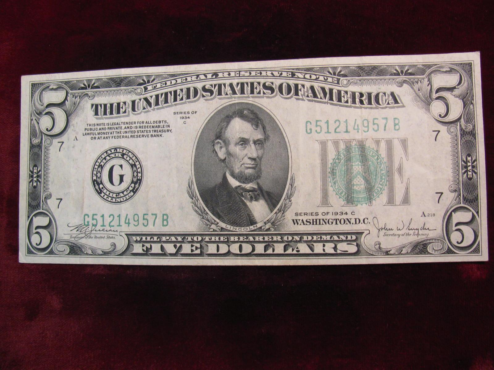 432. Series Of 1934 C $5 Federal Reserve Note. VF. "G" Chicago.