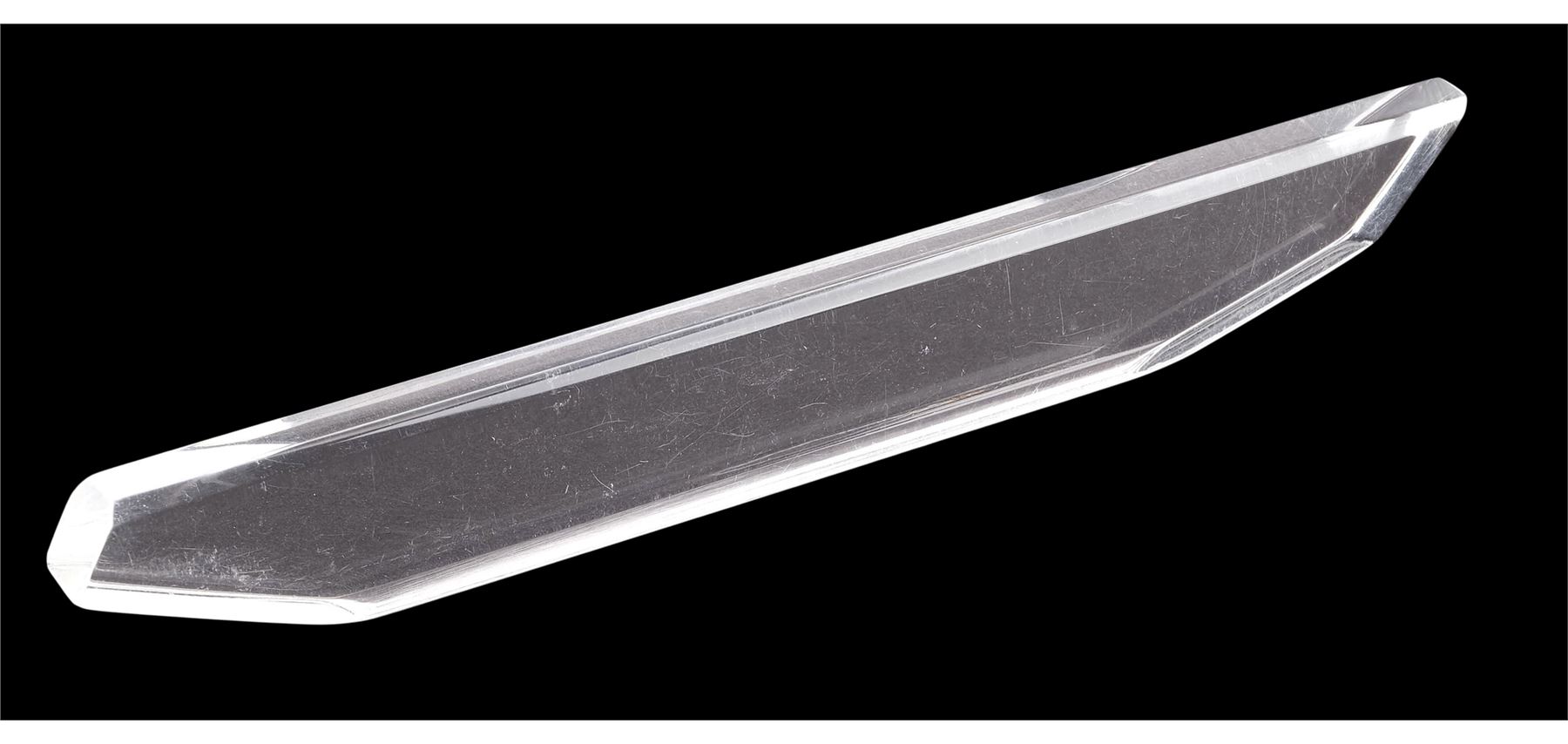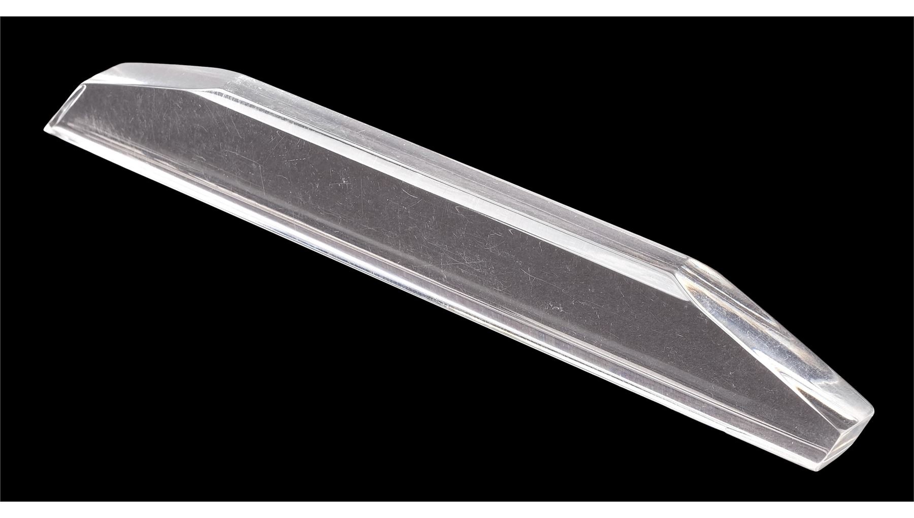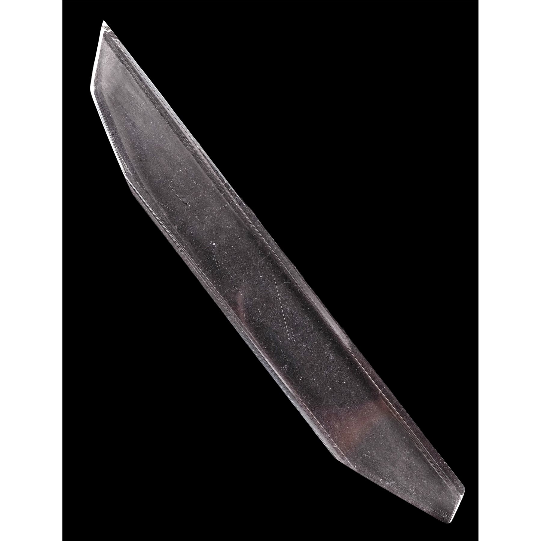 This shard is made of clear, multifaceted resin and features a unique, crystalline shape with pointed ends. The points are dulled and the resin exhibits minor scratches throughout from use and handling. Dimensions: 7" x 1" x 0.5" (18 cm x 2.5 cm x 1 cm)