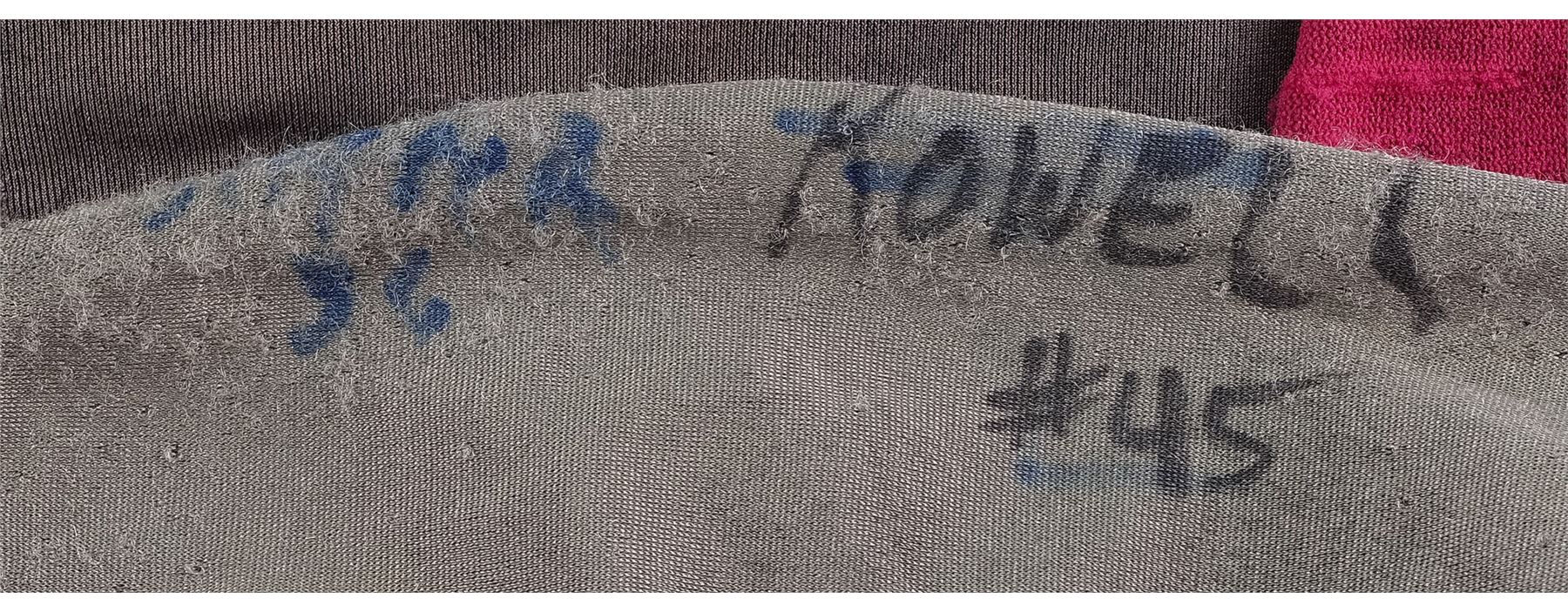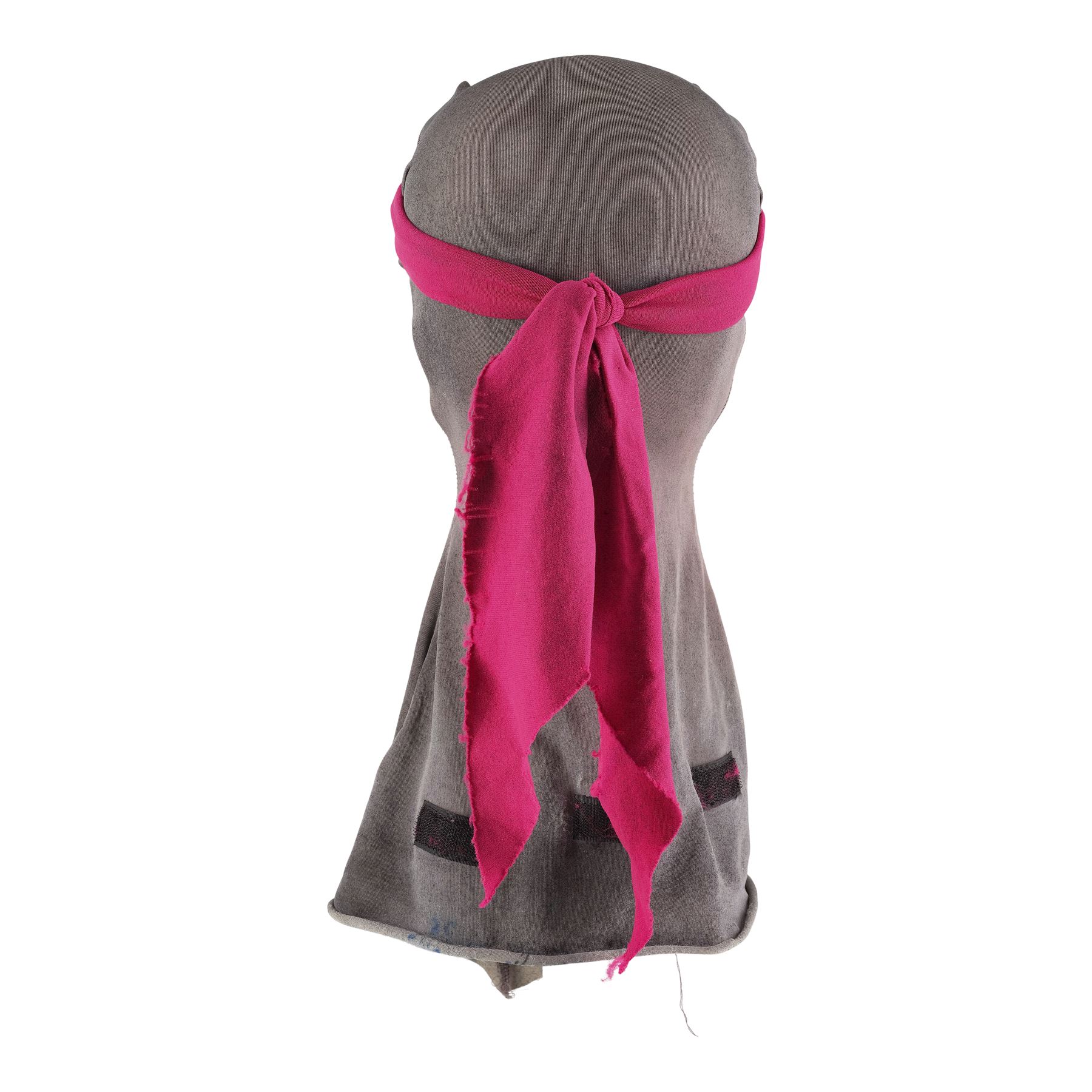 As with its predecessor, this sequel took inspiration from both the original Kevin Eastman and Peter Laird comic books as well as the extremely popular 1987 television cartoon. The groundbreaking creature effects for both of the first two Ninja Turtles films were created by Jim Henson's creature shop, with this film being dedicated to the late Henson. Originally obtained from someone who worked on the film, this mask is made of a black Spandex-blend material with painted mesh guards over the eyes, metal rivet breathing holes over the mouth, and a red bandana embroidered with the kanji Oni. The neck is line with fastening strips, and the interior is hand-marked with an illegible name and the number "36" in blue and "Kowell #45" in black. The mask exhibits fading to its black fabric, some paint loss on the eye covers and loosening to the mouth rivets, and remnants of red material on the fastening strips.