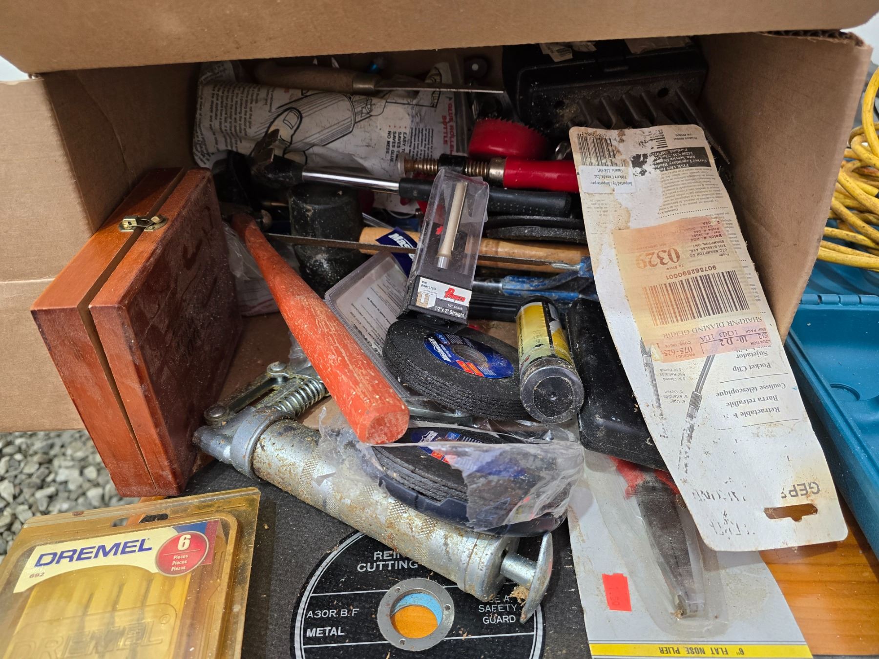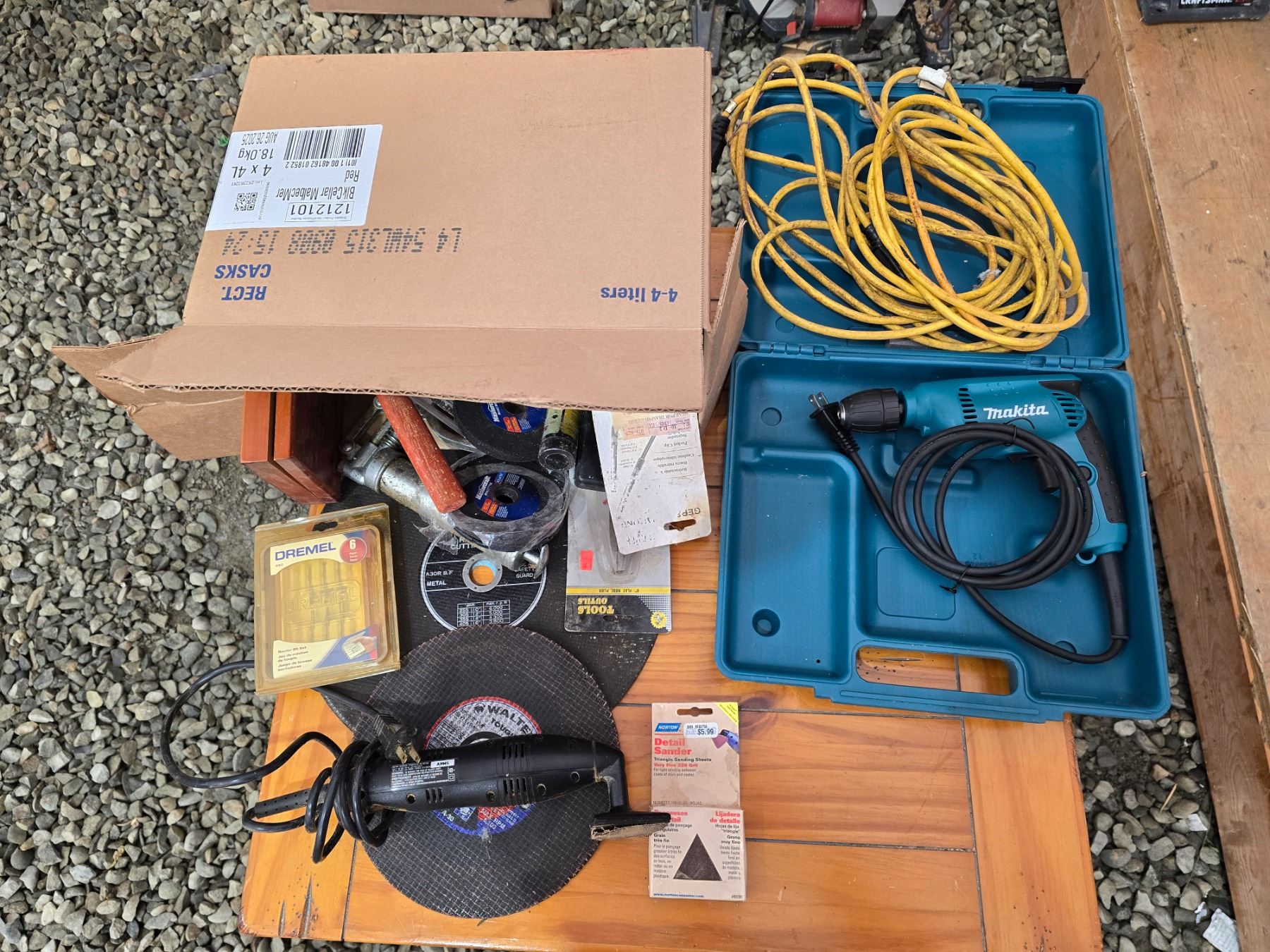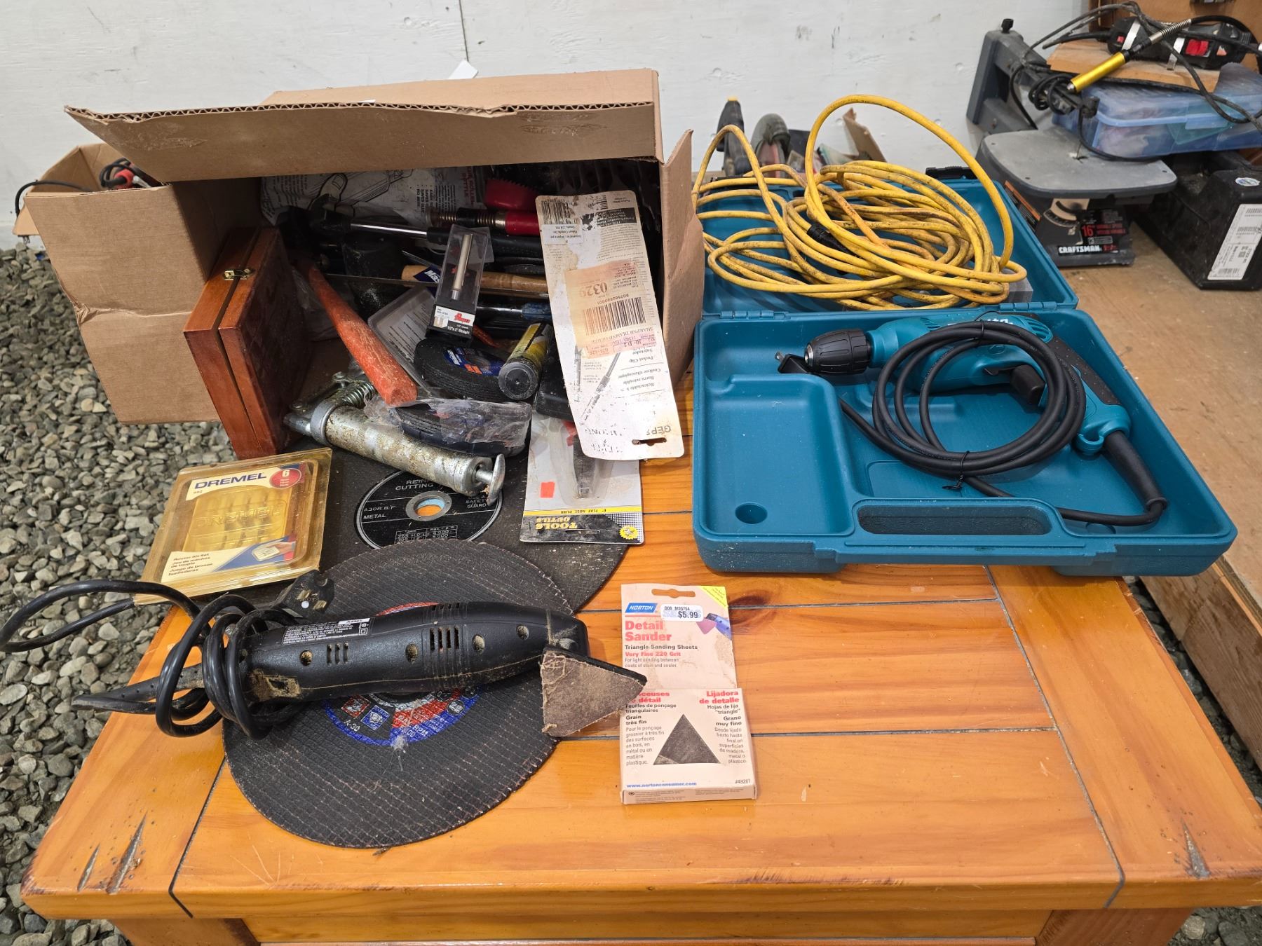 MAKITA DRILL, EXTENSION CORD AND BOX OF RANDOM TOOLS