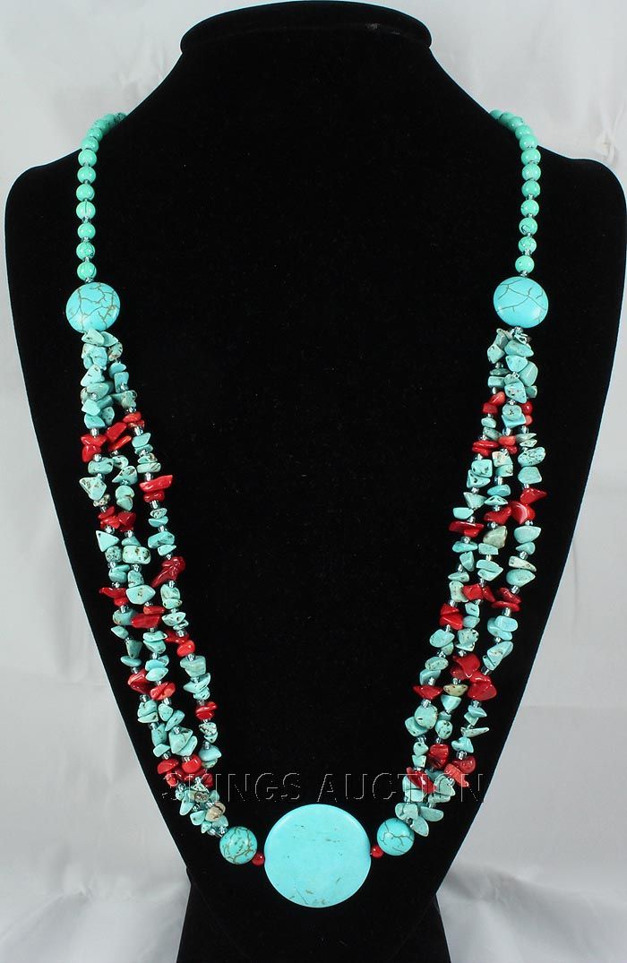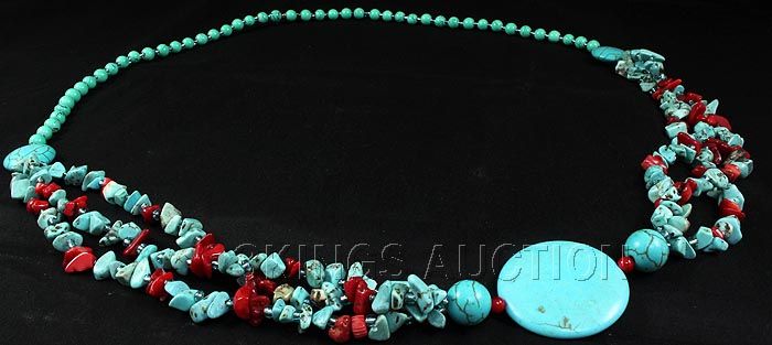 437.96CTW TURQUOISE & RED CORALS STATEMENT NECKLACE **|**|** 32 INCHES 3ROW DESIGN CHUNKY TURQUOISE & RED CORALS STATEMENT NECKLACE; CENTER SIZE: 35X8MM ; MSRP: $300