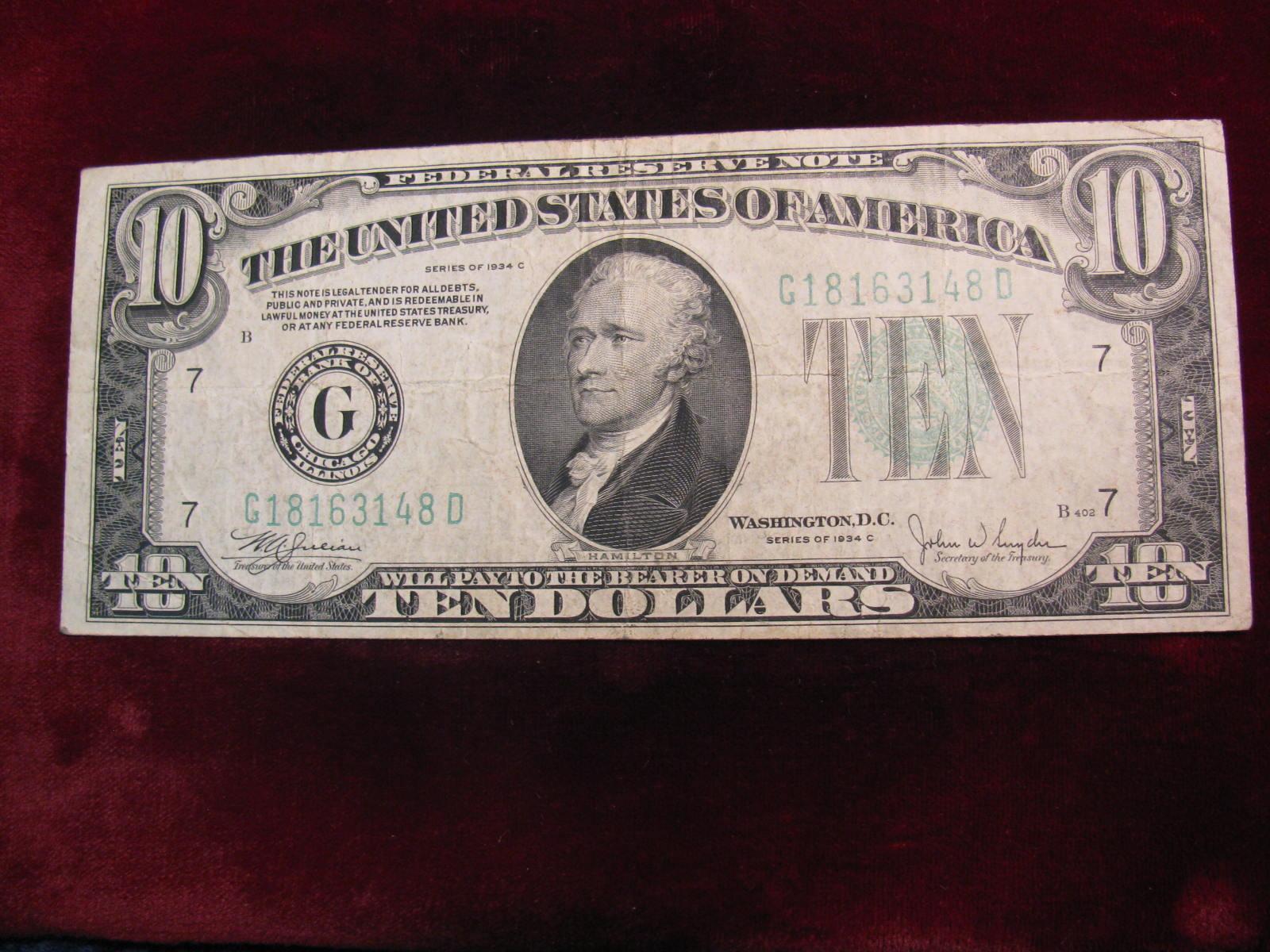 437. Series Of 1934C $10 Federal Reserve Note. F. "G" Chicago.