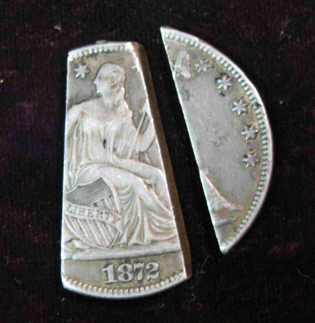 439. 1872 U.S. Seated Liberty Half or should I say 2/3 of a half. Years ago this piece appears to have been cut in thirds to use as small change. Only 2/3 of it remains, the center piece appears to had a loop attached to the top at one time. VF condition? If it can be graded.