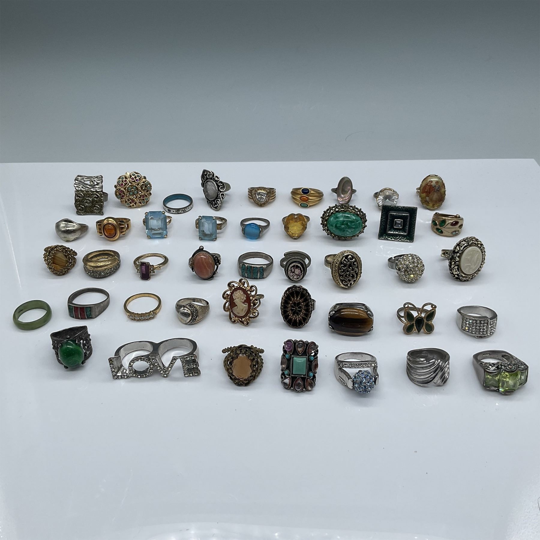A collection of 43 vintage rings in mixed styles, showcasing a variety of designs, materials, and accents. This assortment includes ornate, minimalist, and artistic styles, with approximate sizes ranging from 6 to 9. An excellent opportunity for collectors or resellers looking for a diverse selection of unique and eye-catching pieces.