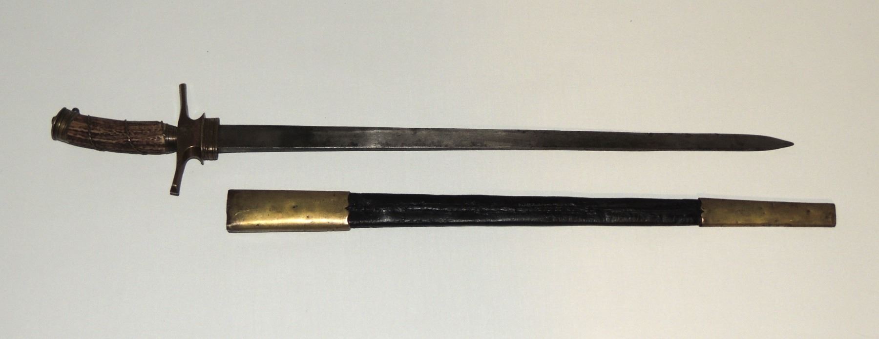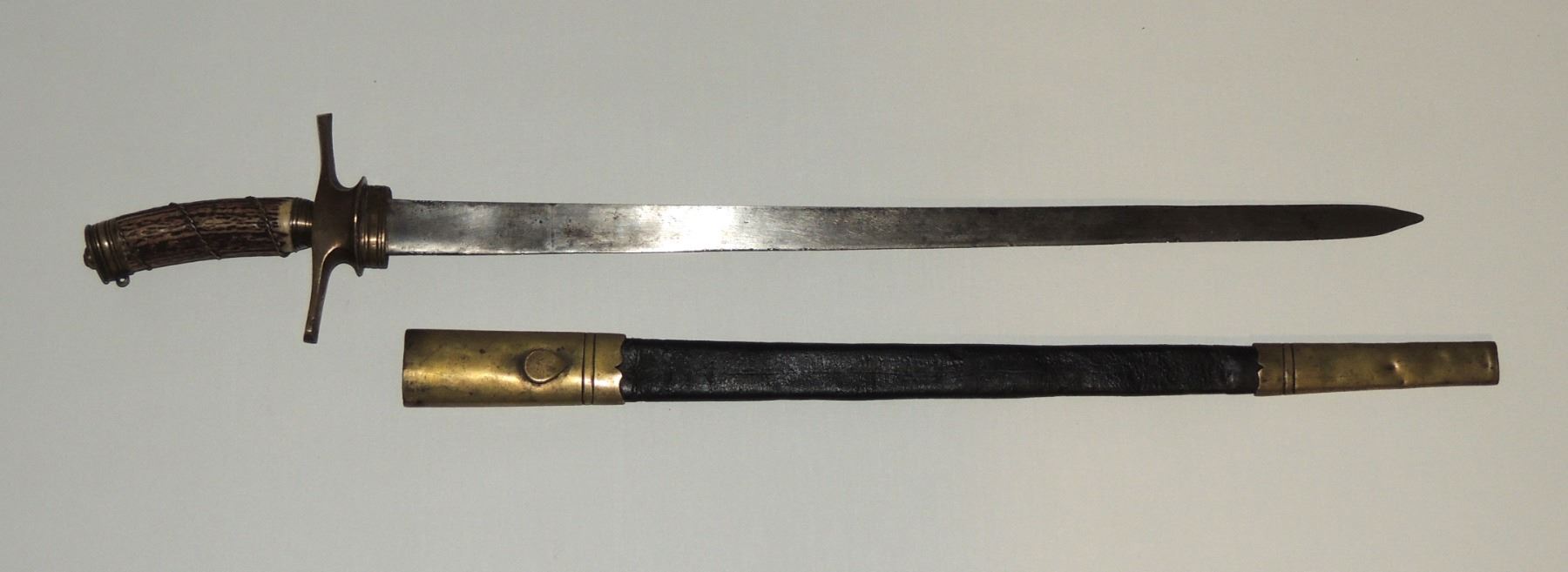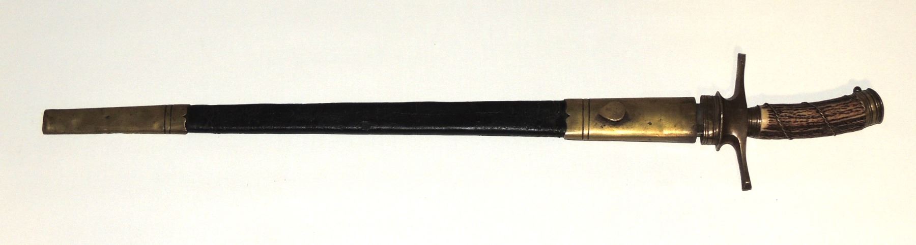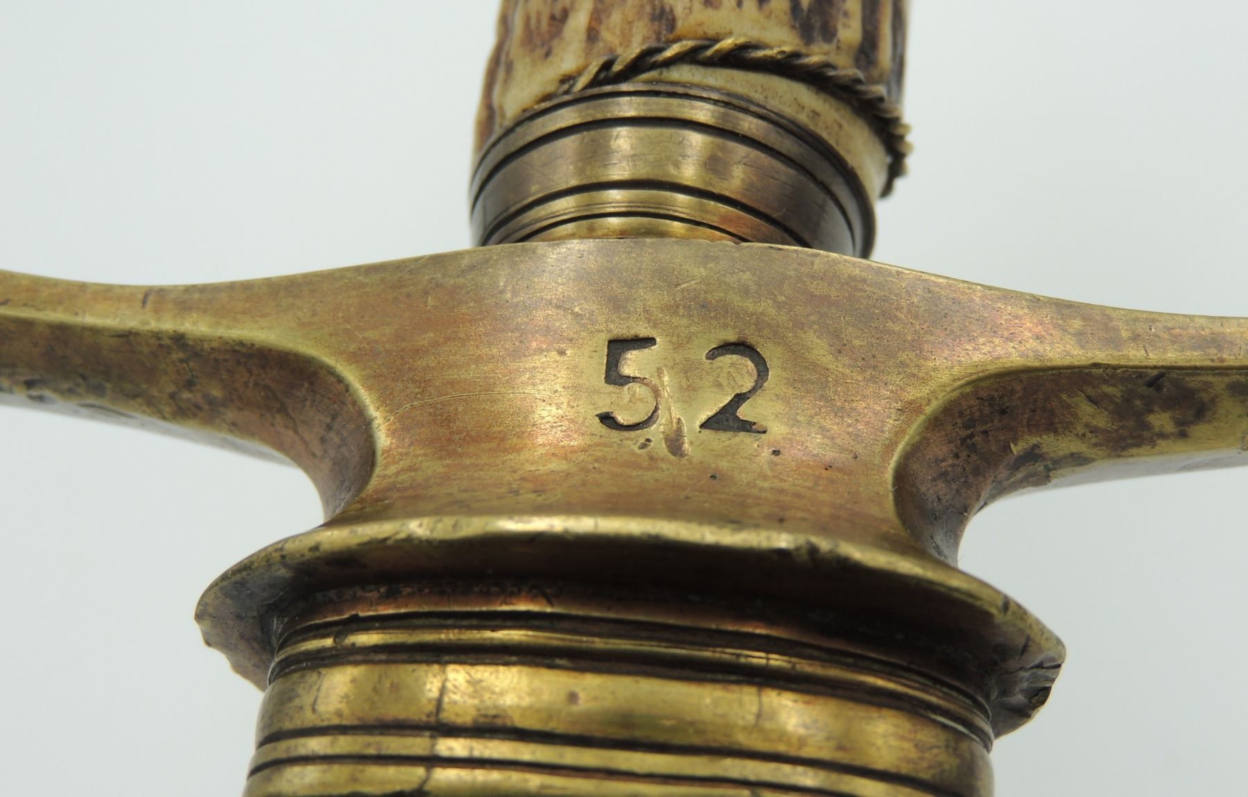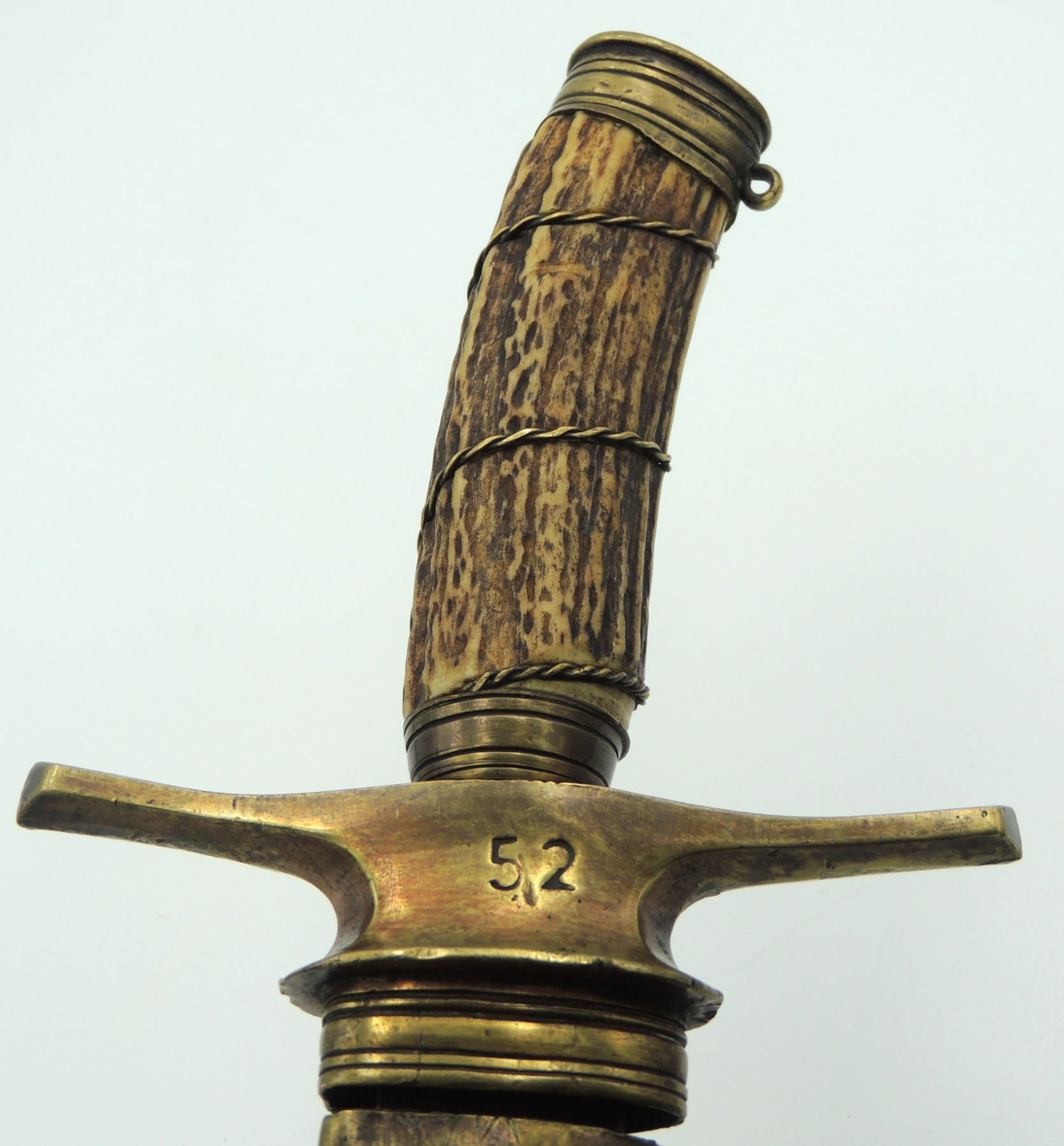 Mid/Late 1800's German Cutlass with Leather and Medal Scabbard. Includes Stag Handle with Wire Wrapping. Marked "52" on one side of handle. Measures 26 Inches in Scabbard. 25 Inches total with a 19.5 Inch Blade. 1800's German Blade/