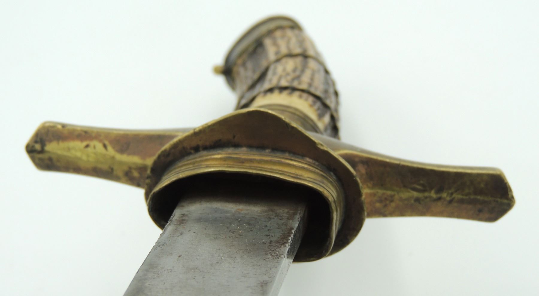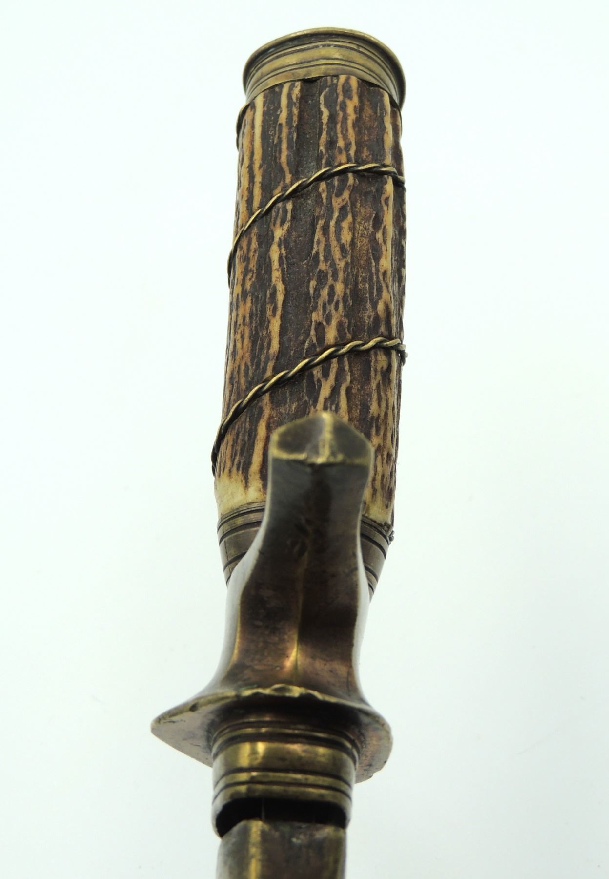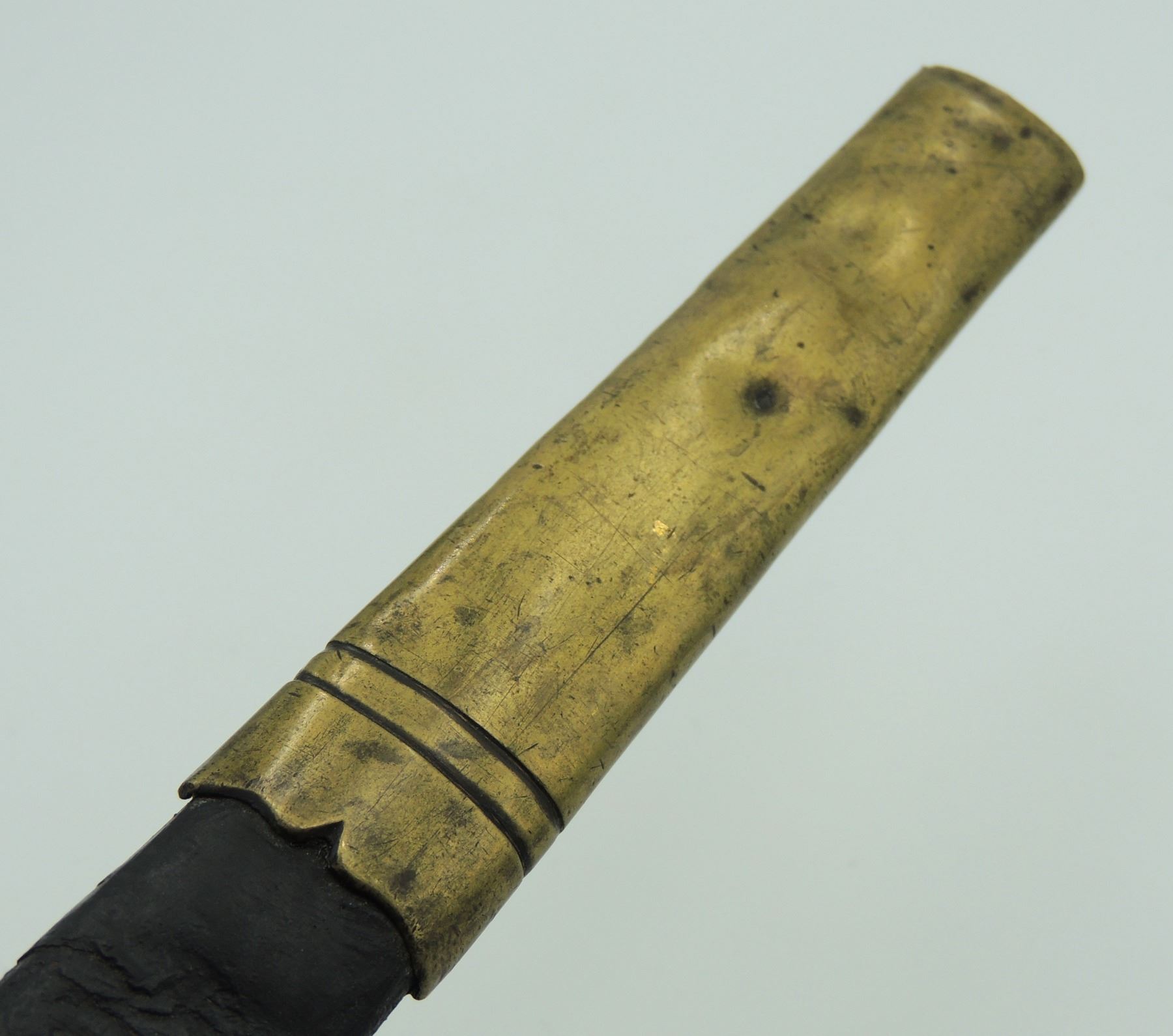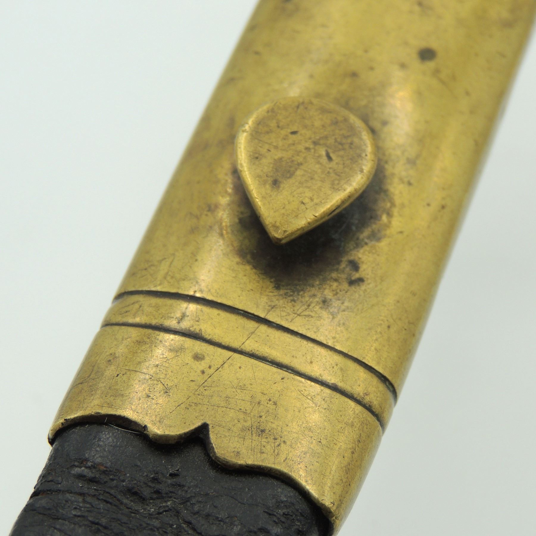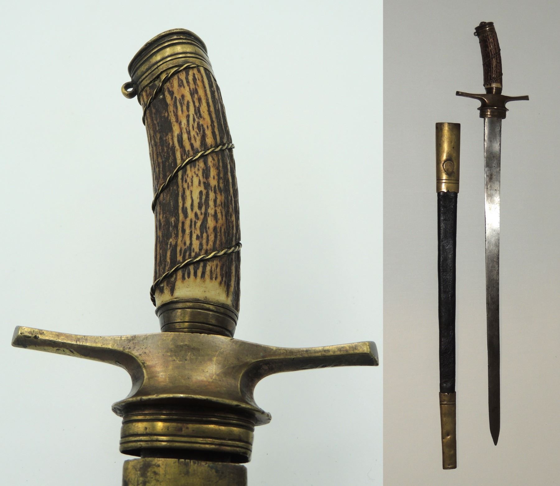 Mid/Late 1800's German Cutlass with Leather and Medal Scabbard. Includes Stag Handle with Wire Wrapping. Marked "52" on one side of handle. Measures 26 Inches in Scabbard. 25 Inches total with a 19.5 Inch Blade. 1800's German Blade/