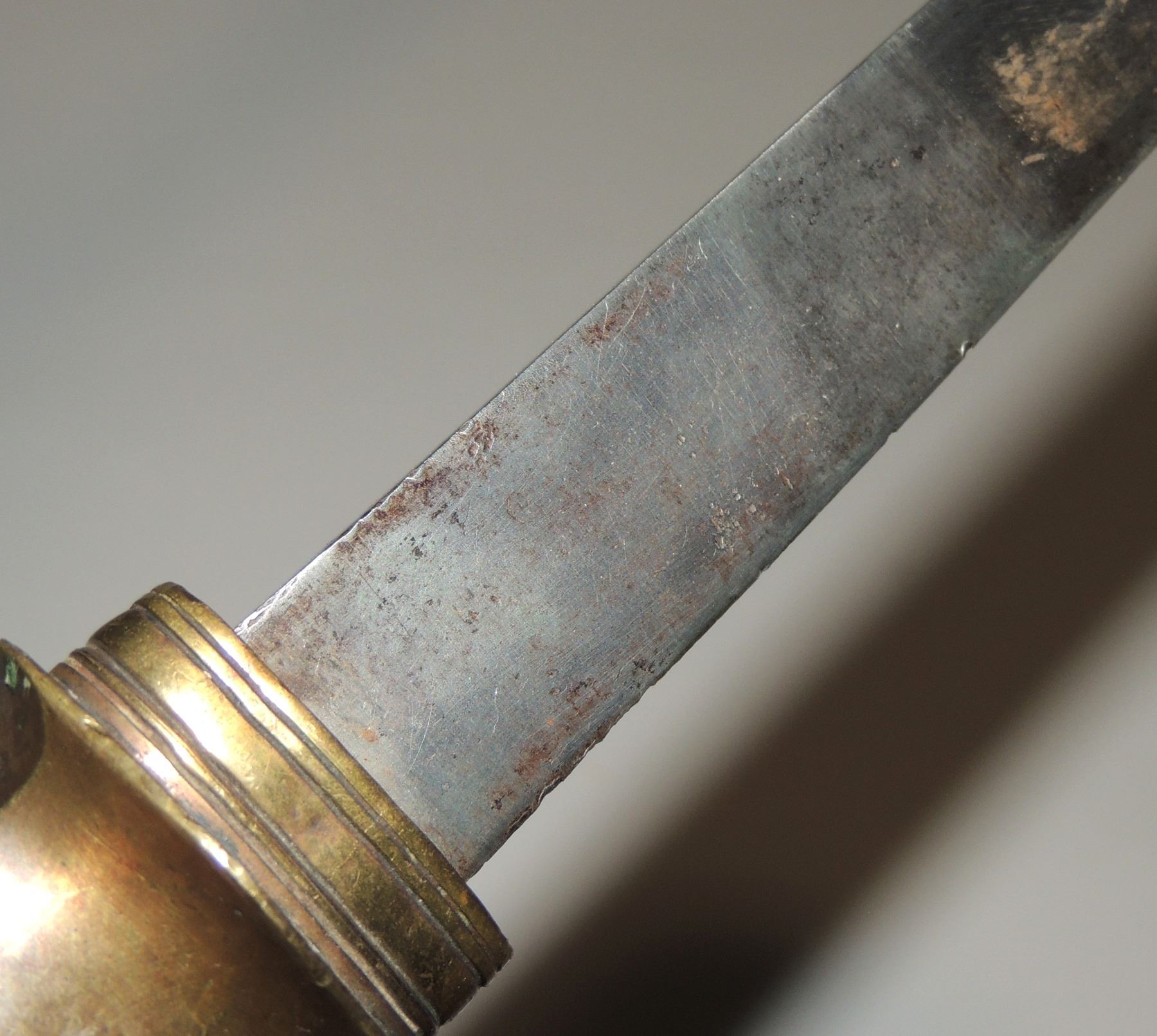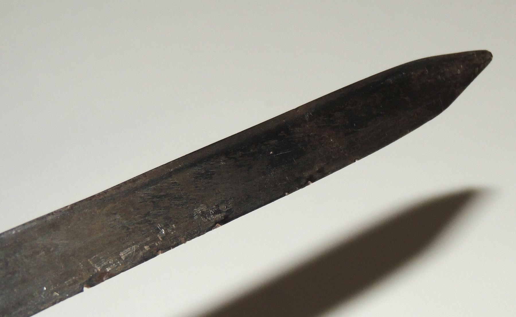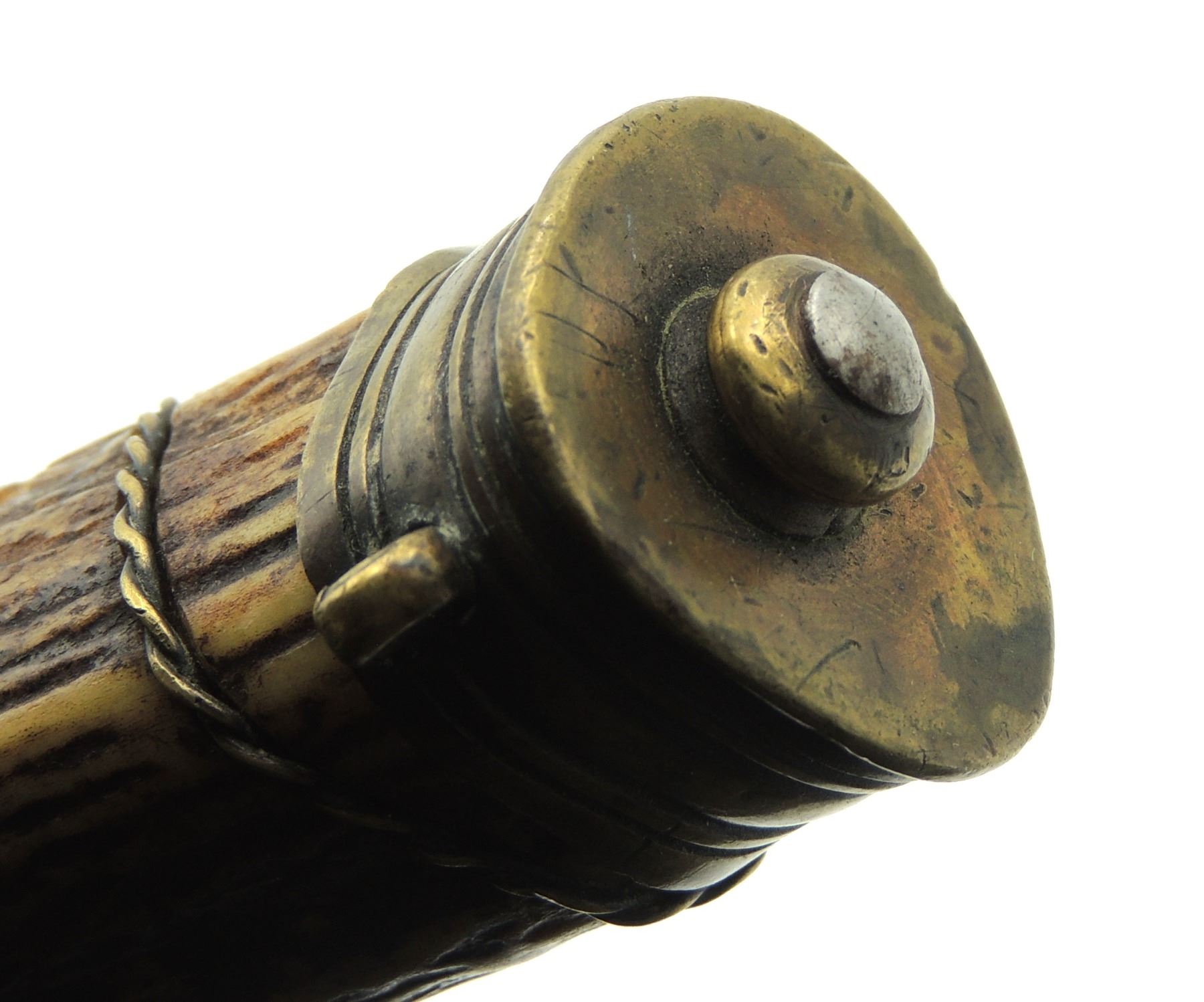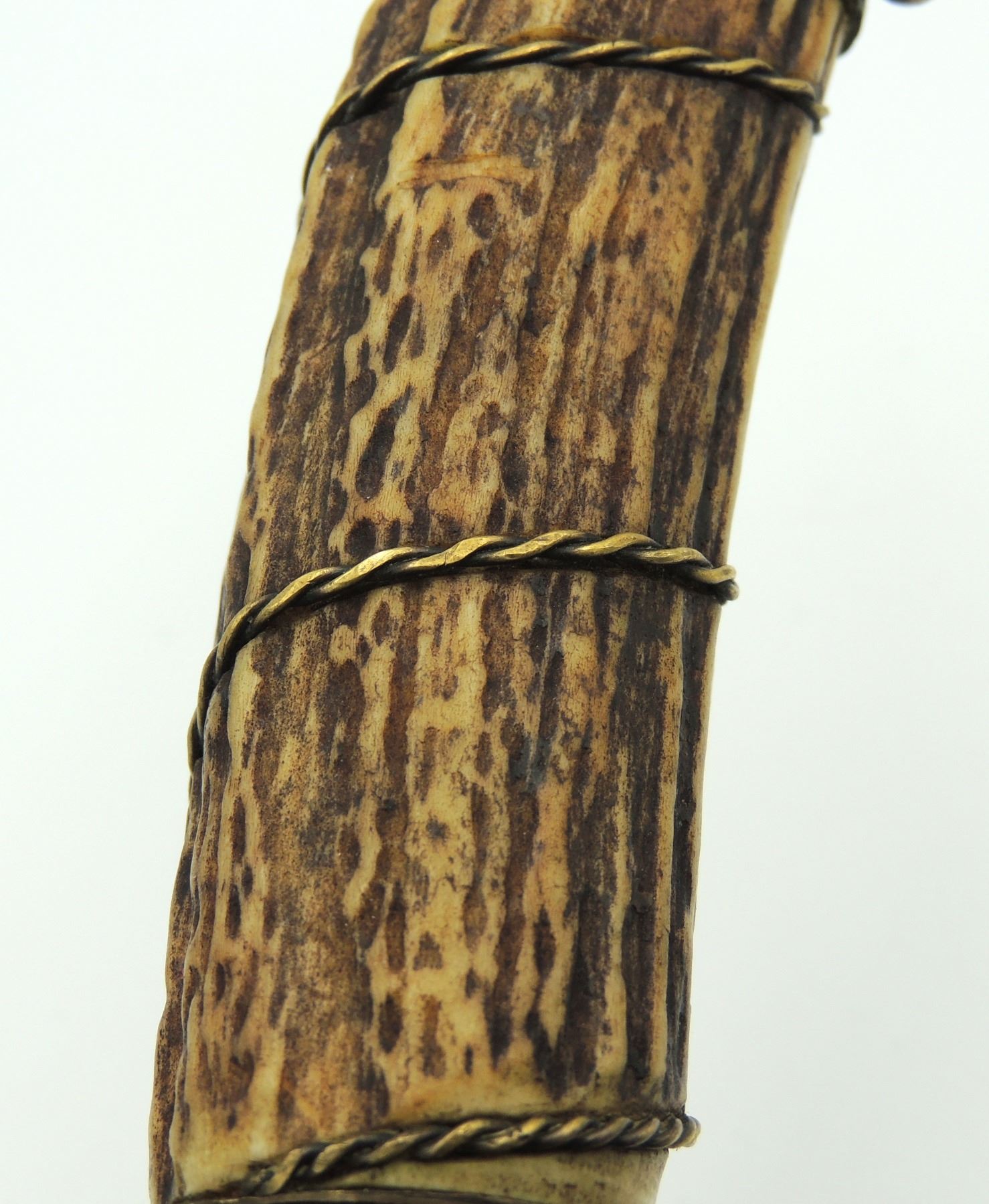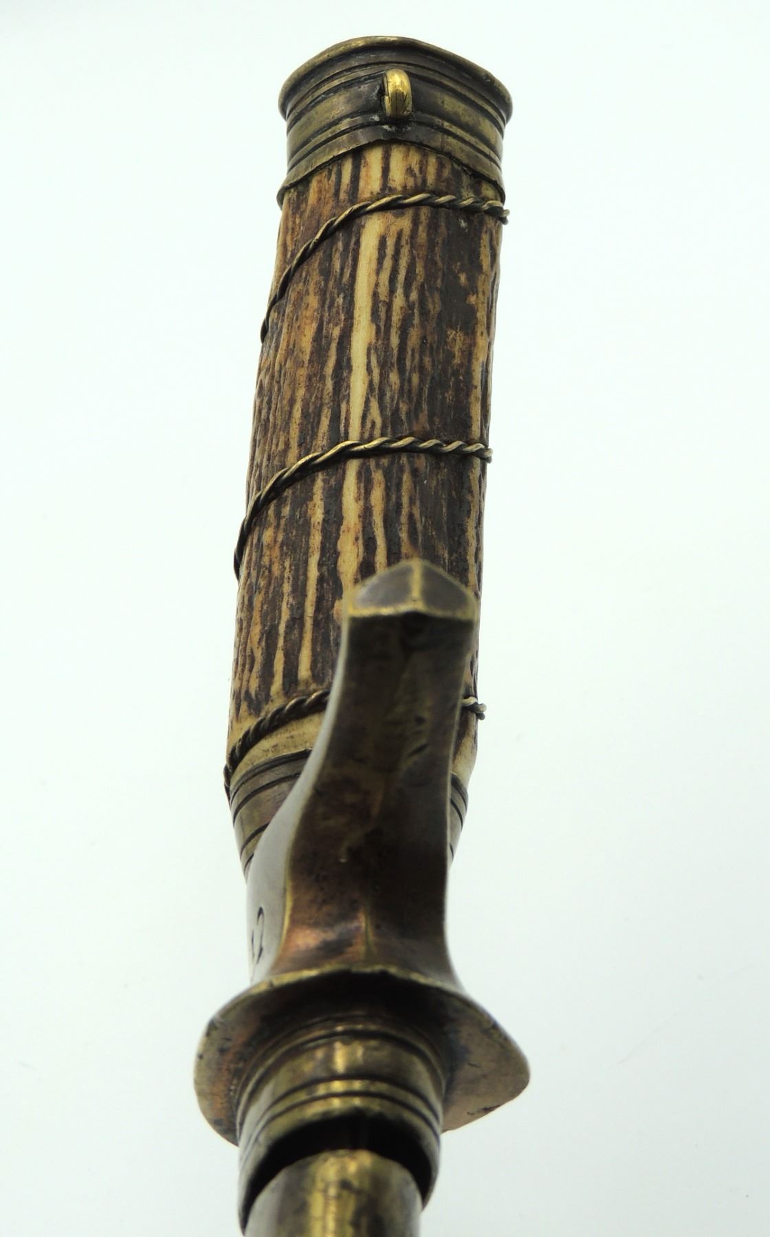 Mid/Late 1800's German Cutlass with Leather and Medal Scabbard. Includes Stag Handle with Wire Wrapping. Marked "52" on one side of handle. Measures 26 Inches in Scabbard. 25 Inches total with a 19.5 Inch Blade. 1800's German Blade/