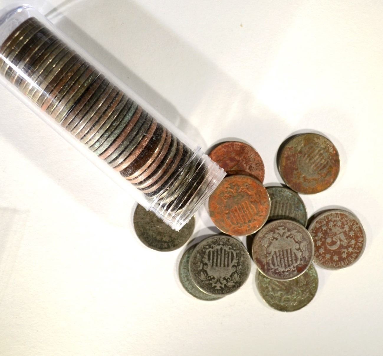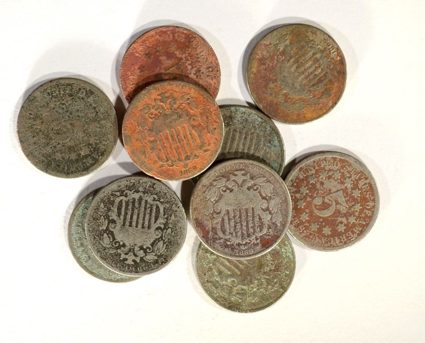 44-1869 SHIELD NICKELS, AG-F but all dark or corro