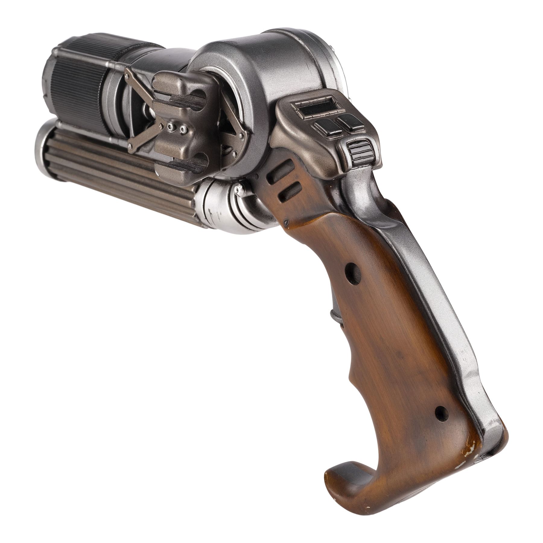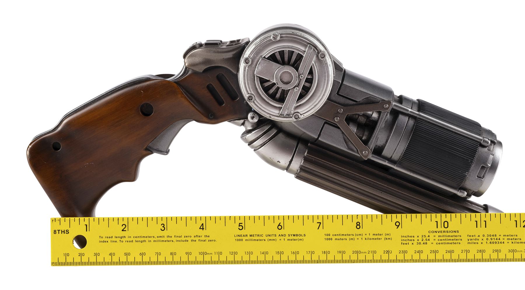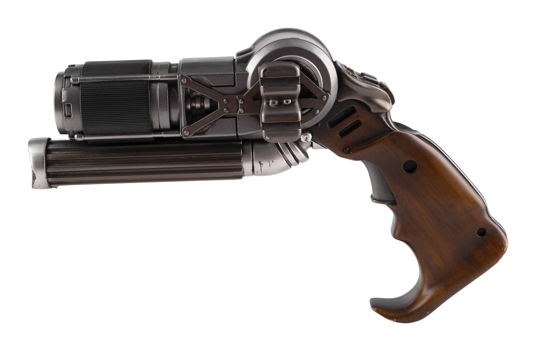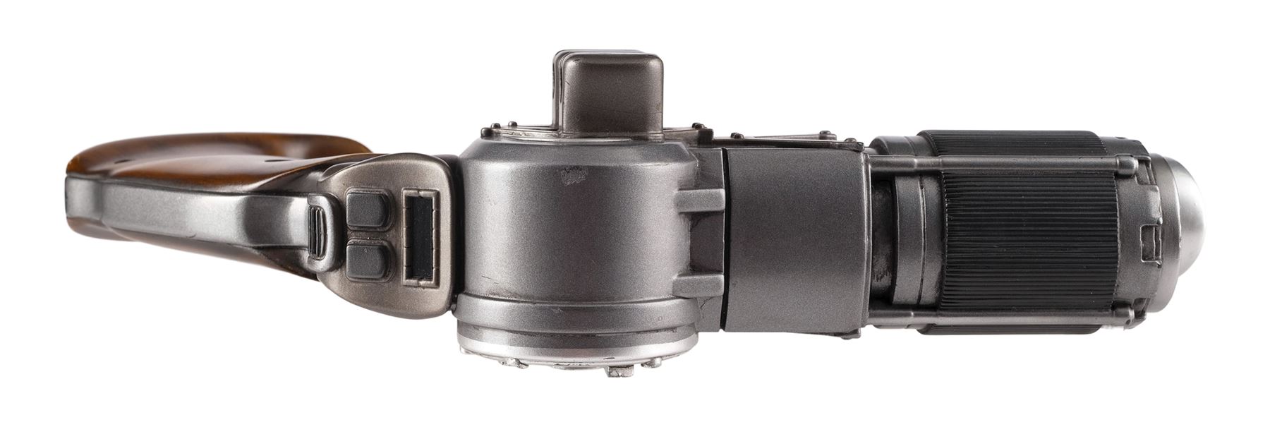 Production created two versions of the grapple gun for Batman. This grapple gun was used for action sequences and for display in Batman's armory. It is made of silver-color and gray-painted resin with a brown painted grip to resemble wood. This lot exhibits minor chipped material, as well as minor scuffing and chipped paint. Dimensions: 12" x 7.5" x 3.25" (30.5 cm x 19 cm x 8.5 cm)