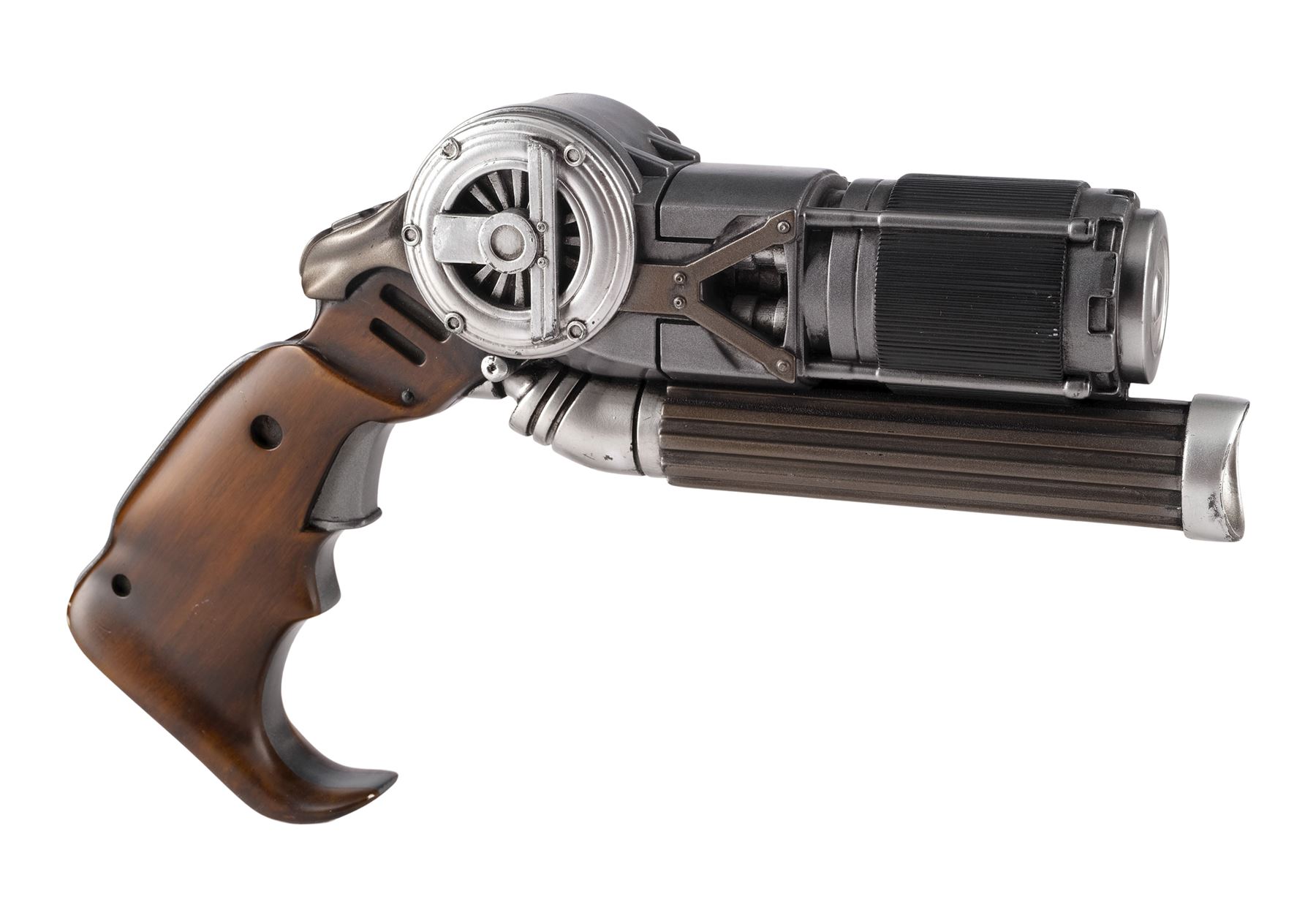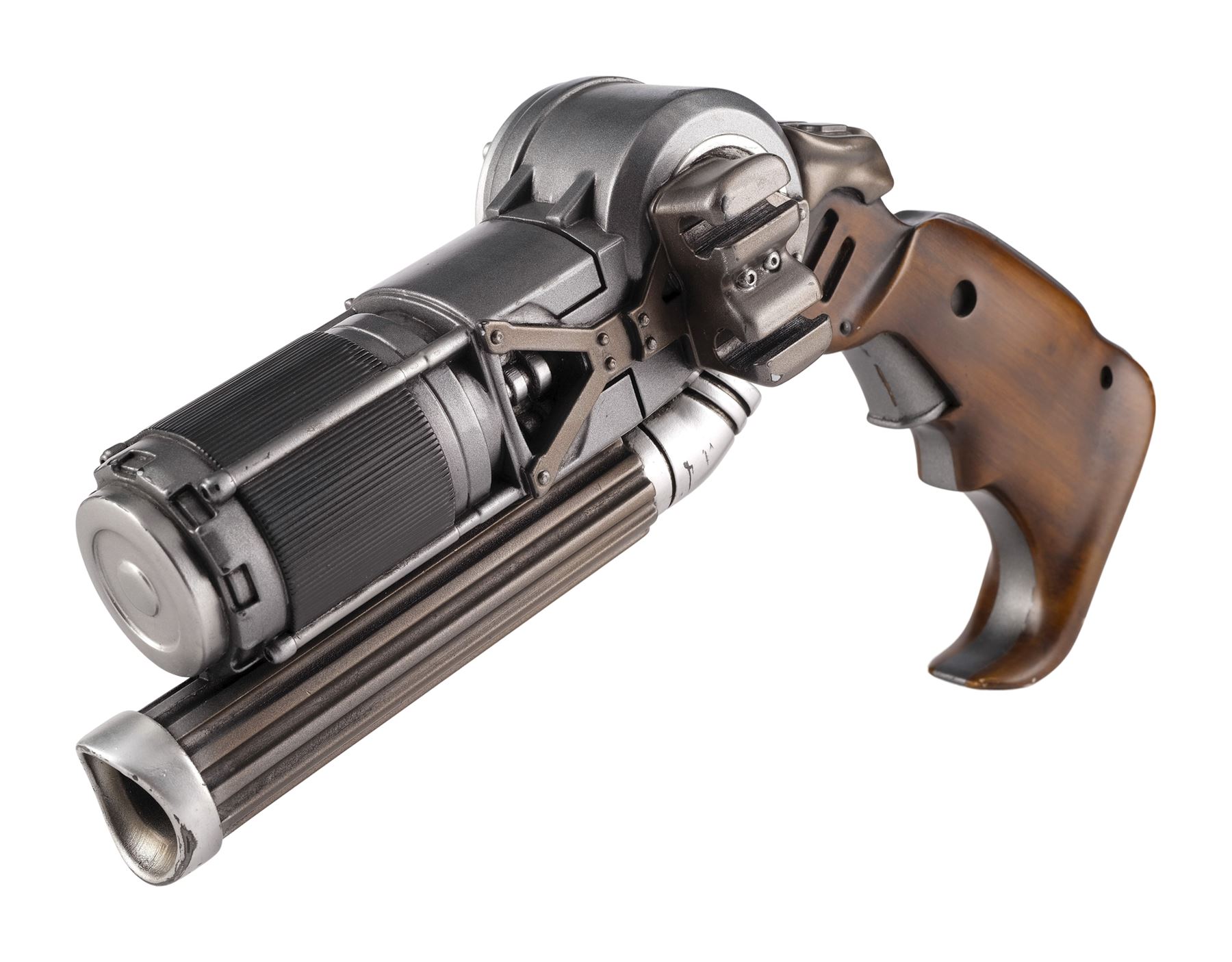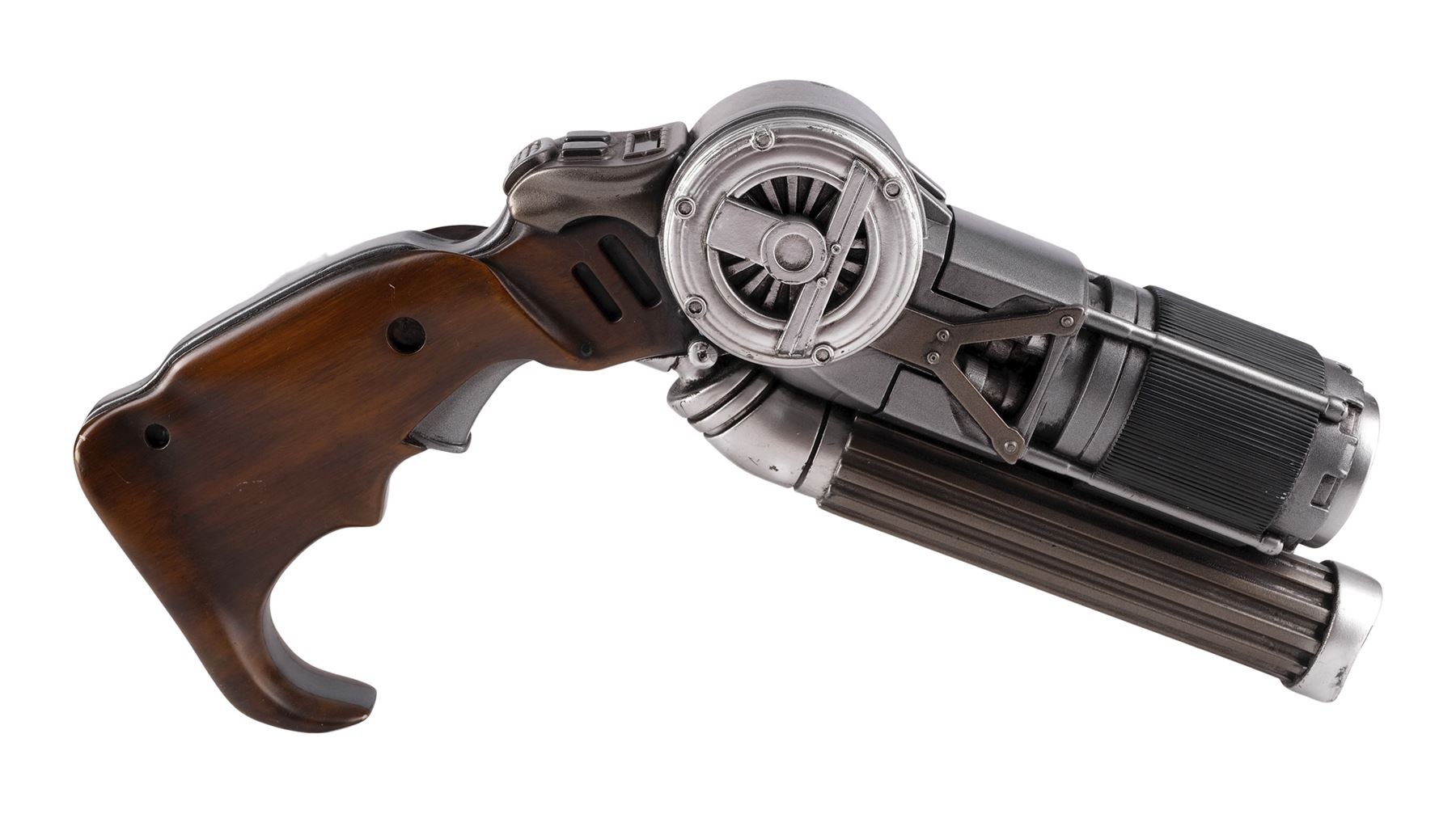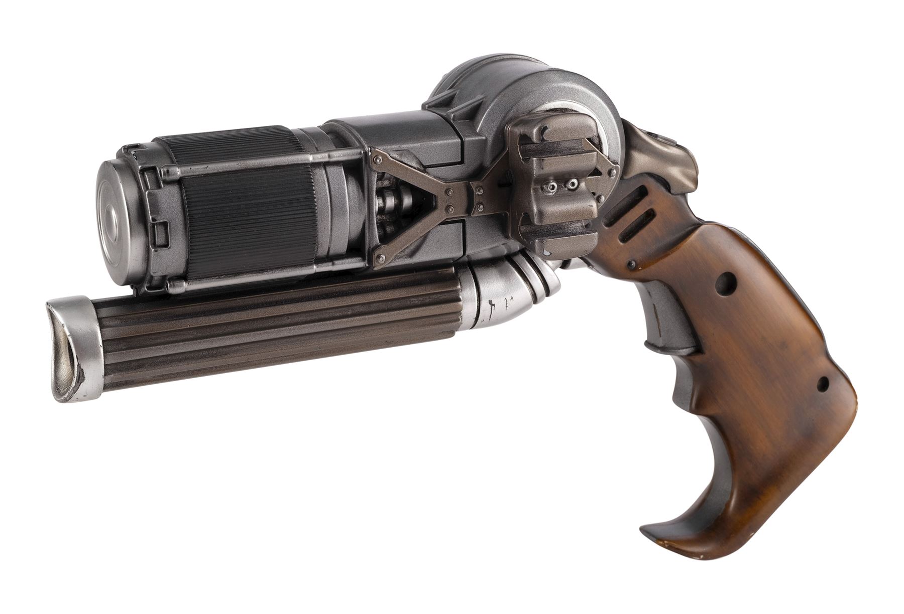 Production created two versions of the grapple gun for Batman. This grapple gun was used for action sequences and for display in Batman's armory. It is made of silver-color and gray-painted resin with a brown painted grip to resemble wood. This lot exhibits minor chipped material, as well as minor scuffing and chipped paint. Dimensions: 12" x 7.5" x 3.25" (30.5 cm x 19 cm x 8.5 cm)