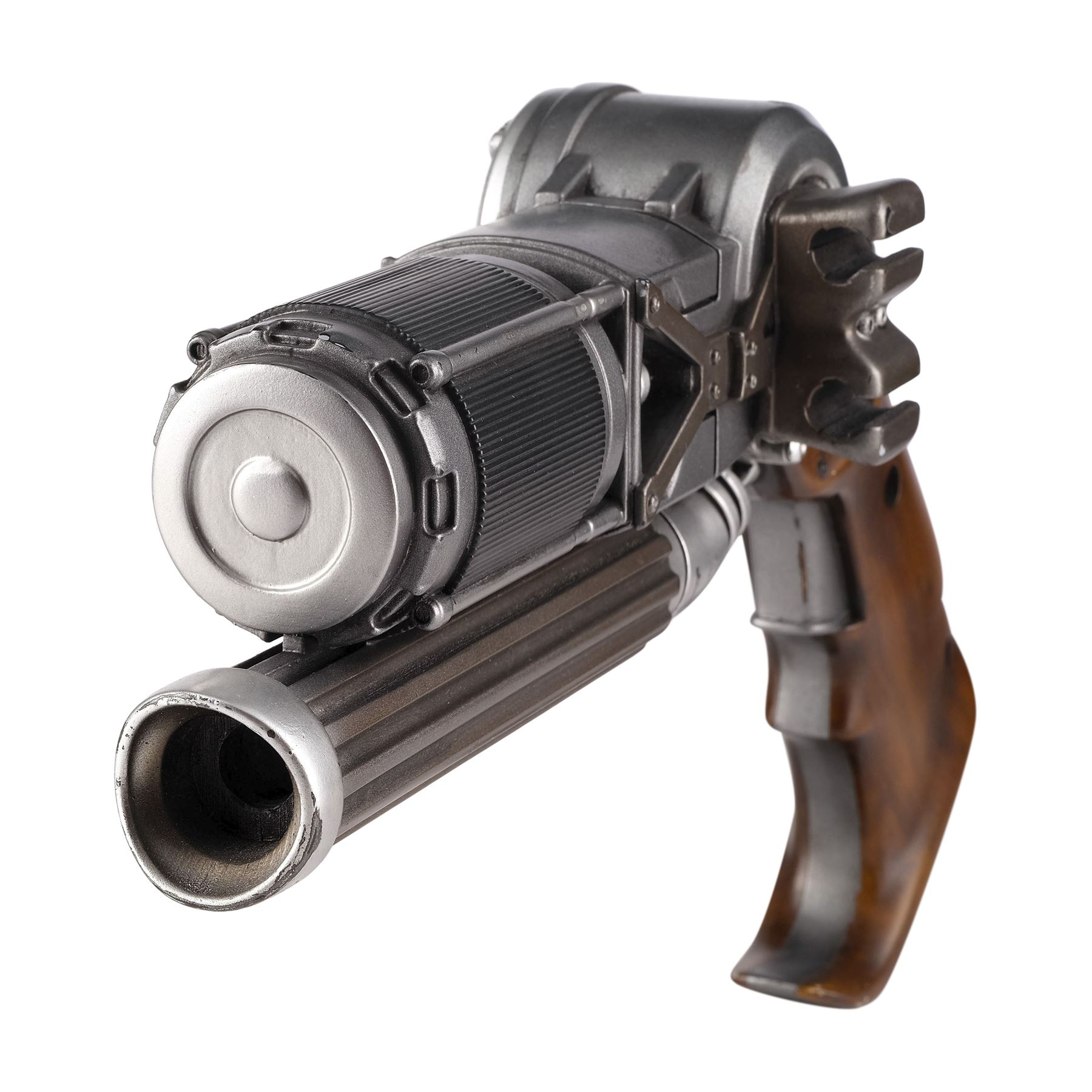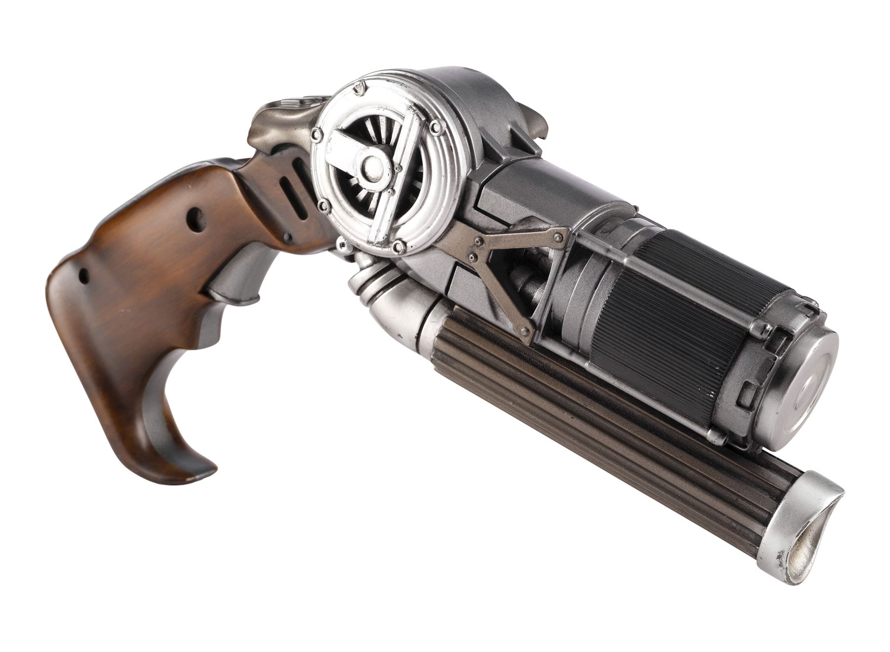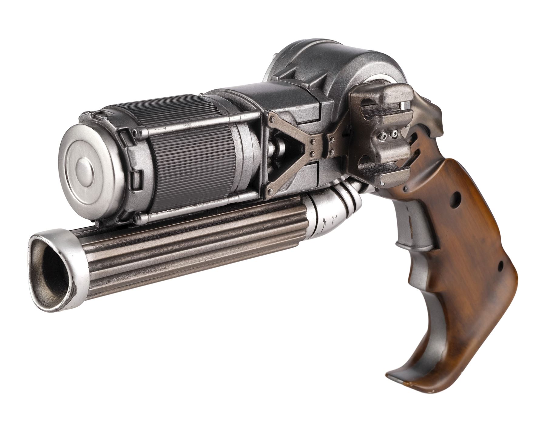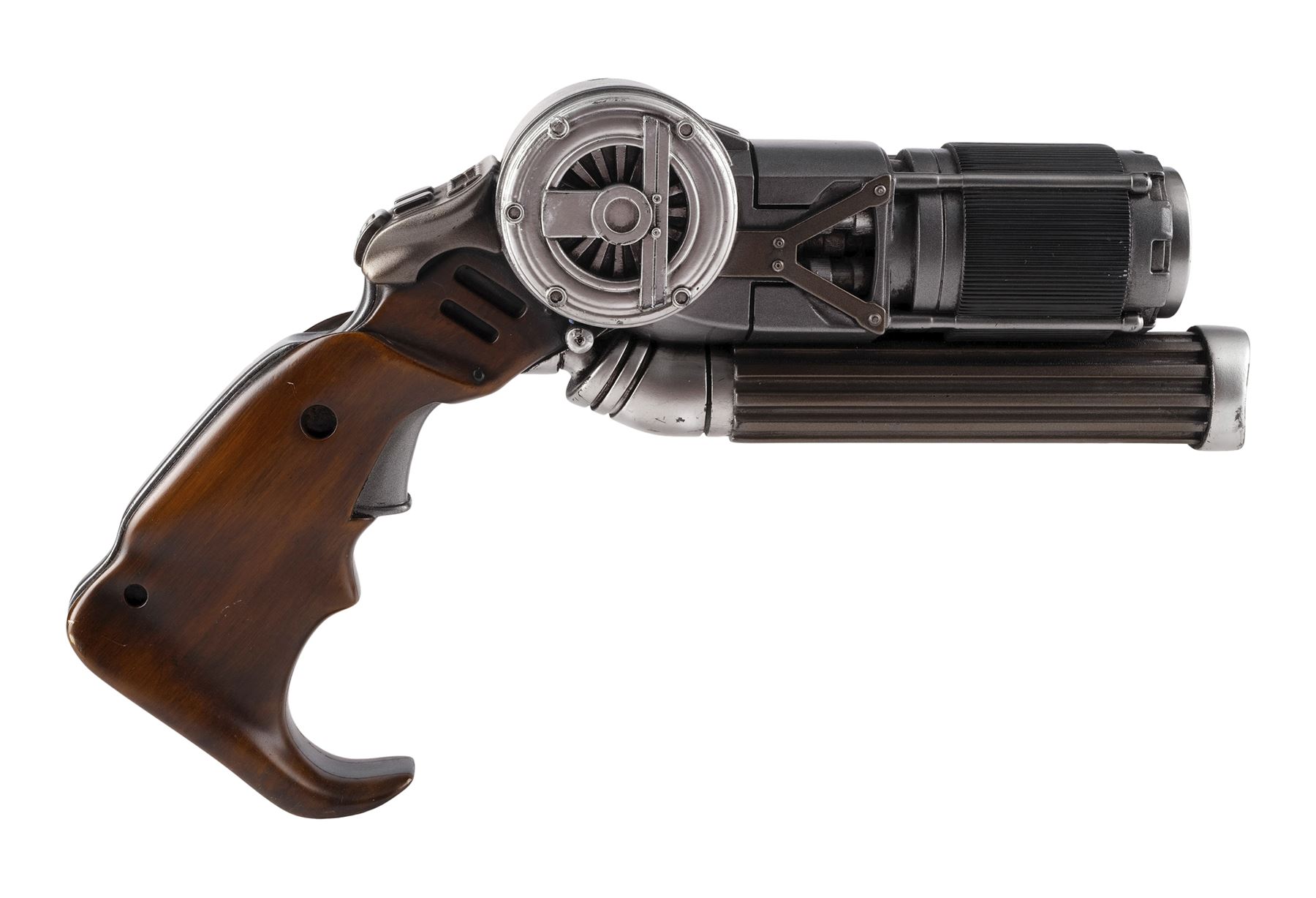 Production created two versions of the grapple gun for Batman. This grapple gun was used for action sequences and for display in Batman's armory. It is made of silver-color and gray-painted resin with a brown painted grip to resemble wood. This lot exhibits minor chipped material, as well as minor scuffing and chipped paint. Dimensions: 12" x 7.5" x 3.25" (30.5 cm x 19 cm x 8.5 cm)