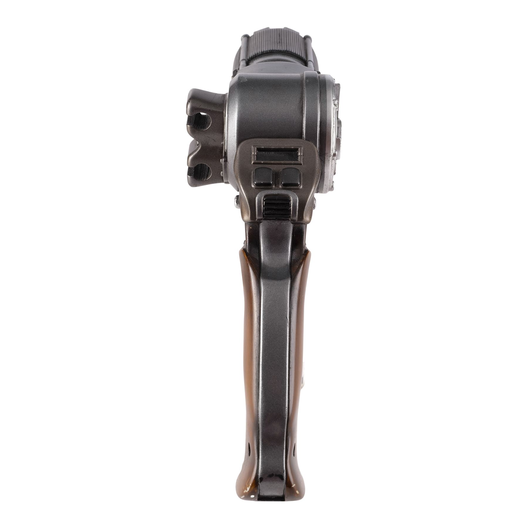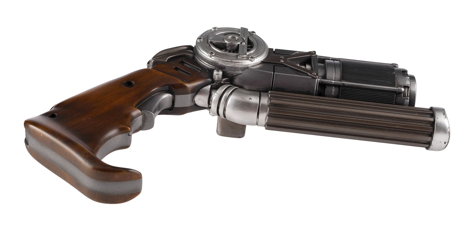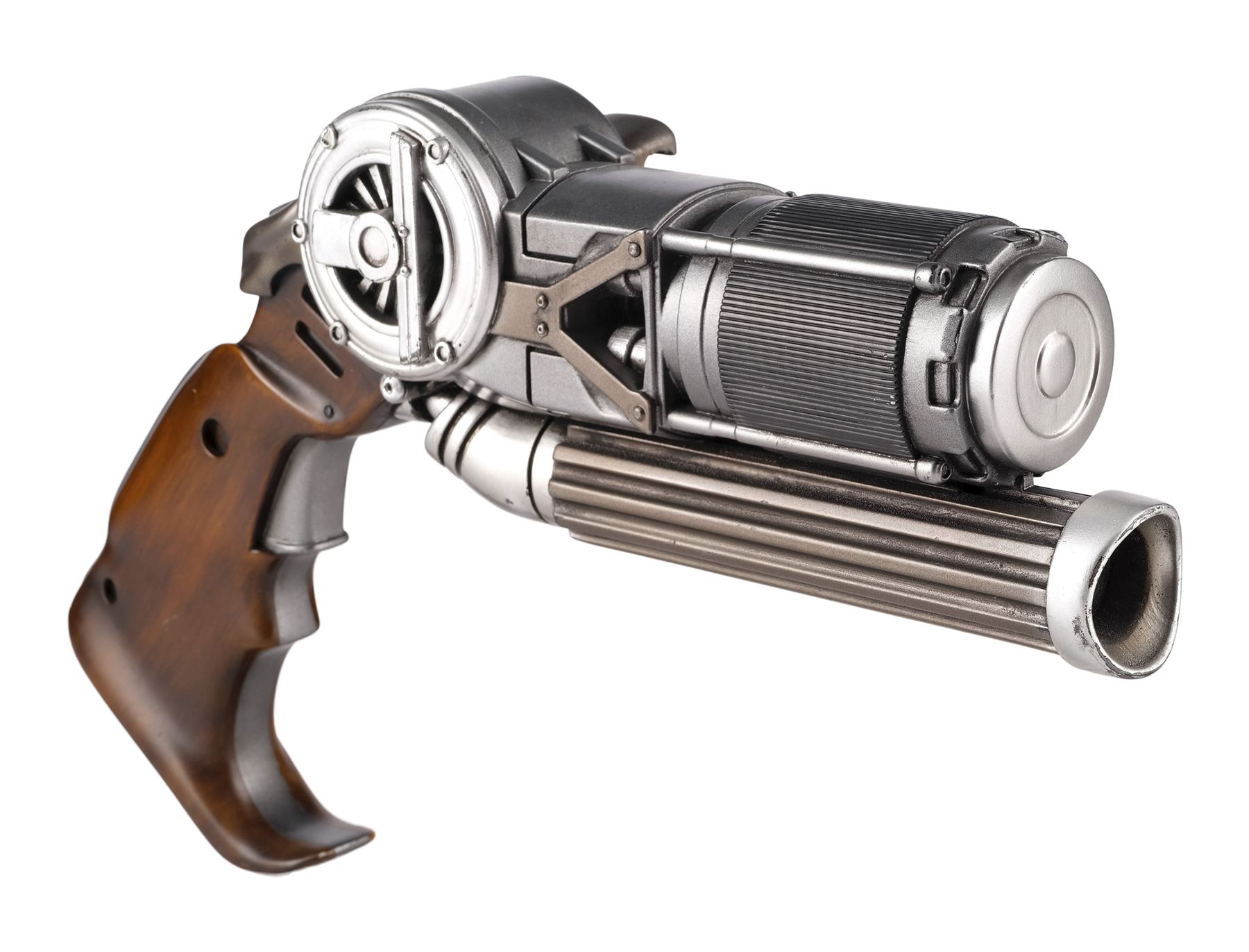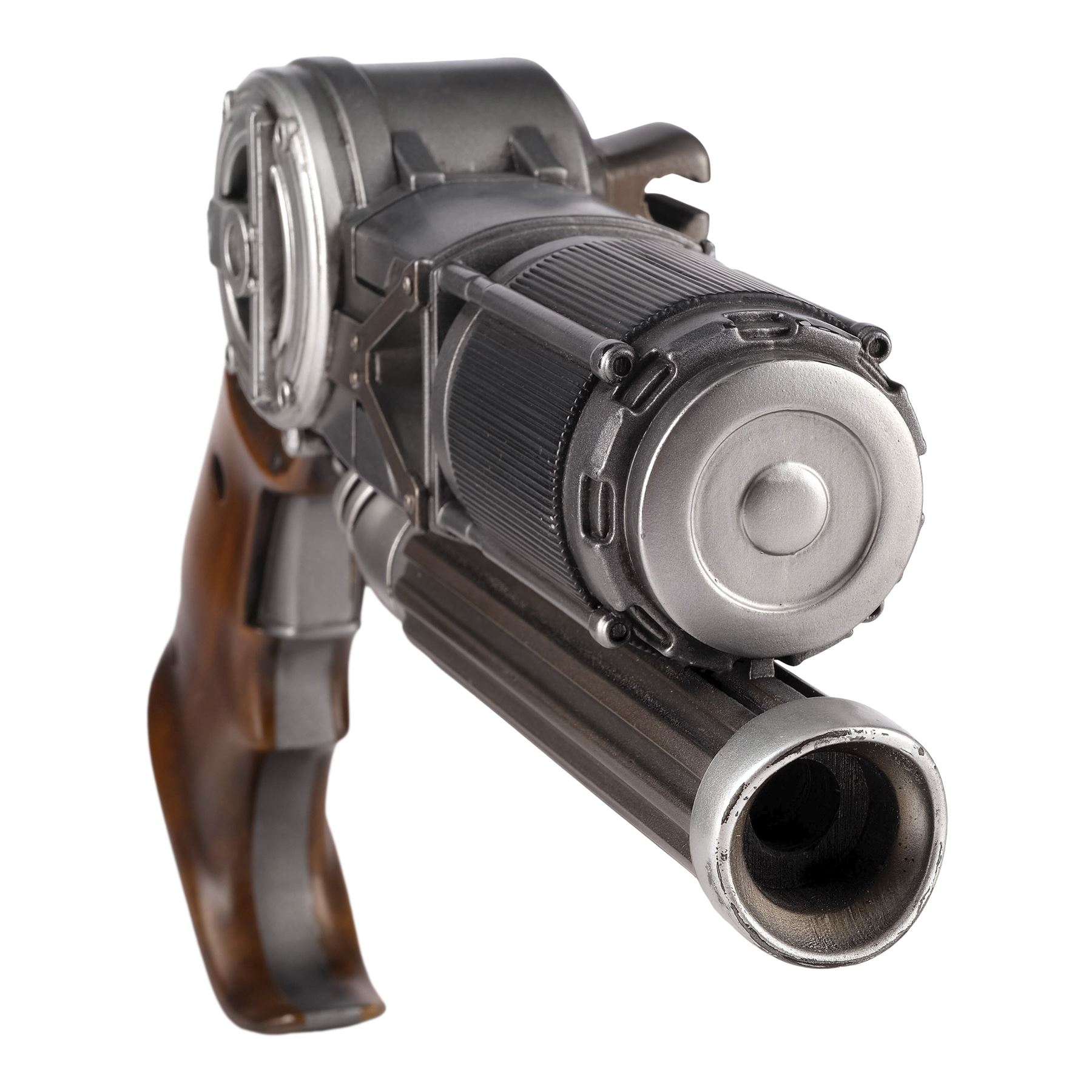 Production created two versions of the grapple gun for Batman. This grapple gun was used for action sequences and for display in Batman's armory. It is made of silver-color and gray-painted resin with a brown painted grip to resemble wood. This lot exhibits minor chipped material, as well as minor scuffing and chipped paint. Dimensions: 12" x 7.5" x 3.25" (30.5 cm x 19 cm x 8.5 cm)