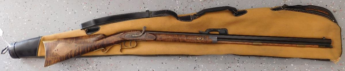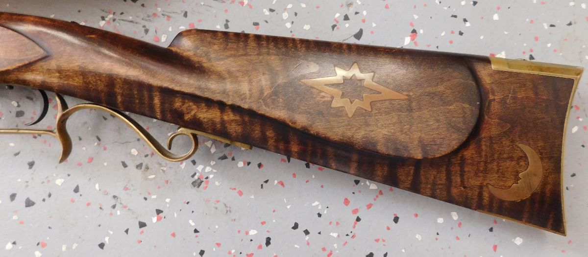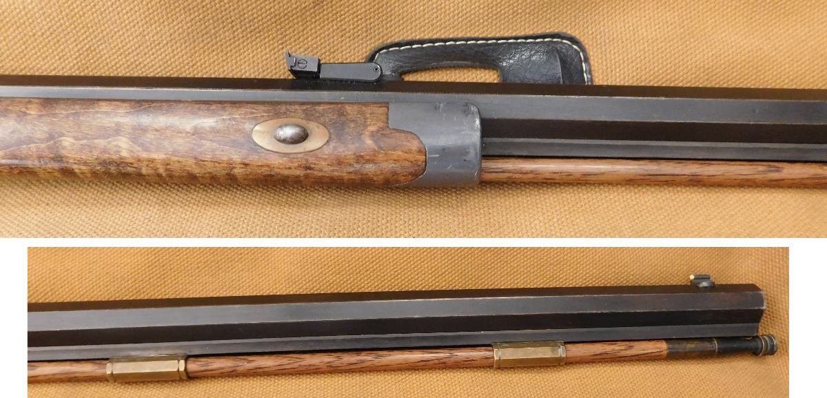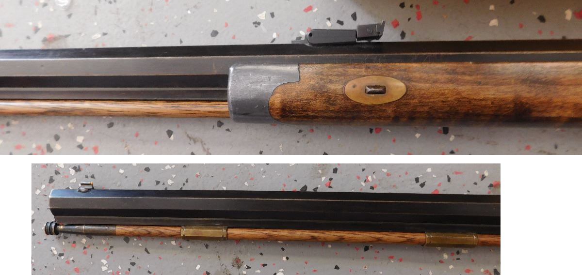 .44 Cal Black Powder Rifle, circa 1940s. Made of steel, wood, and brass, the rifle measures 46" x 5" x 2". Non-tribal, G.A.S. Also has box of .44 Cal lead balls, patches, powder flask, brass tool, extra nipple, bore butter tube, will not ship caps or black power. Condition: Very good, nice inlay. Shiping: $60.00.
