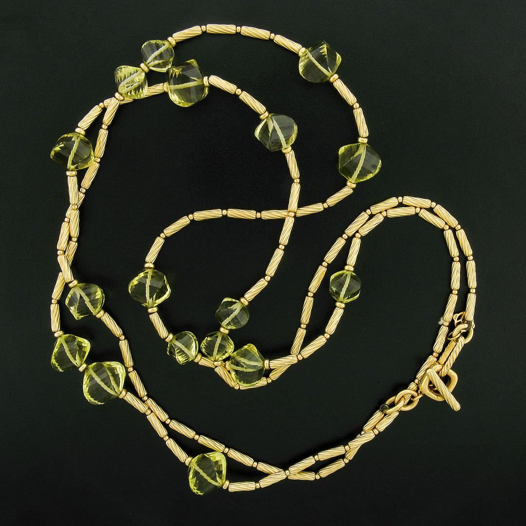 A solid 18k yellow gold long station necklace by David Yurman, with 17 fancy step cut natural lemon quartz (11.1mm to 16.3mm each). It weighs a total of 65.48 grams, measures 16.3mm wide, and measures 44 inches in length.