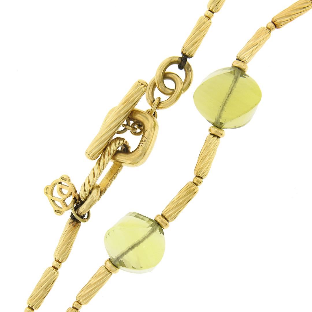 A solid 18k yellow gold long station necklace by David Yurman, with 17 fancy step cut natural lemon quartz (11.1mm to 16.3mm each). It weighs a total of 65.48 grams, measures 16.3mm wide, and measures 44 inches in length.
