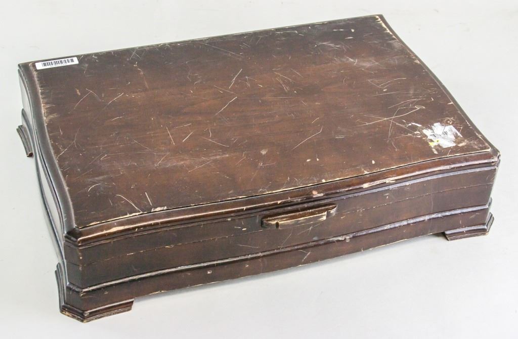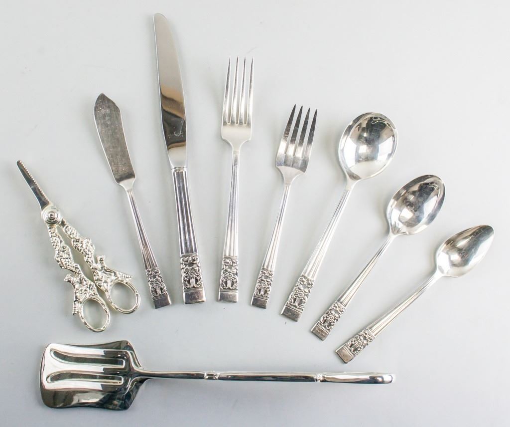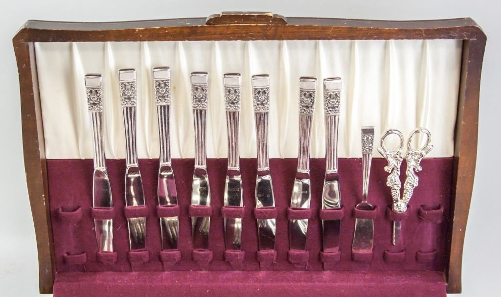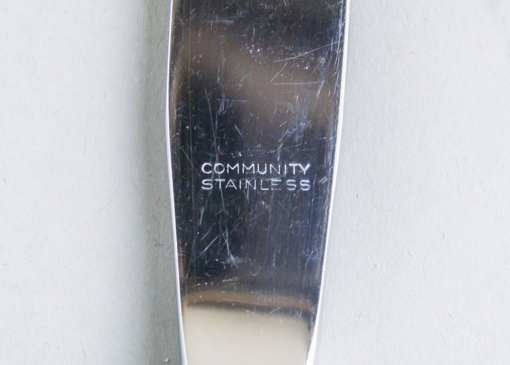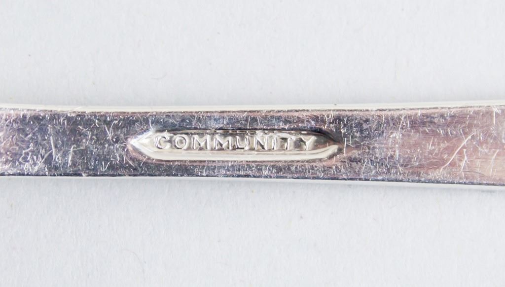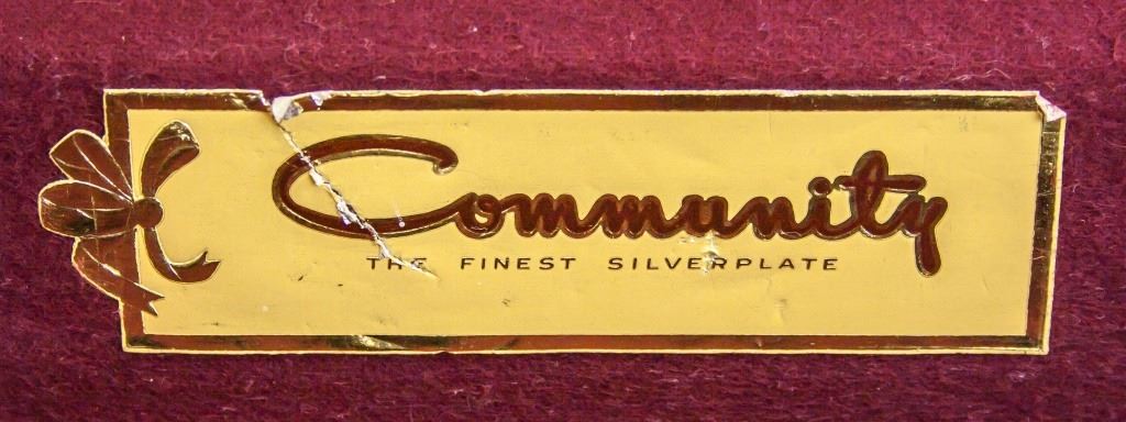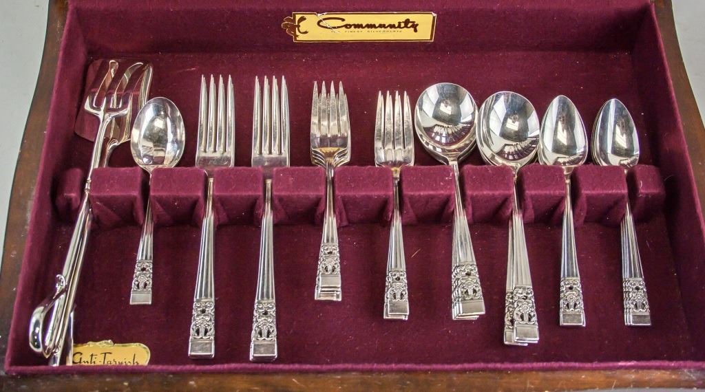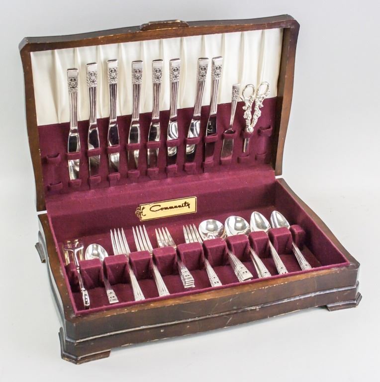 44-piece silverware set, with wooden storage box. "Community The Finest Silverplate" and "Anti-Tarnish Silverare Container" labels inside box. Silverware stamped with "COMMUNITY" and "COMMUNITY STAINLESS". 9.5 x 43 x 29 cm. 3.5 kg.