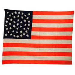 44 STAR AMERICAN FLAG. 2' x 3'. Printed cotton flag with a very rare triple wreath design of central star with three circles of stars and four stars in opposite corners of canton. The 44th star commemorates the state of Wyoming which became a state in 1890. CONDITION: Very good, excellent colors, minor staining. 4-53377 JS44