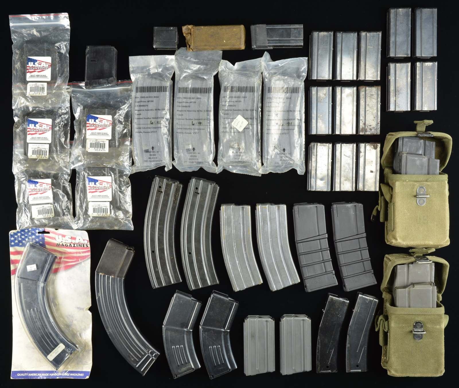 Most are near excellent to new except for some M-1 Carbine mags that are noted. M-14 (M1-A): 4 Original military parkerized 20 rd. w/ 2 US green canvas belt carriers. / 5 New U.S.A. 10 rd. in packages. / 7.62X39 AR-15: 2 unmarked steel 20 rd. 2 piece w/ bottom portion appearing from AK-47 mag. / 2 unmarked steel 30 rd. 2 piece w/ bottom portion appearing from AK-47 mag (1 by U.S.A. new in package). / 1 plastic 10 rd. by MWG Co. / 5.56 (223 Rem) AR-15: 6 aluminum 30 rd. (4 new in package by Center Industries plus 2 by Okay Industries). / 2 aluminum Colt; 5 rd. plus 5 rd. having rivet & limiter removed giving 20 rd. / 2 no name steel 30 rd. marked for AR-15 or AR-180. / 2 Thermold 20 rd. / M-1 CARBINE (all blued steel): 1 - 5 rd. / 2 M-2 of 30 rds. / 15 of 15 rds.; 1 new in oiled wrapper, 2 BW, 2 AI, 2 KI, 2 SS, 1 UI, 1 IA, 1 LU (light oxidation), 1 KSG (light oxidation & wear), 1 circled IU (light wear) & 1 circled IR (light wear). (02-16951-13/NW). $450-600.