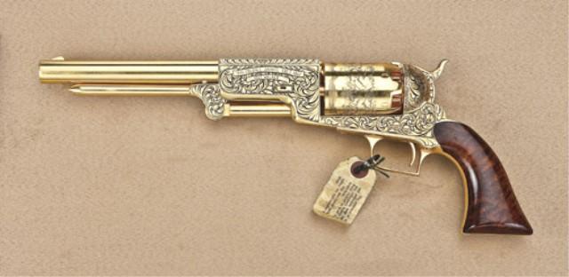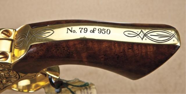 .44 caliber percussion Walker style revolver made by Uberti, collector’s series, full gold plated, fancy engraved motifs, marked in banners “1814 Col. Samuel Colt. 1862” and “1847 Walker” beneath. Also shows 1847 and US mark on right side of barrel, serial #04237. Numbered 79 of 950 on backstrap. With full Ornsby type Dragoon scene on cylinder. Deluxe burl wood grips, shows no evidence of firing, just some slight handling. No case. Est: $600 - $1,200