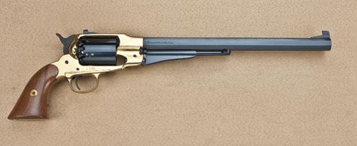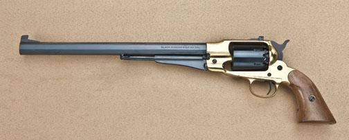 .44 caliber percussion blackpowder revolver based on 1858 Remington New Model with cast brass frame, 12” octagon barrel, marked “F. Lilipietta Itally”, adjustable sights, like new in box, shows just slight handling and no evidence of firing. Est: $200 - $400