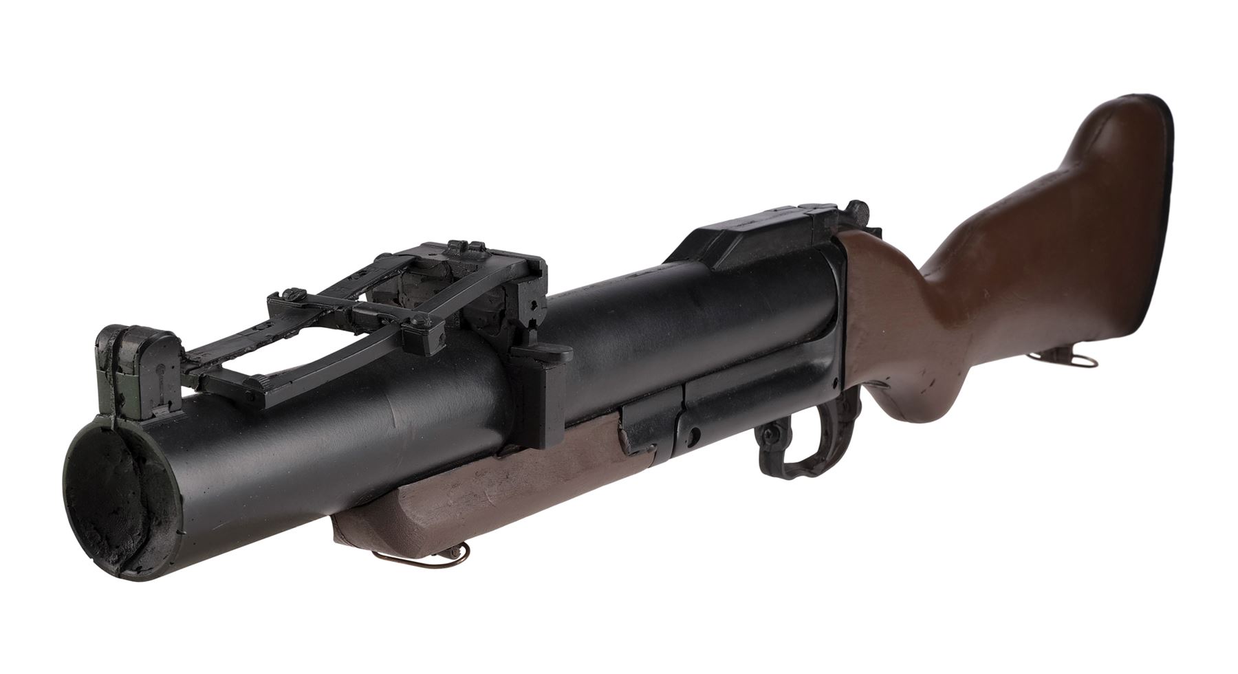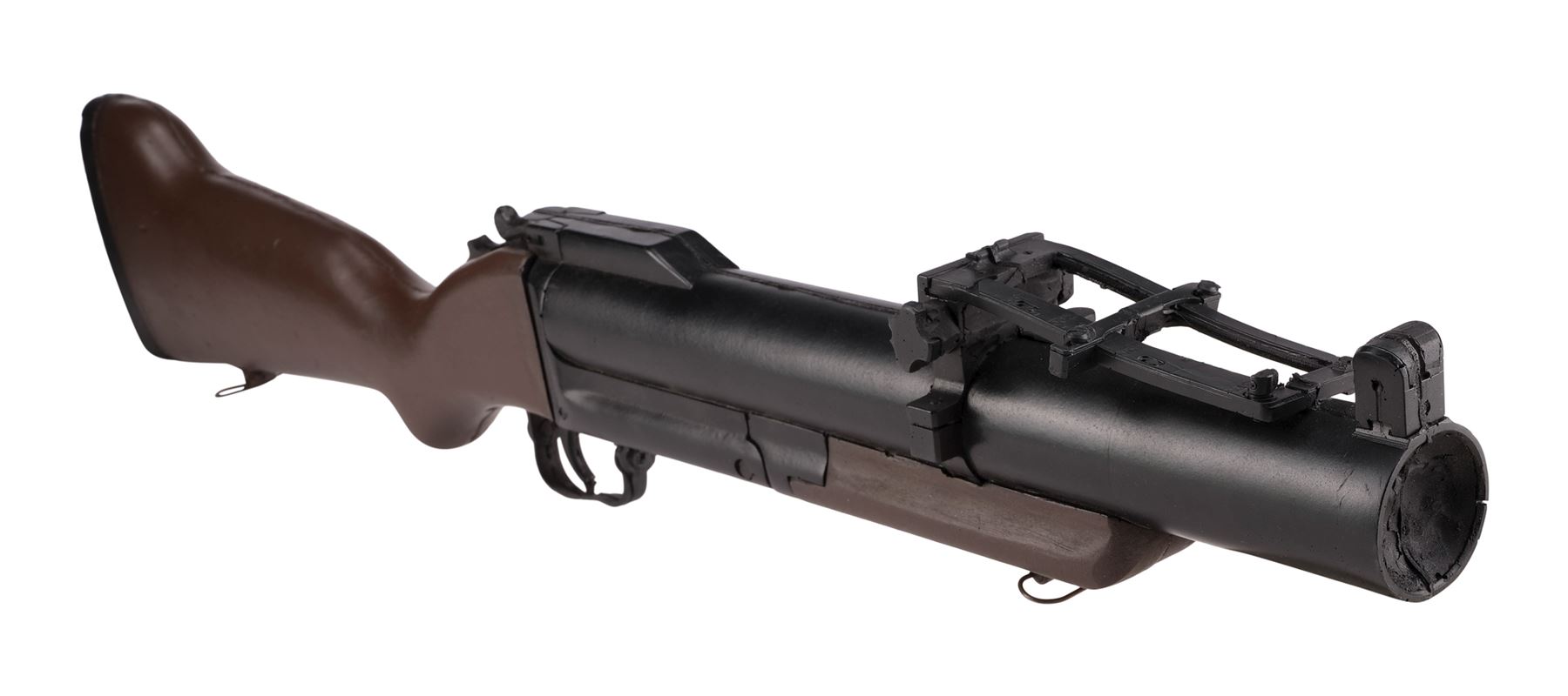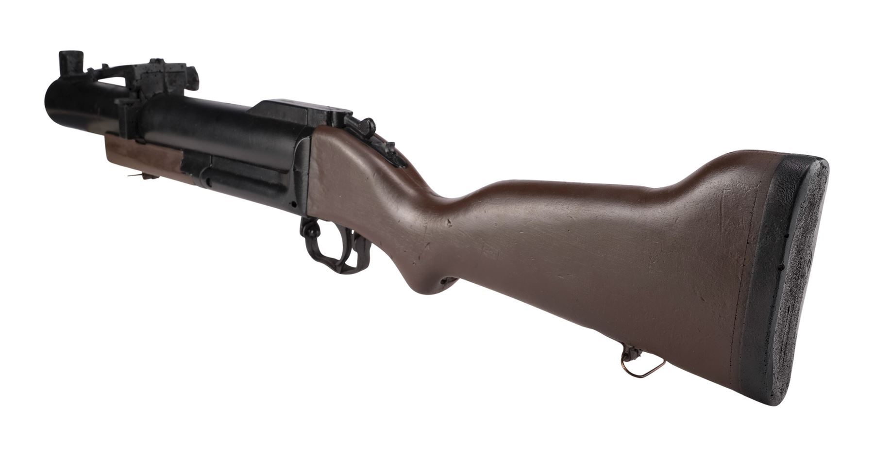 Molded from a real-world M79, this black foam rubber stunt launcher is painted brown on the fore-end assembly and butt to appear wooden with metal buckles under the fore-end and butt for affixing a strap. The grenade launcher exhibits some grime and staining along the body as well as light tearing along the seamline inside the muzzle. Dimensions: 28" x 5" x 2" (71.25 cm x 12.75 cm x 5 cm)