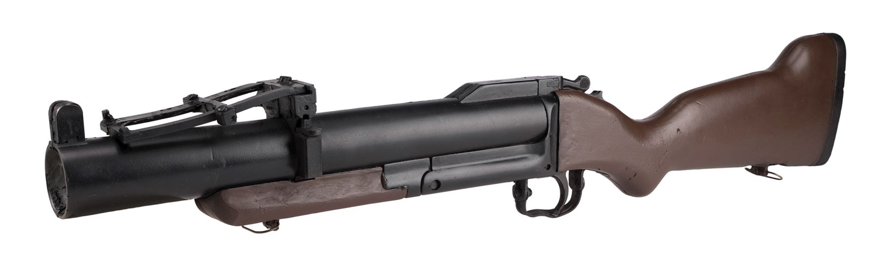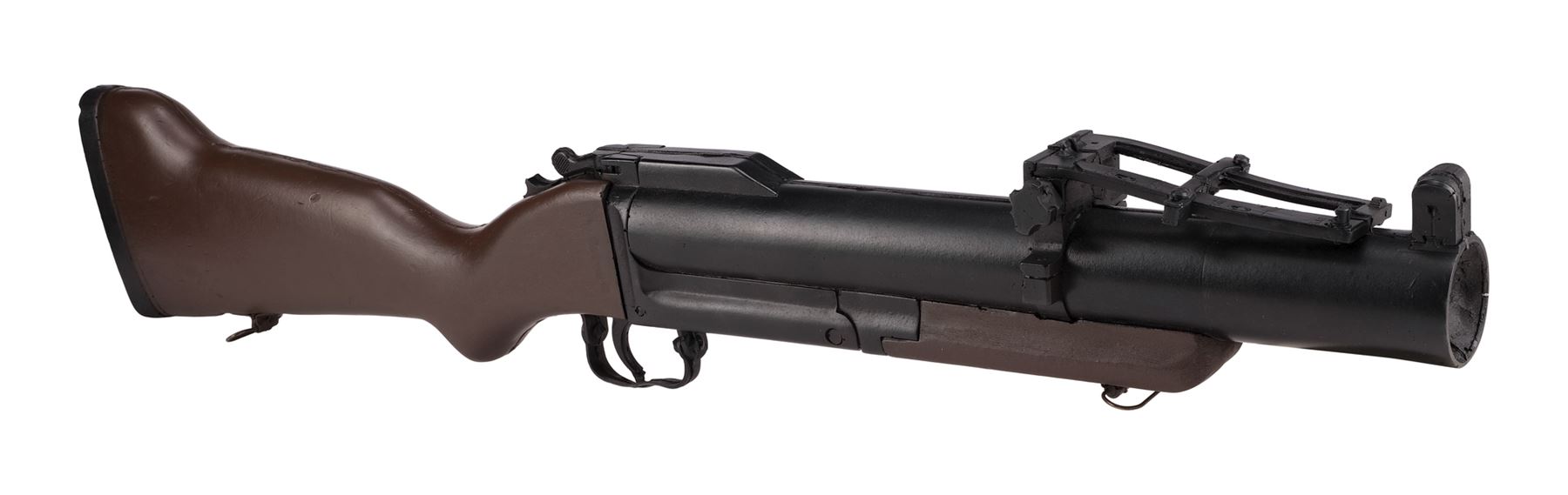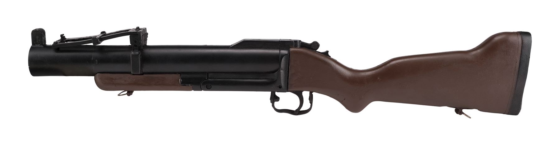 Molded from a real-world M79, this black foam rubber stunt launcher is painted brown on the fore-end assembly and butt to appear wooden with metal buckles under the fore-end and butt for affixing a strap. The grenade launcher exhibits some grime and staining along the body as well as light tearing along the seamline inside the muzzle. Dimensions: 28" x 5" x 2" (71.25 cm x 12.75 cm x 5 cm)