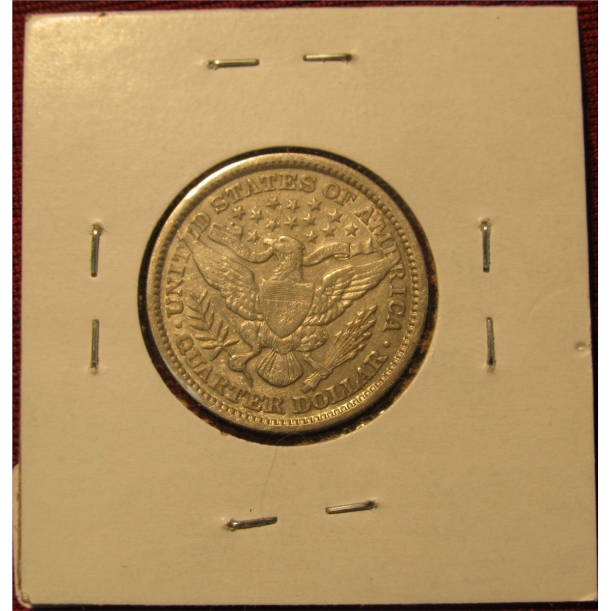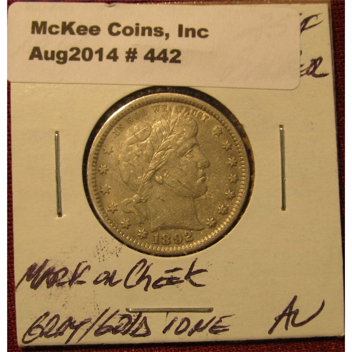 442. 1892 Barber Quarter. AU. Grey/Gold Toning. Mark on cheek. Better Date.