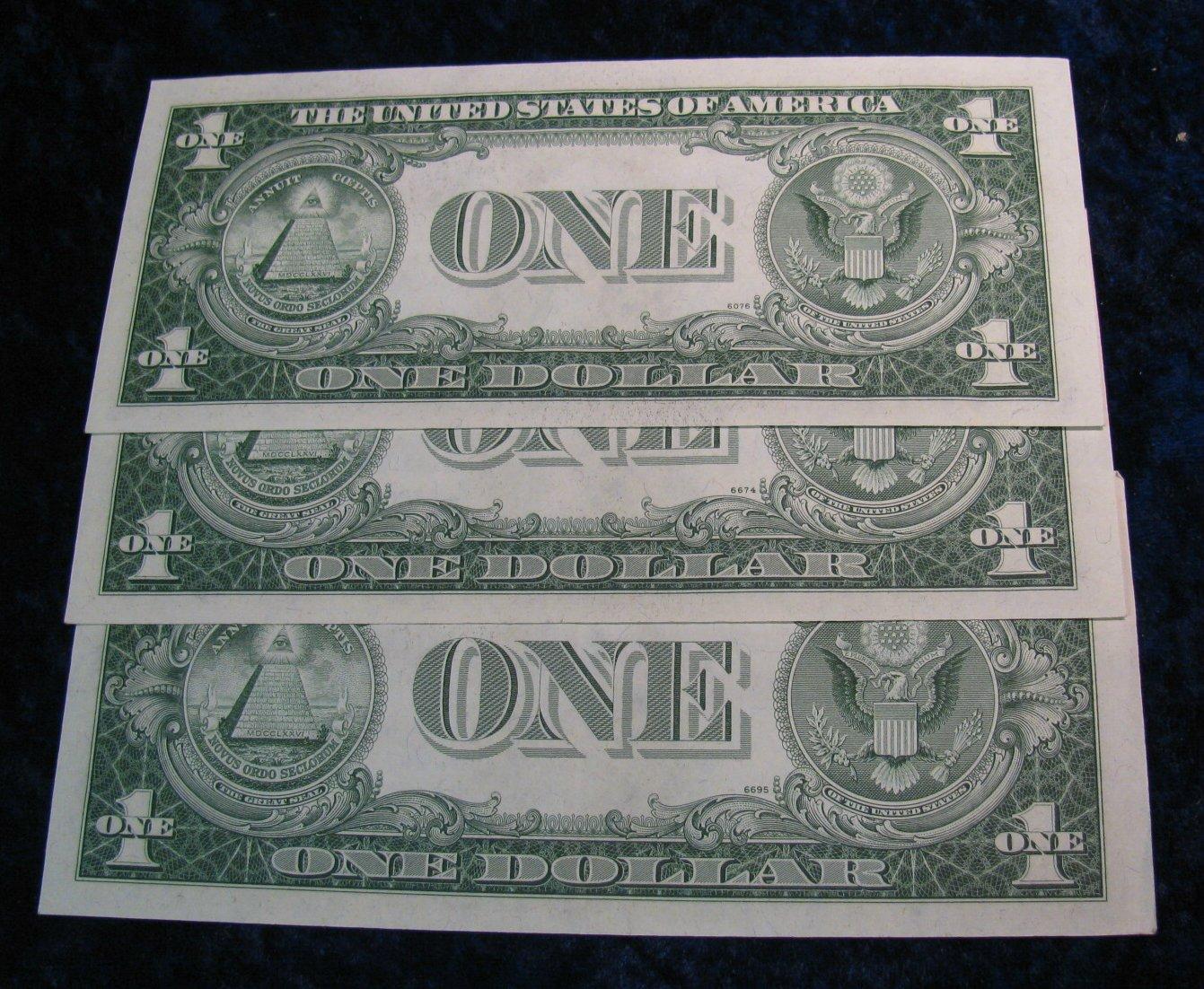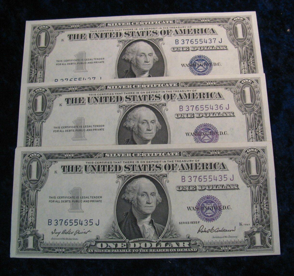 443. (3) Consecutive Serial Number Series 1935F $1 Silver Certificates. CU.