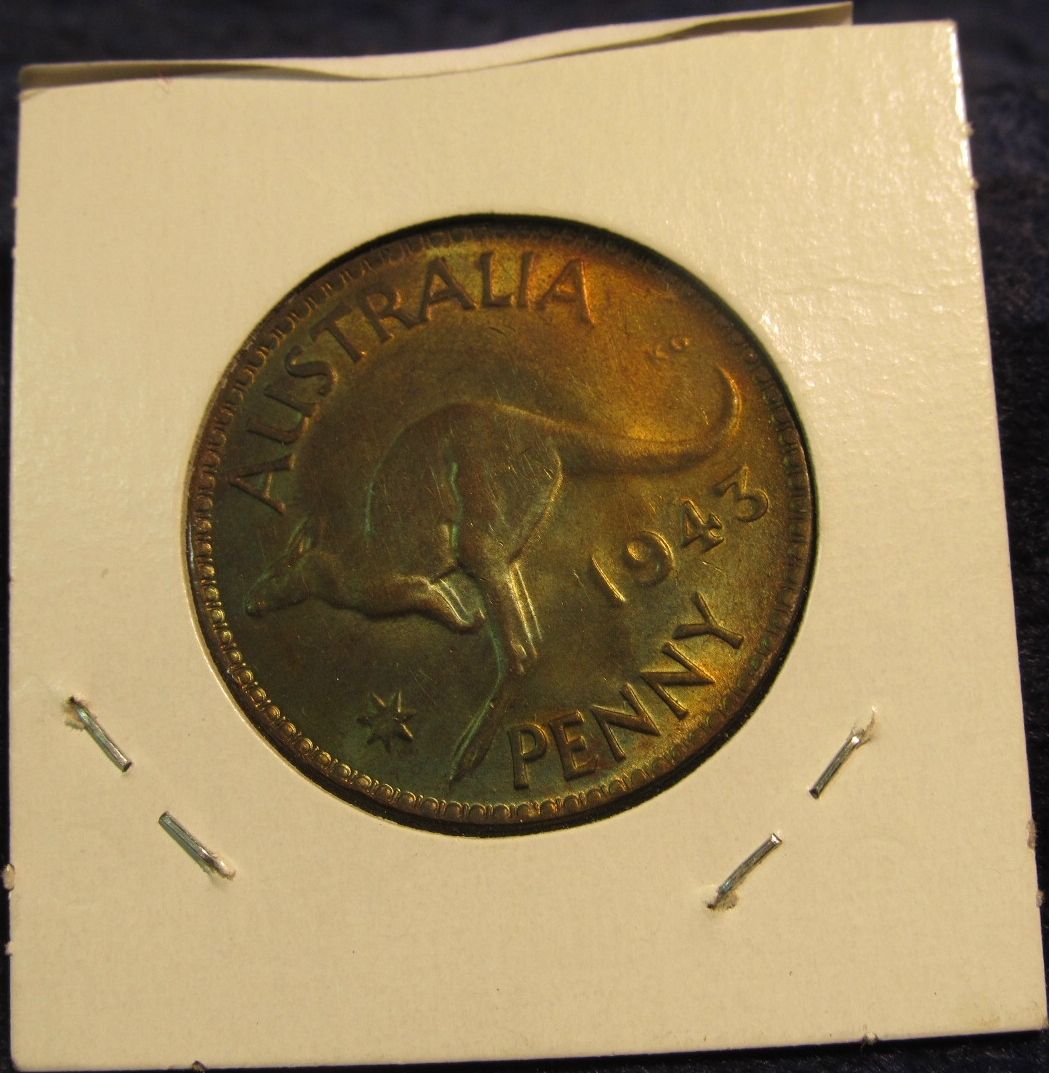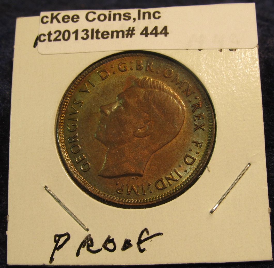 444. 1943 Australia Large Penny. Brilliant Red & Brown possibly a Proof. Holder marked as such. Very rare this nice. K & M catalog value $1,000.00.