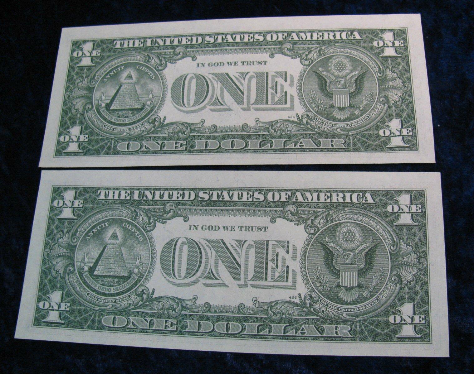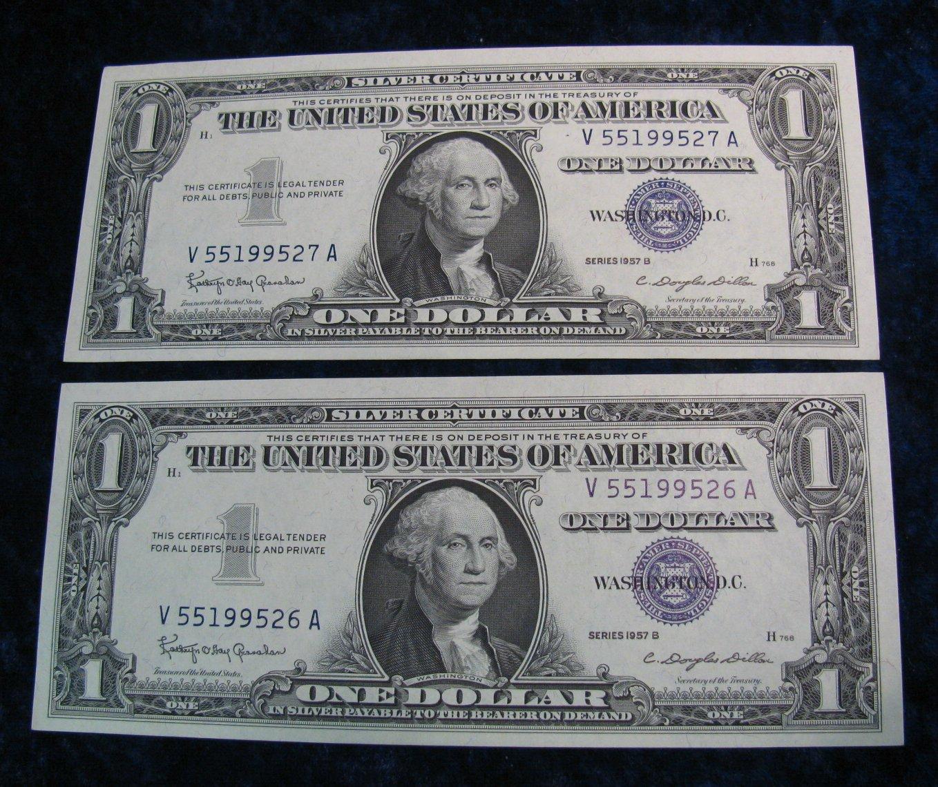 444. (2) Consecutive Serial Number Series 1957B $1 Silver Certificates. CU.