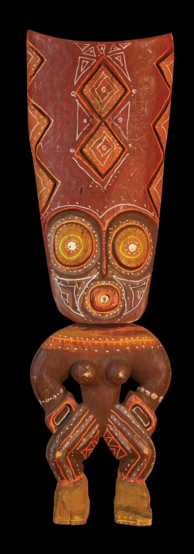 (1960s) This New Guinea wall figure maintains a nice patinated polychrome color treatment and has been a wall sample since the Philadelphia St. warehouse days. 30.5"x9.5". VG+ with typical wear.
