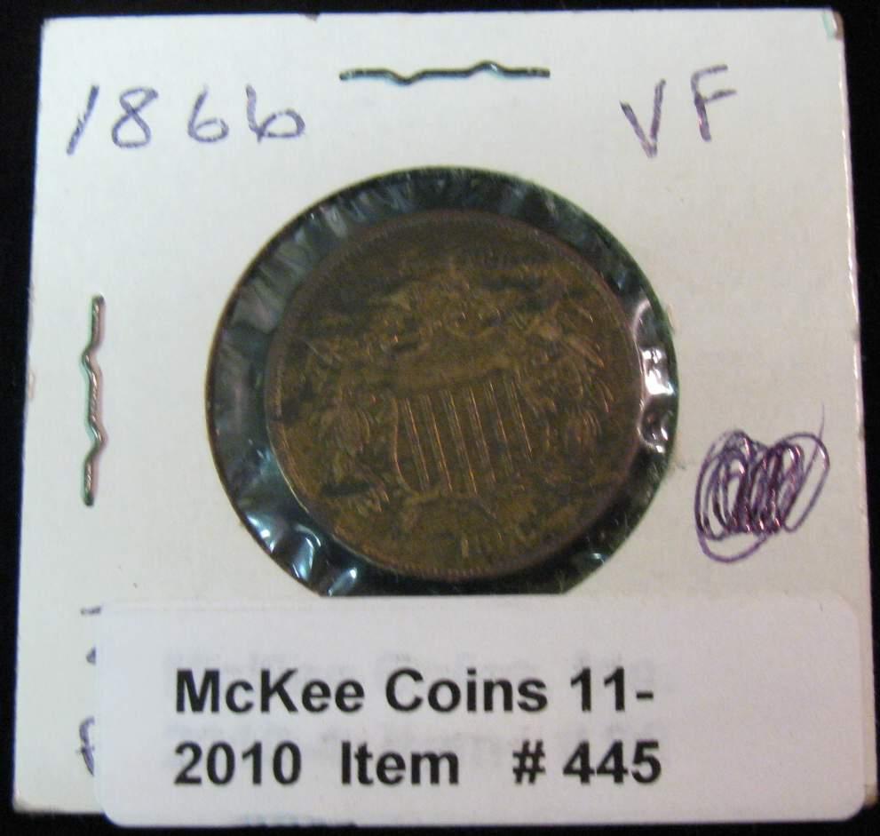 445. 1866 U.S. Two Cent Piece. VF. Some toning.