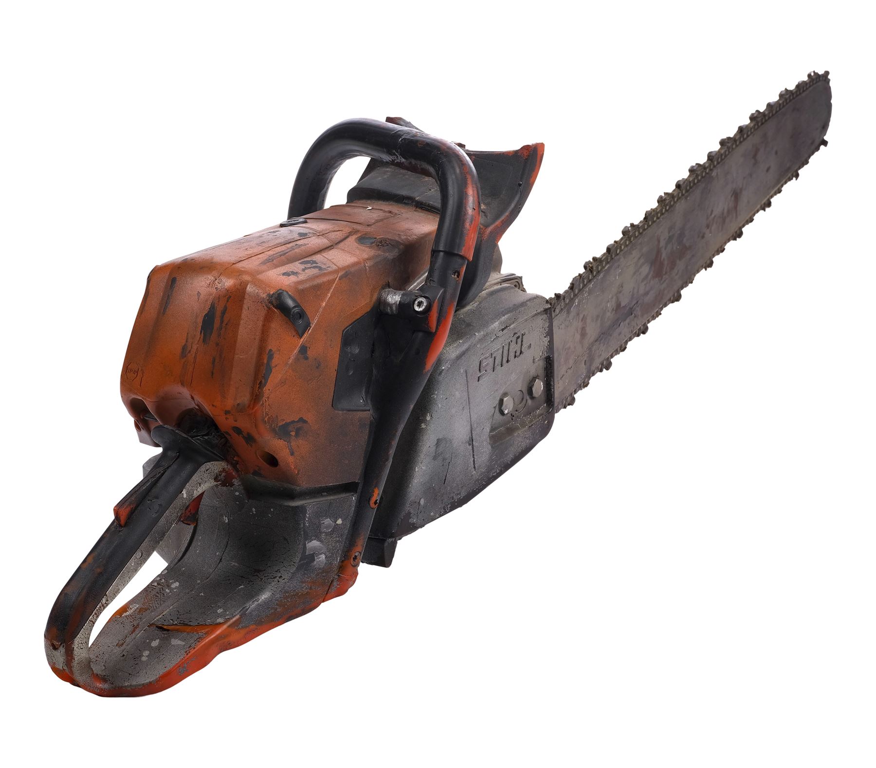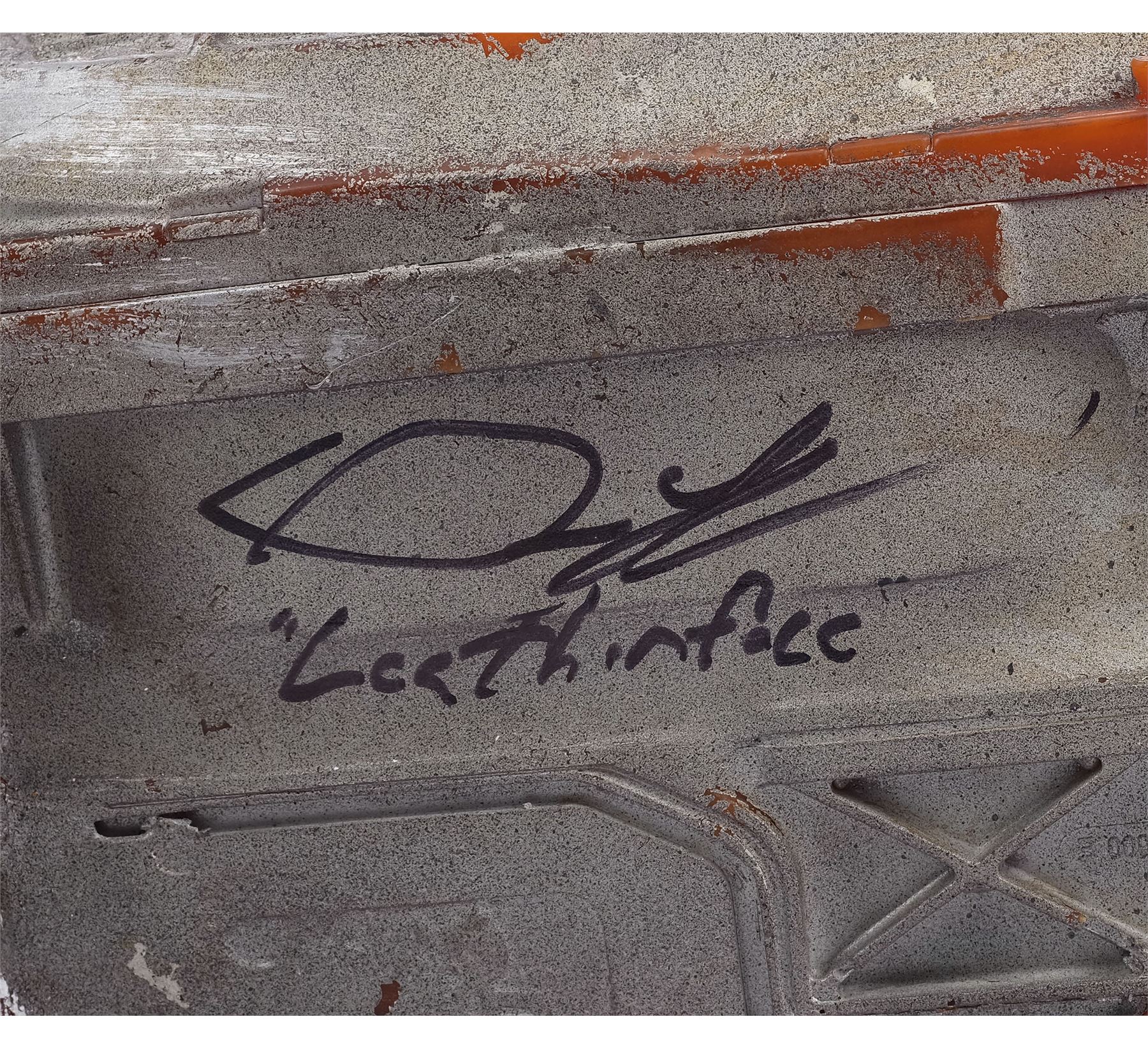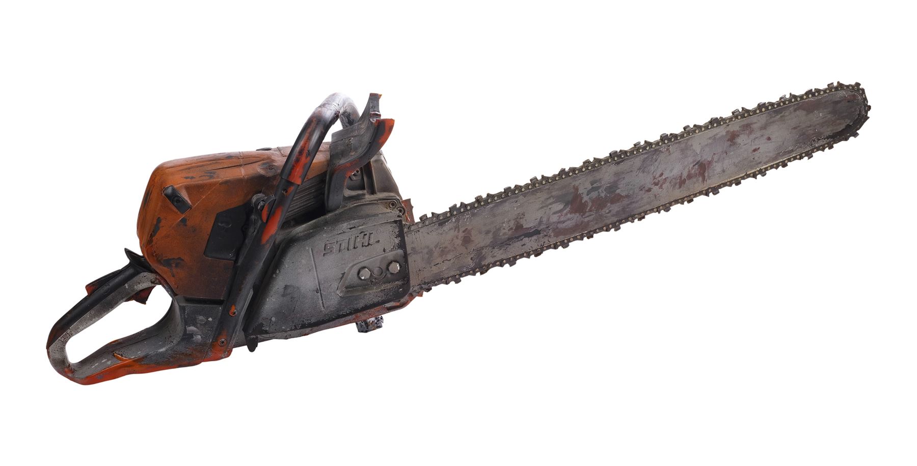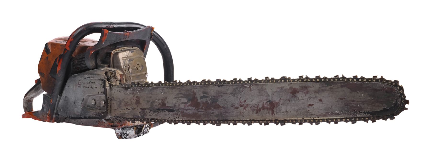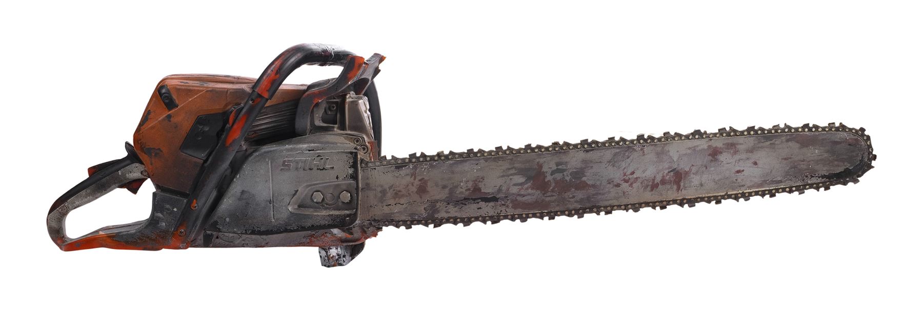 Molded from a Stihl chainsaw, this dense rubber stunt chainsaw is hand-painted orange, gray, and black to appear metallic and signed "Leatherface" in black marker by Yeager. It is applied throughout with splotchy blood and grime stains to appear well-used with the Stihl logo, ventilation ridges, and a "stop" emblem sculpted into the body. The rubber exhibits visible cracking around the grip, and some of the ridges exhibit tearing from handling and age. Dimensions: 45" x 11" x 12" (114.5 cm x 28 cm x 30.5 cm)