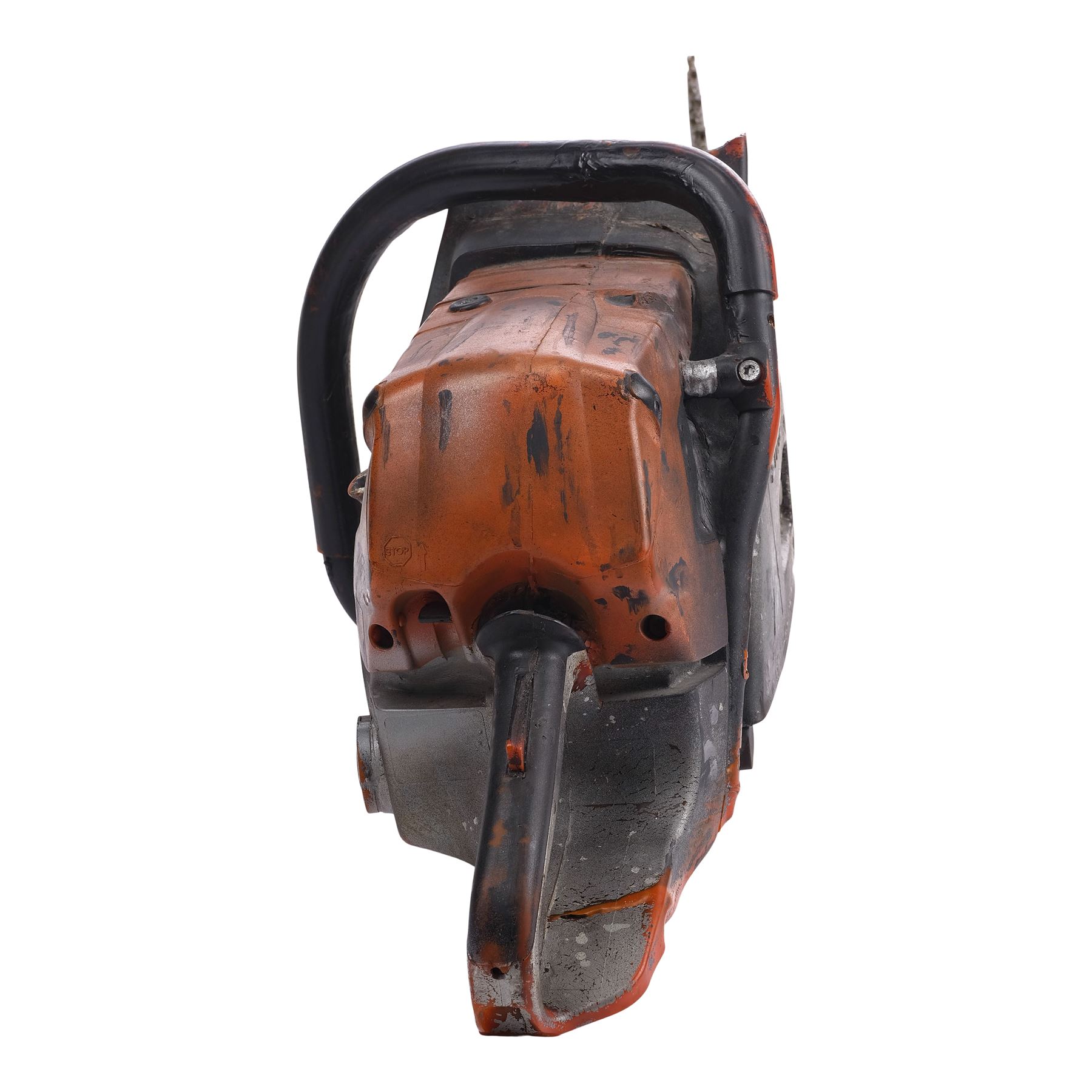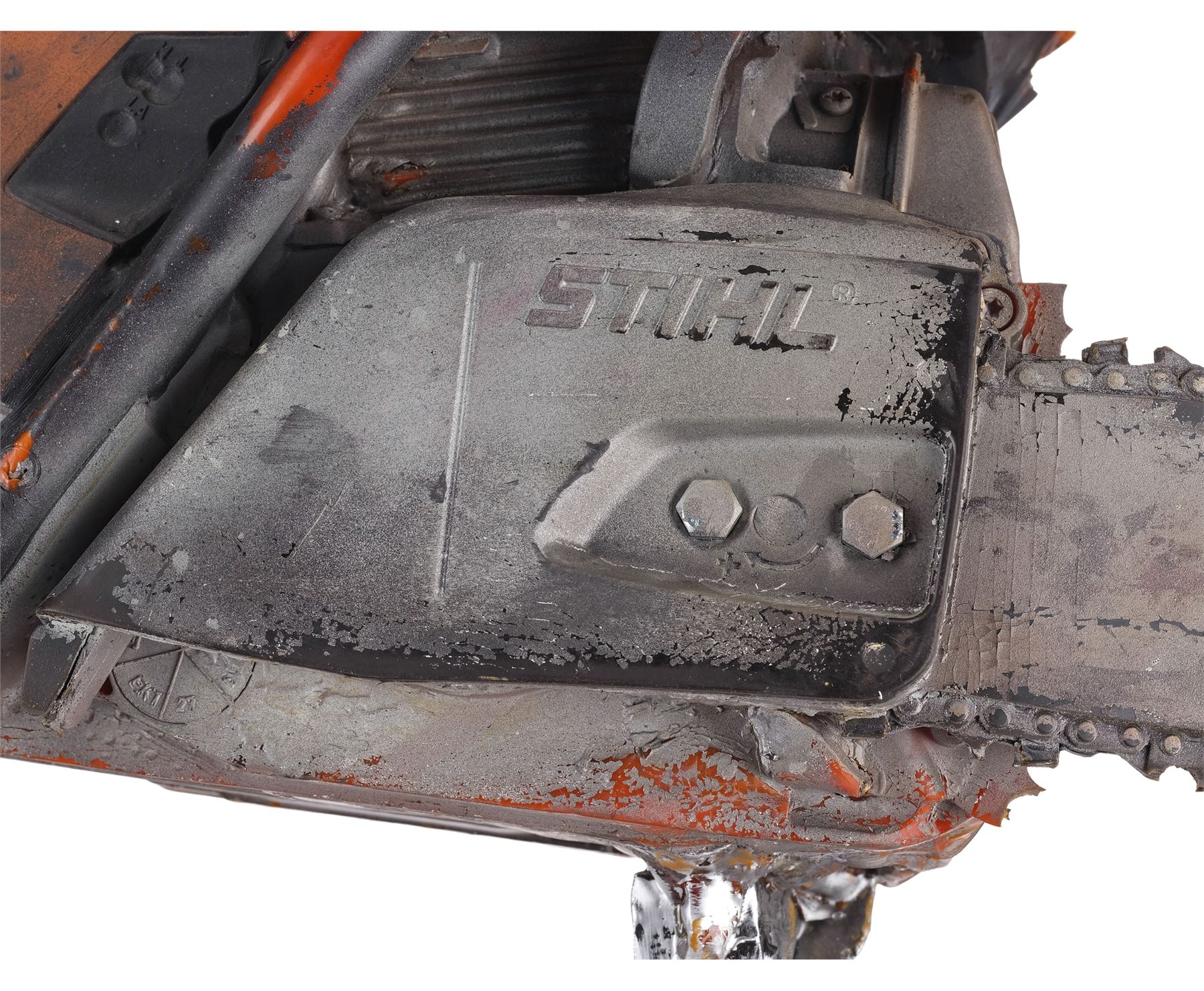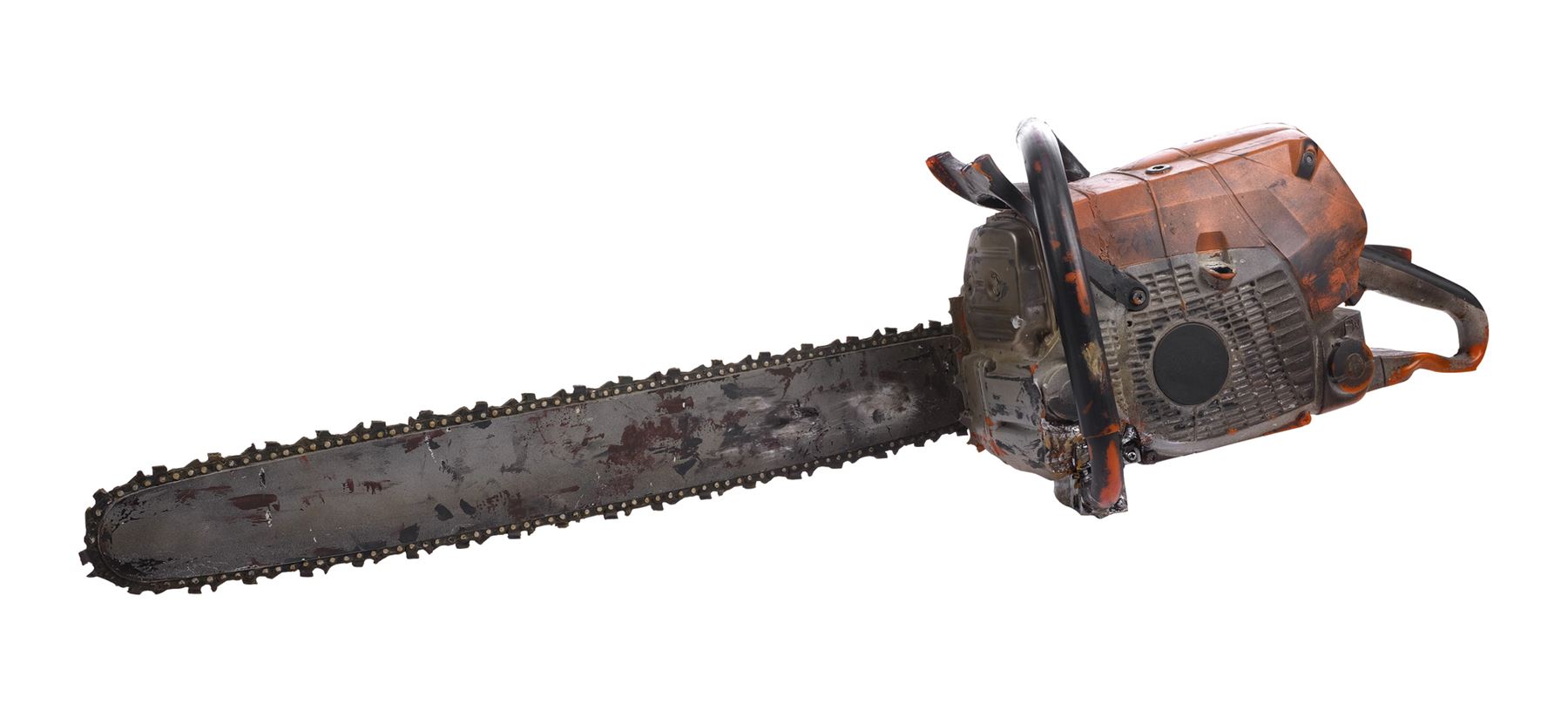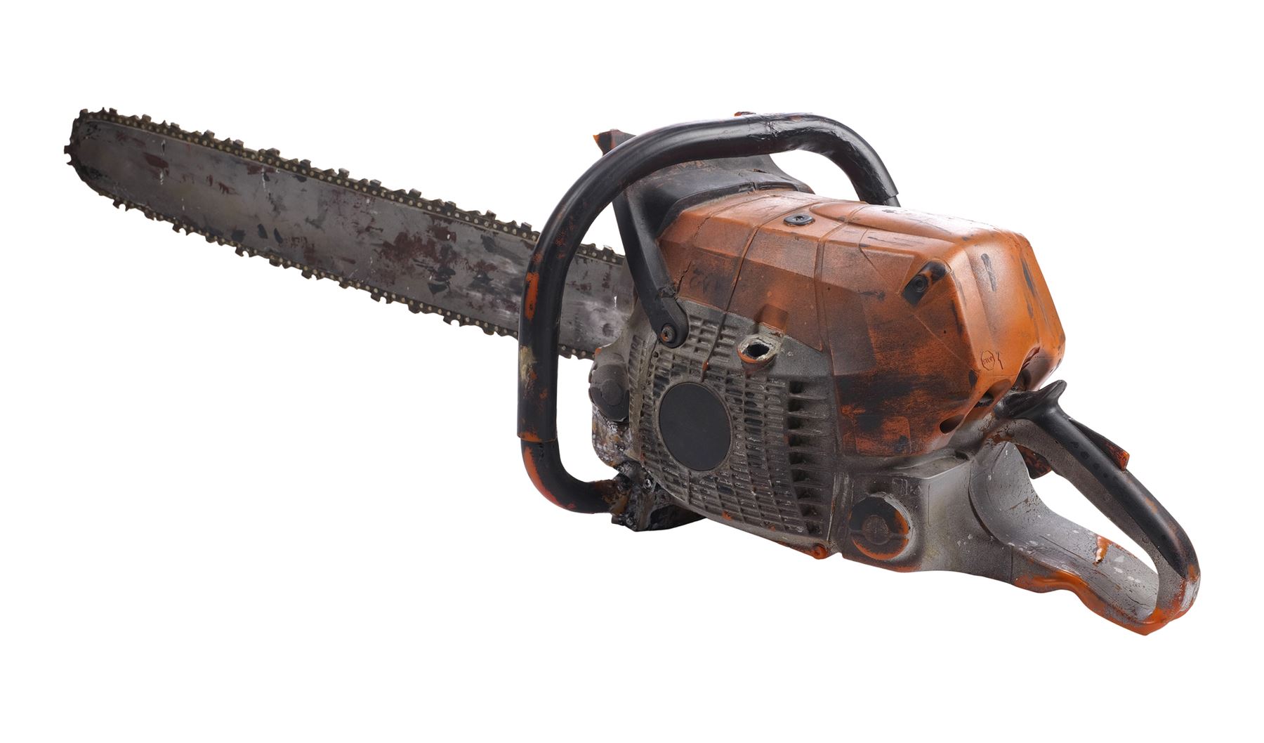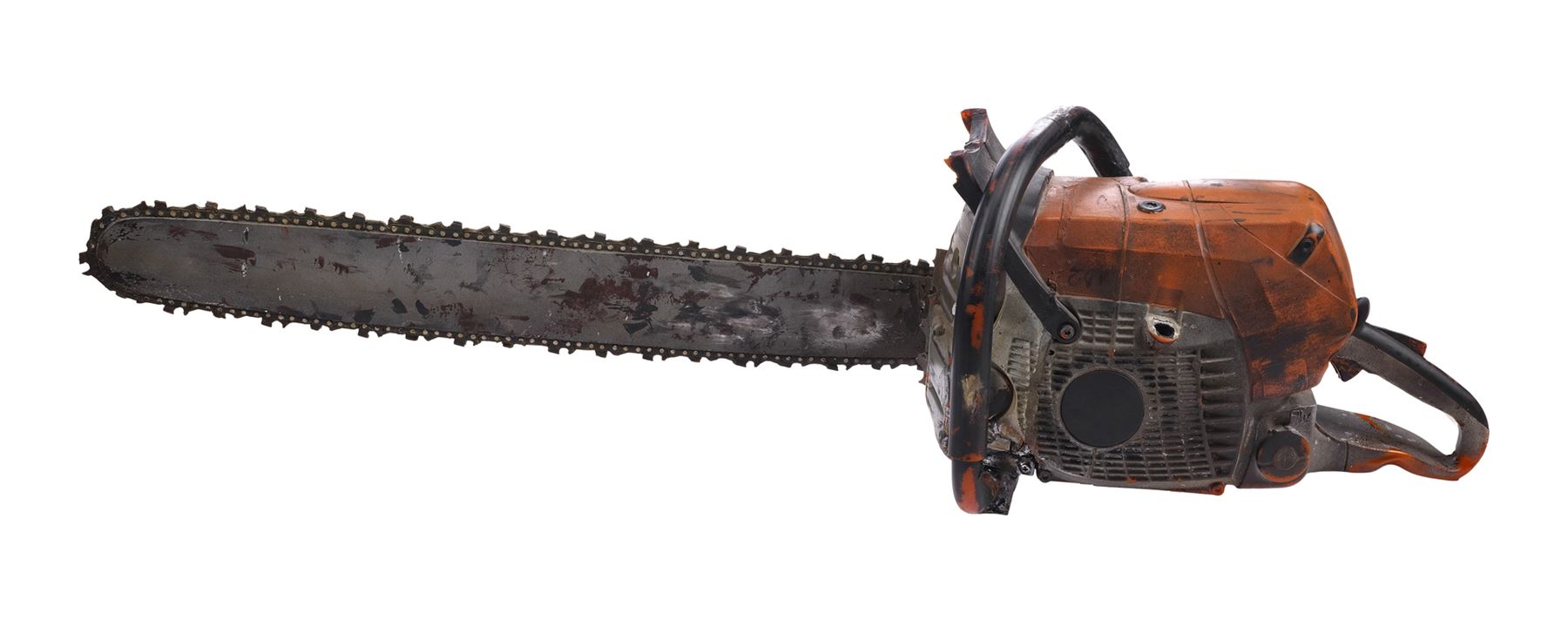 Molded from a Stihl chainsaw, this dense rubber stunt chainsaw is hand-painted orange, gray, and black to appear metallic and signed "Leatherface" in black marker by Yeager. It is applied throughout with splotchy blood and grime stains to appear well-used with the Stihl logo, ventilation ridges, and a "stop" emblem sculpted into the body. The rubber exhibits visible cracking around the grip, and some of the ridges exhibit tearing from handling and age. Dimensions: 45" x 11" x 12" (114.5 cm x 28 cm x 30.5 cm)