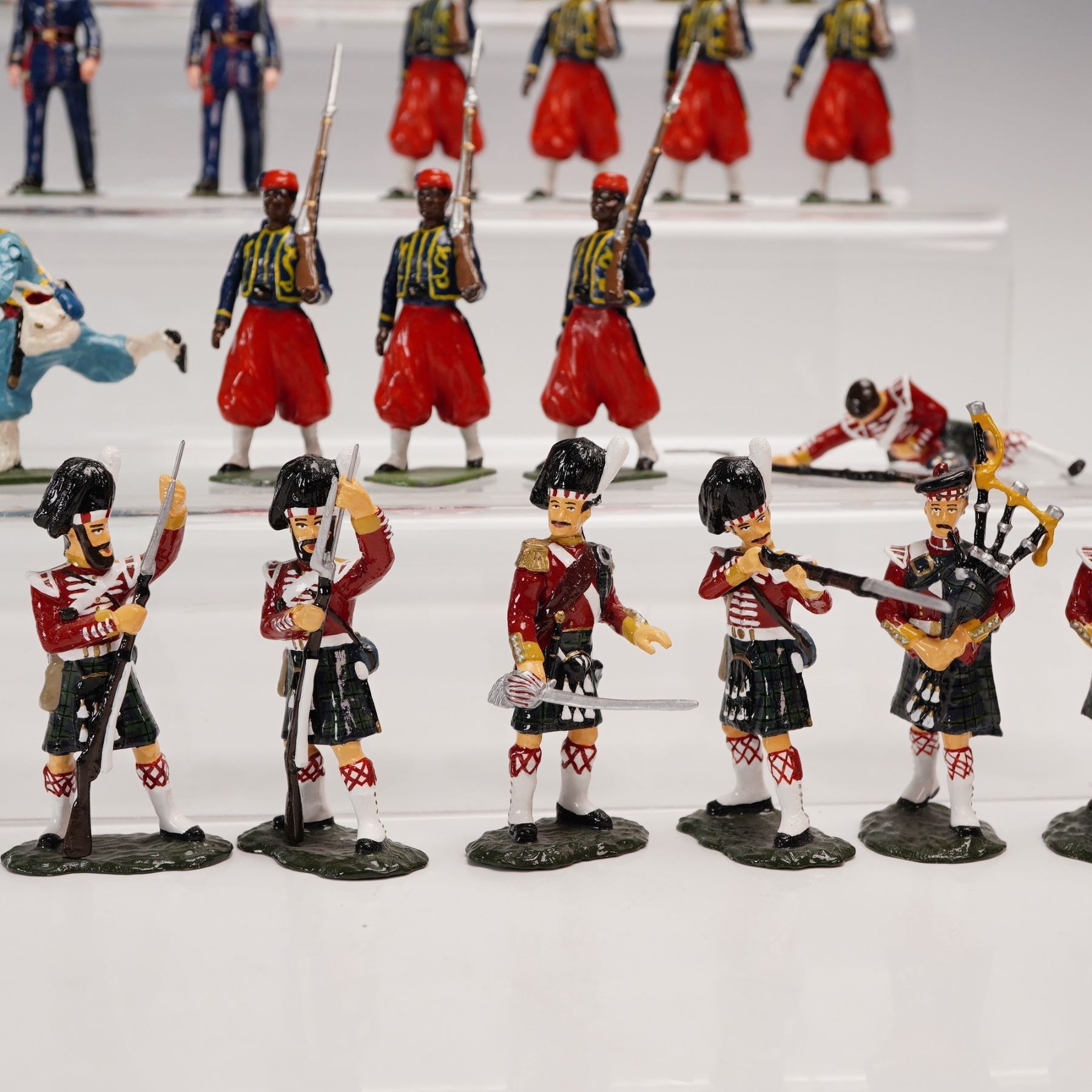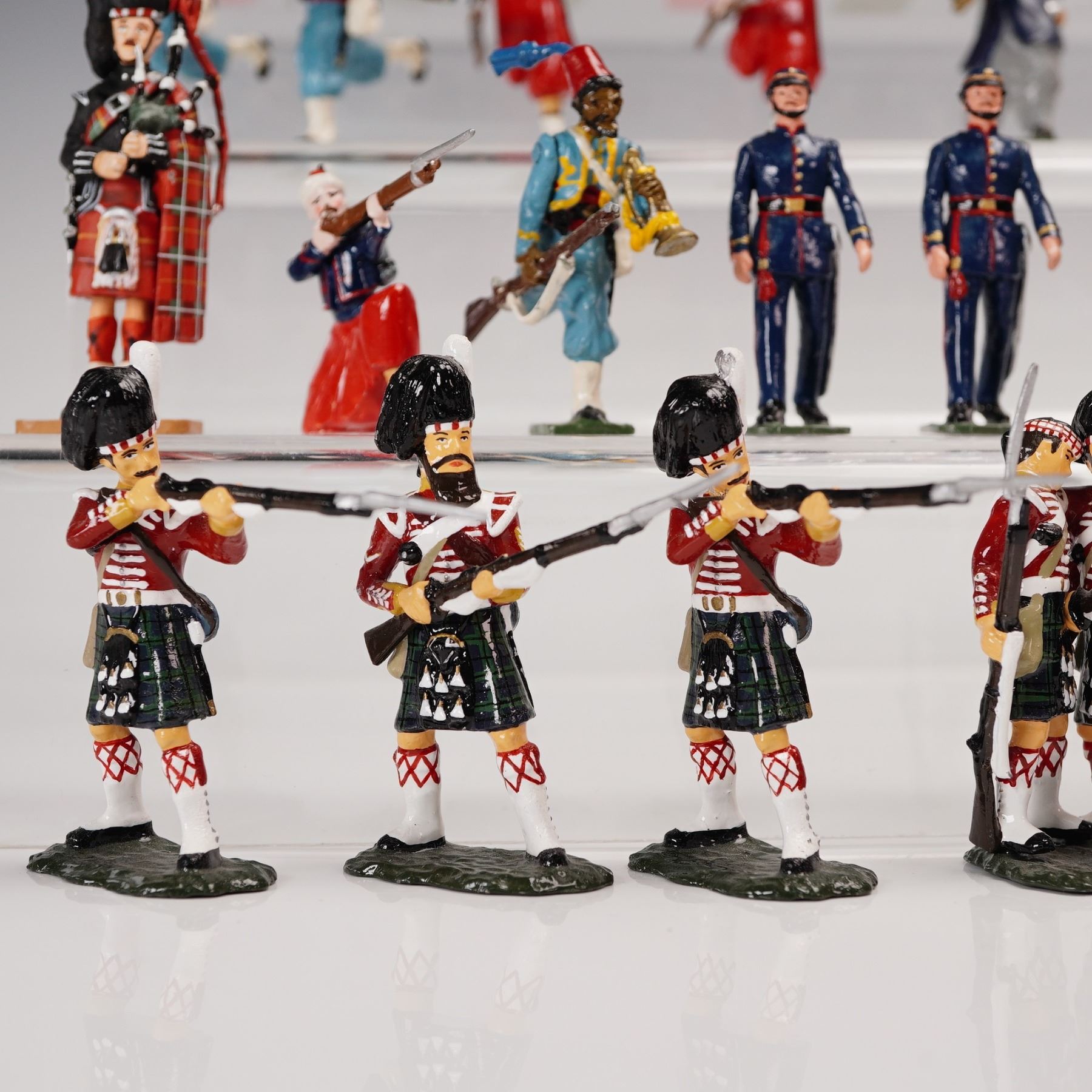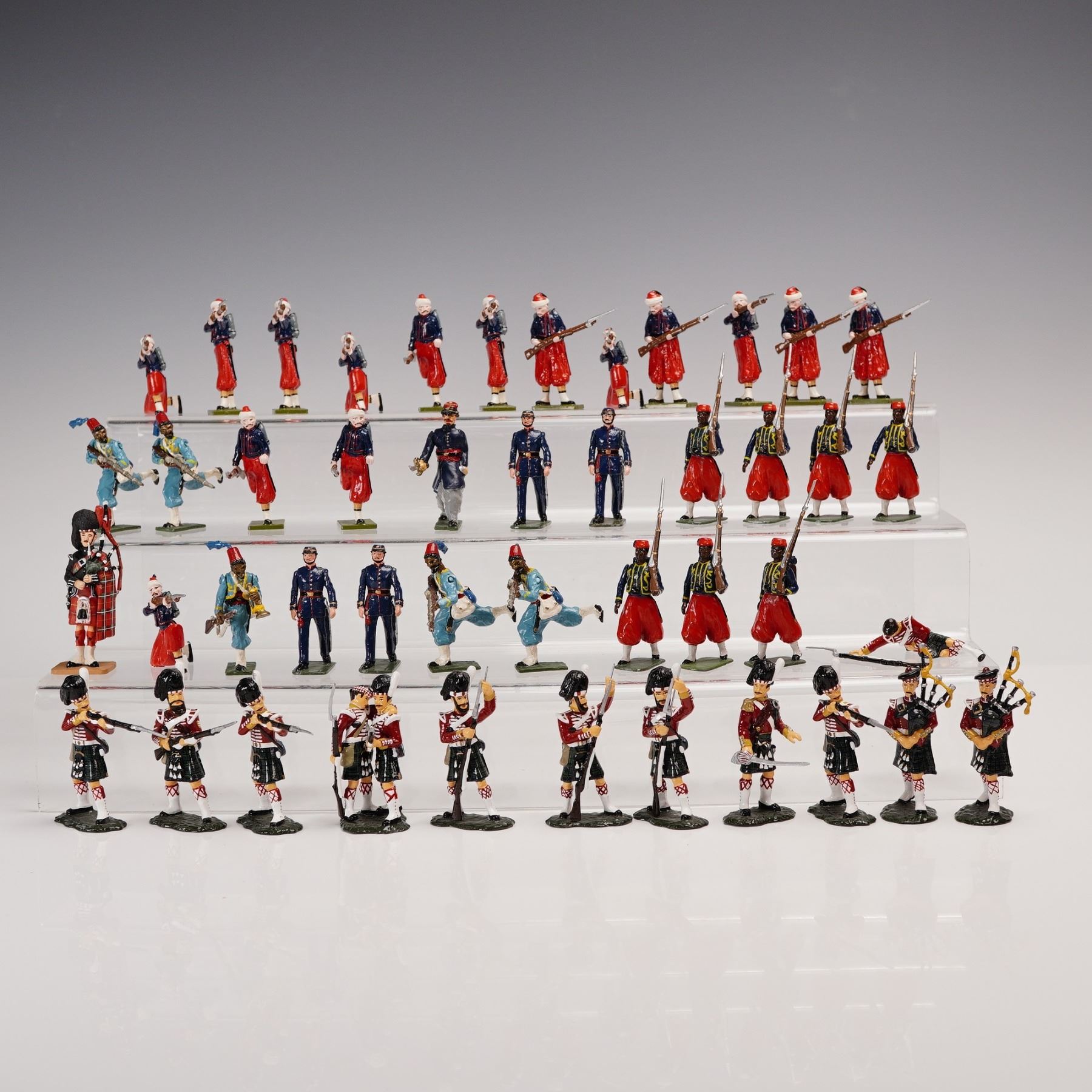 A colorful and varied collection of forty-four hand-painted metal toy soldiers, comprising an international array of military units spanning multiple eras and manufacturers. The group features French Zouaves in distinctive red trousers and short blue jackets, African and Middle Eastern colonial troops, Highland pipers and riflemen in full Scottish regalia, and other uniformed figures in marching or action poses. Several figures bear marks from noted makers including Del Prado, Stonecastle, and FF, while others remain unmarked but are consistent in scale and paint style, likely from similar contemporary makers. All are cast in approximately 54¯mm scale and finished in gloss or semi-gloss enamel. This eye-catching assemblage offers a spirited mix of national uniforms and dramatic costuming, ideal for collectors of 19th and 20th century military miniatures or for display in dioramas of international conflict and parade formations.