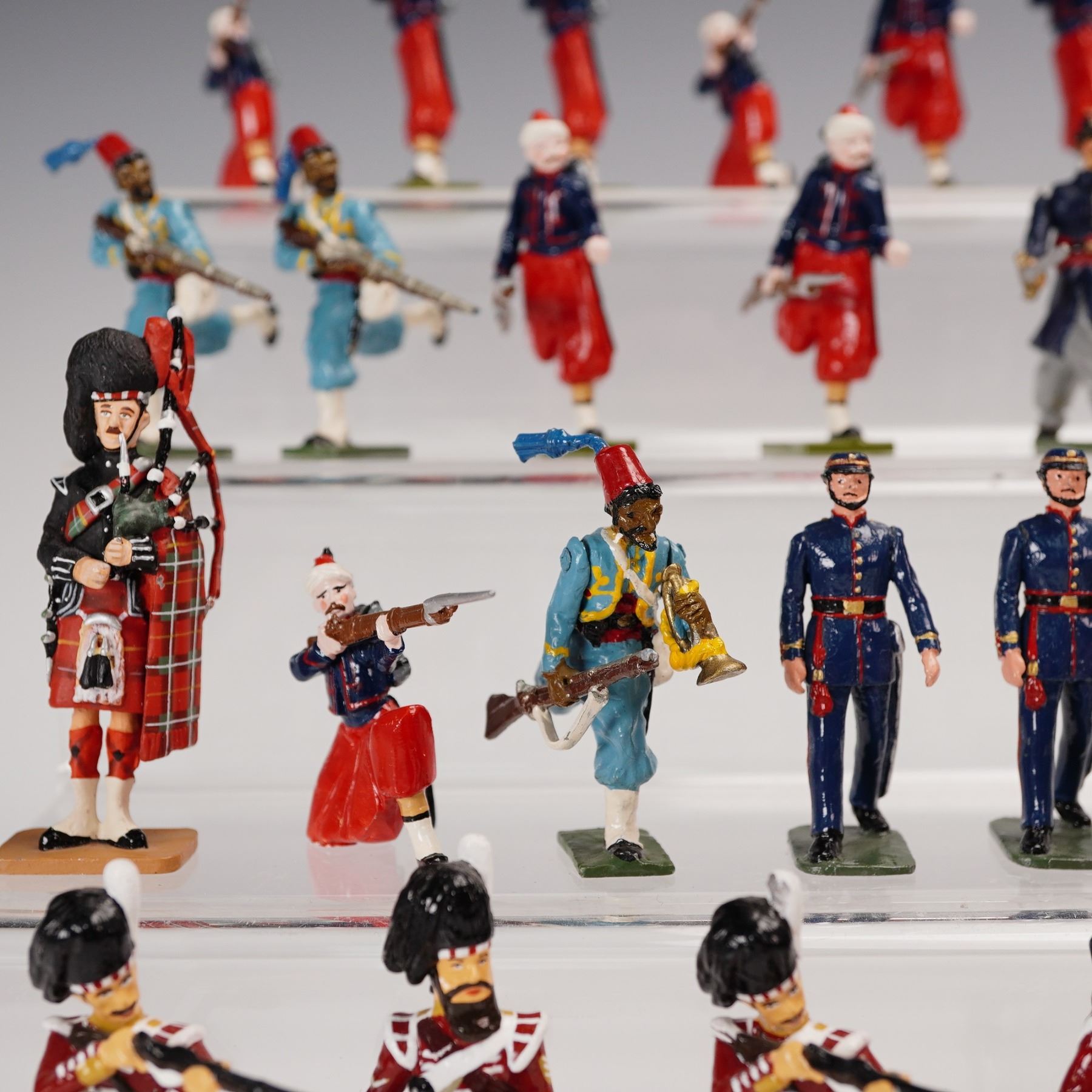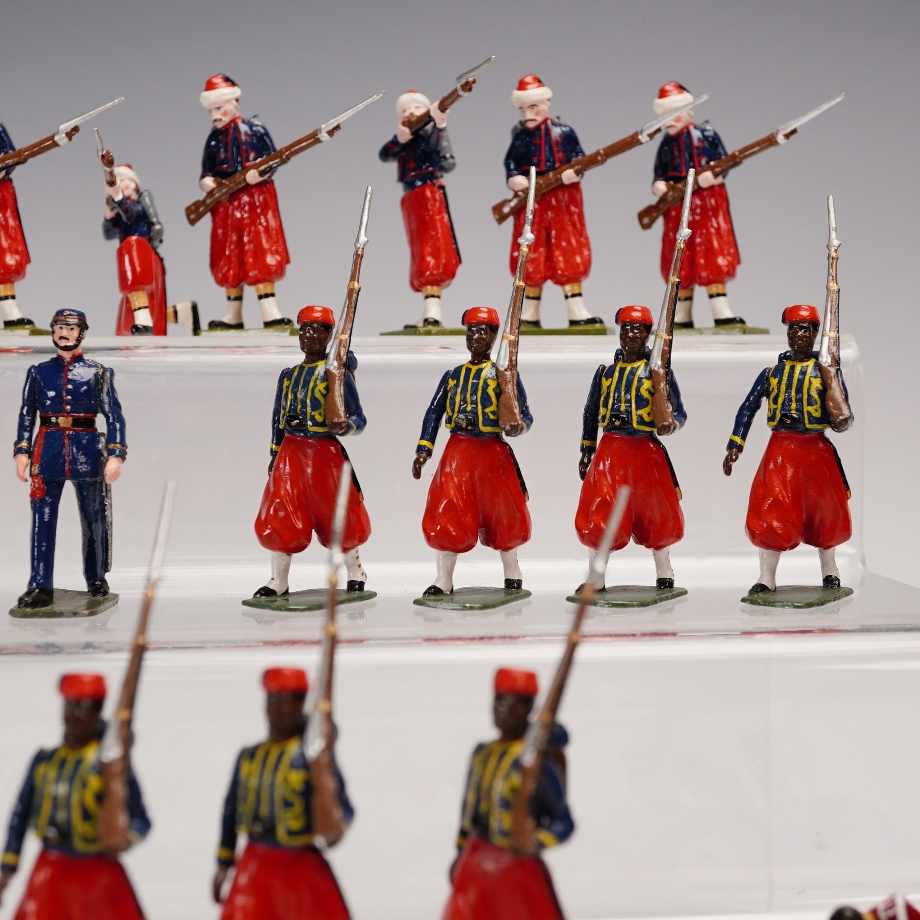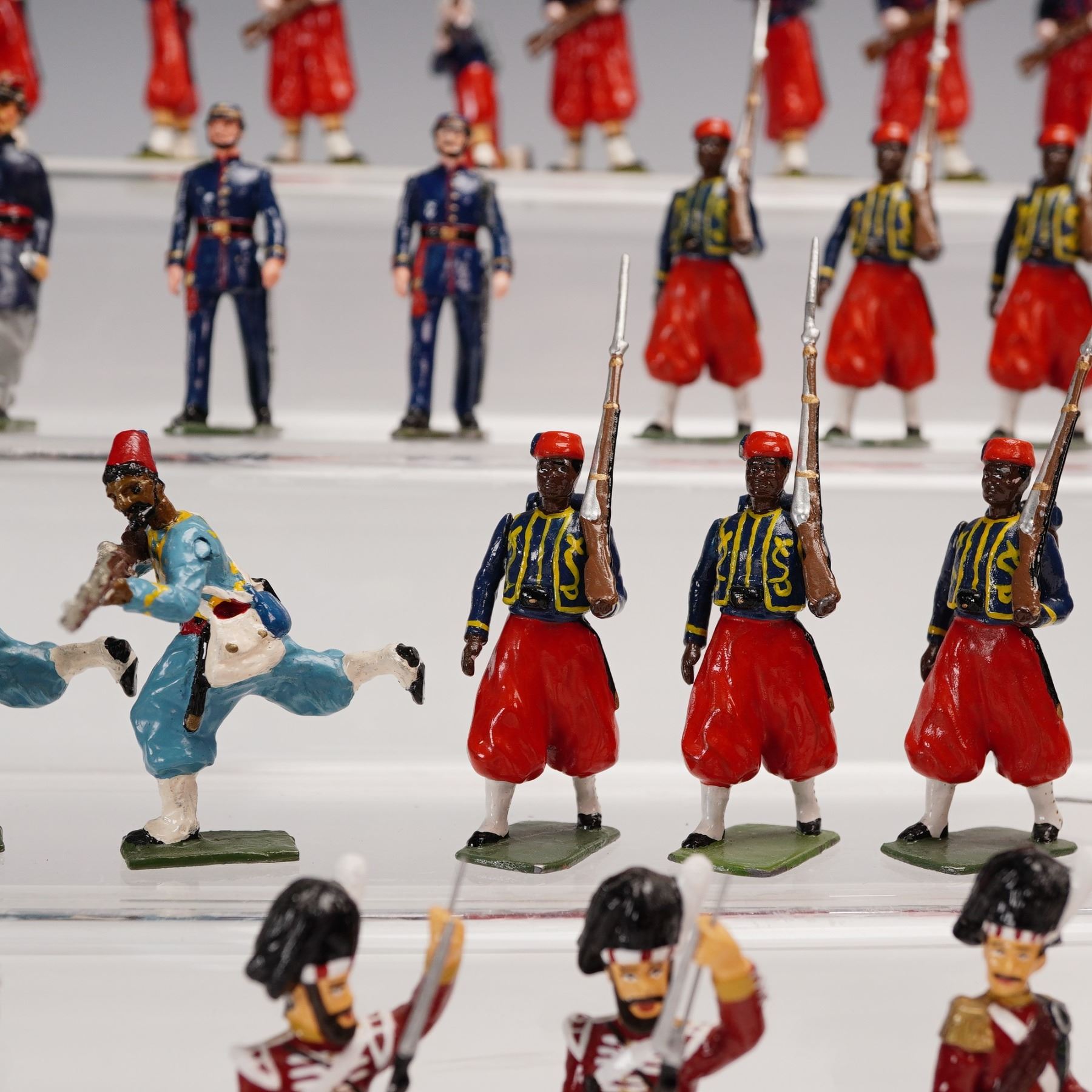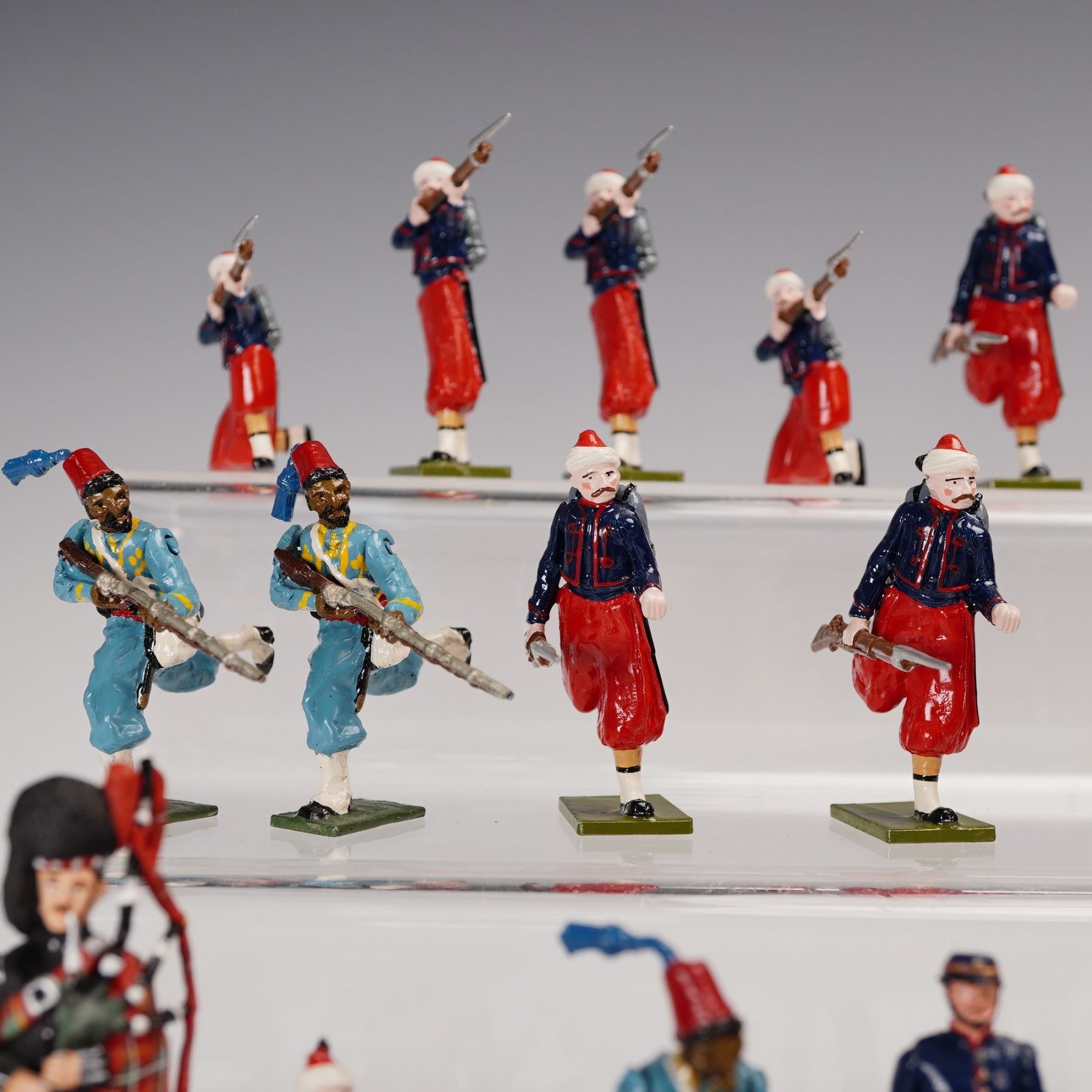 A colorful and varied collection of forty-four hand-painted metal toy soldiers, comprising an international array of military units spanning multiple eras and manufacturers. The group features French Zouaves in distinctive red trousers and short blue jackets, African and Middle Eastern colonial troops, Highland pipers and riflemen in full Scottish regalia, and other uniformed figures in marching or action poses. Several figures bear marks from noted makers including Del Prado, Stonecastle, and FF, while others remain unmarked but are consistent in scale and paint style, likely from similar contemporary makers. All are cast in approximately 54¯mm scale and finished in gloss or semi-gloss enamel. This eye-catching assemblage offers a spirited mix of national uniforms and dramatic costuming, ideal for collectors of 19th and 20th century military miniatures or for display in dioramas of international conflict and parade formations.