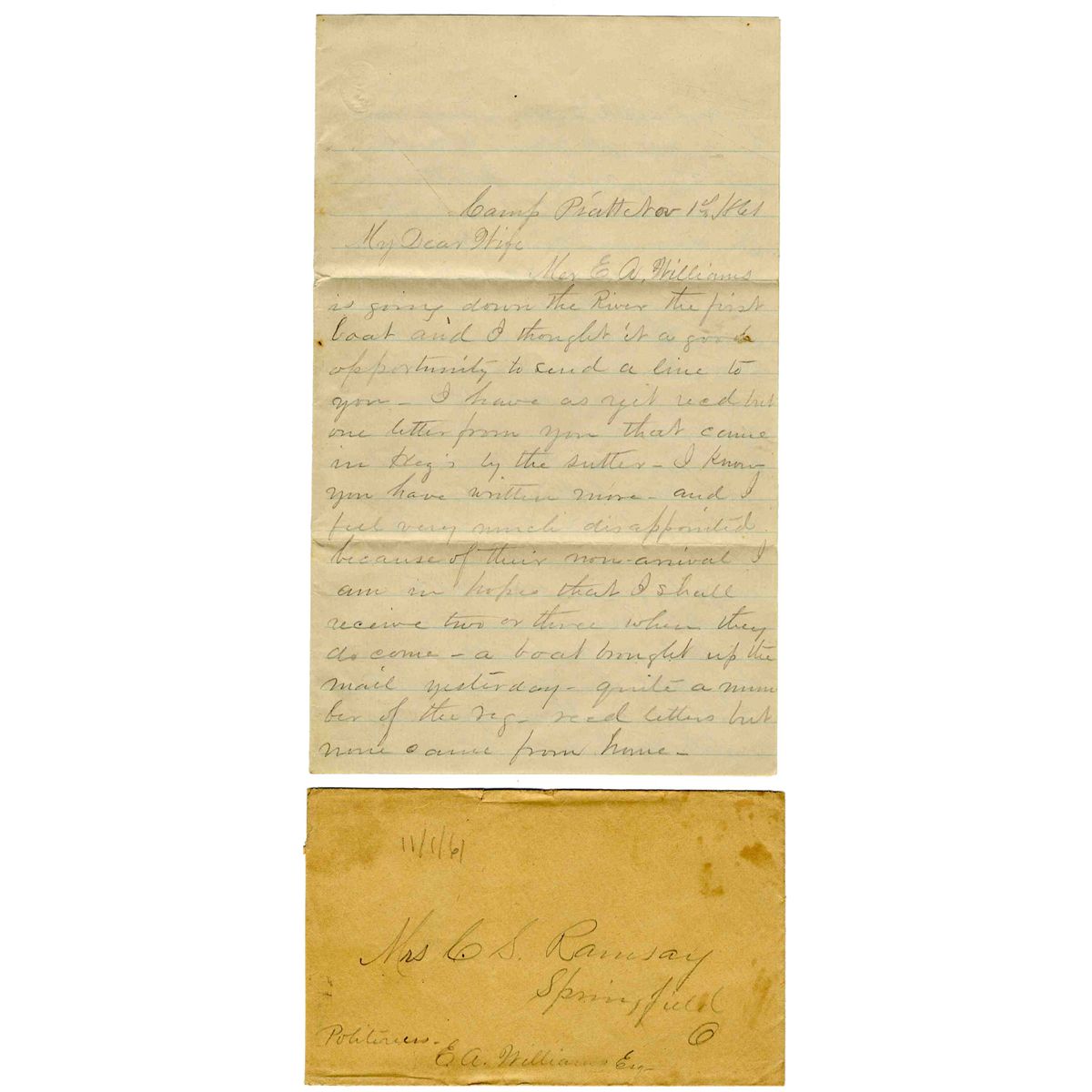 4pp. letter from Charles S. Ramsay of the 44th Ohio Infantry Band. Accompanied by cover. Written in pencil and datelined ''Camp Piatt Nov 1st 1861,'' letter reads in part: ''…Capt Cummings' Co is on picket or was last night they will be in this afternoon. I slept in their quarters last night and took charge of them night before last. The long roll was beaten about midnight and soon the camp was in arms. the alarm was caused by the firing of the pickets. One of the companies were out scouting and came across the cavalry Co that had been circulating around this section and fired up on them the pickets heard the firing and gave the alarm. The scouts killed one horse and captured another but did not succeed in capturing any of the Rebles. The Zouaves were the first out and went through the manual of arms before any other Co. came on the ground. The colonel order the men to go to their quarters but to keep their accoutrements on and be ready to fall in at a moments notice…'' The 44th Ohio Infantry served primarily in Tennessee, West Virginia and Kentucky. The regiment saw action at Lewisburg and participated in a rout of Confederate forces at Dutton's Hill. Charles S. Ramsay mustered into service on 8 October 1861 and mustered out on 8 October 1862 at Covington, Kentucky. Letter measures 5'' x 8''. Fine condition.